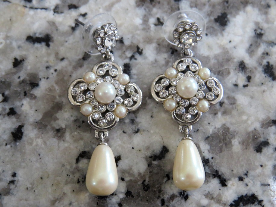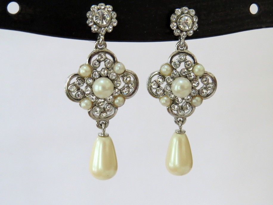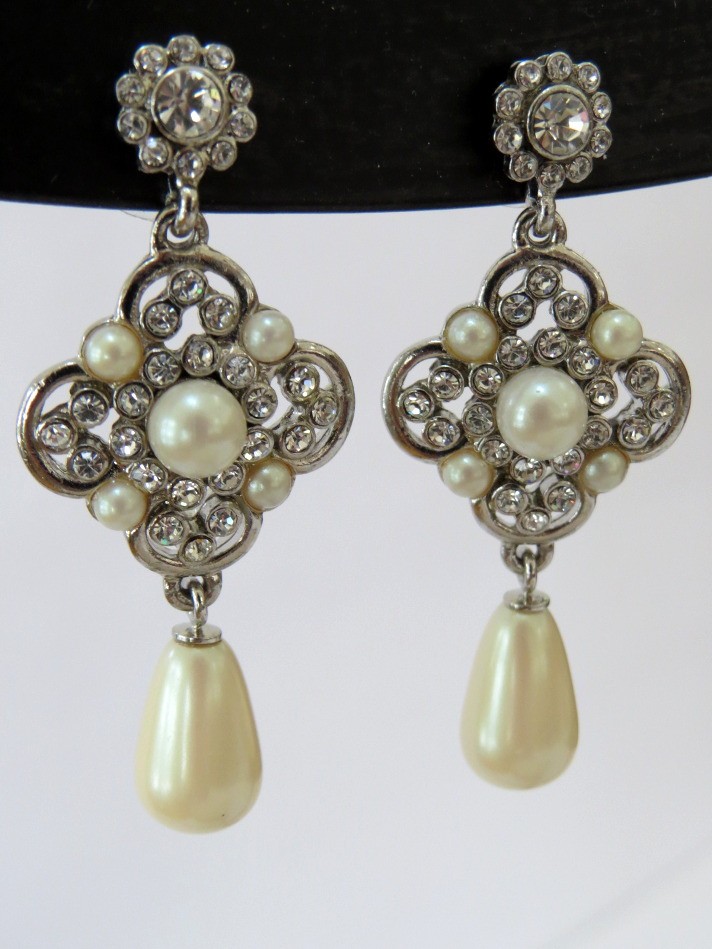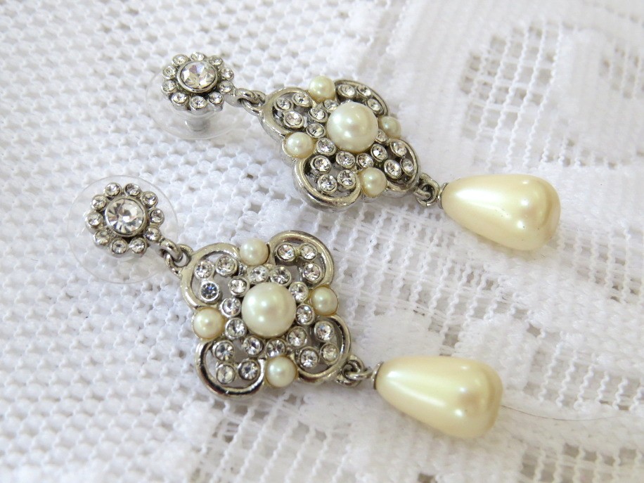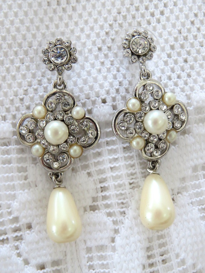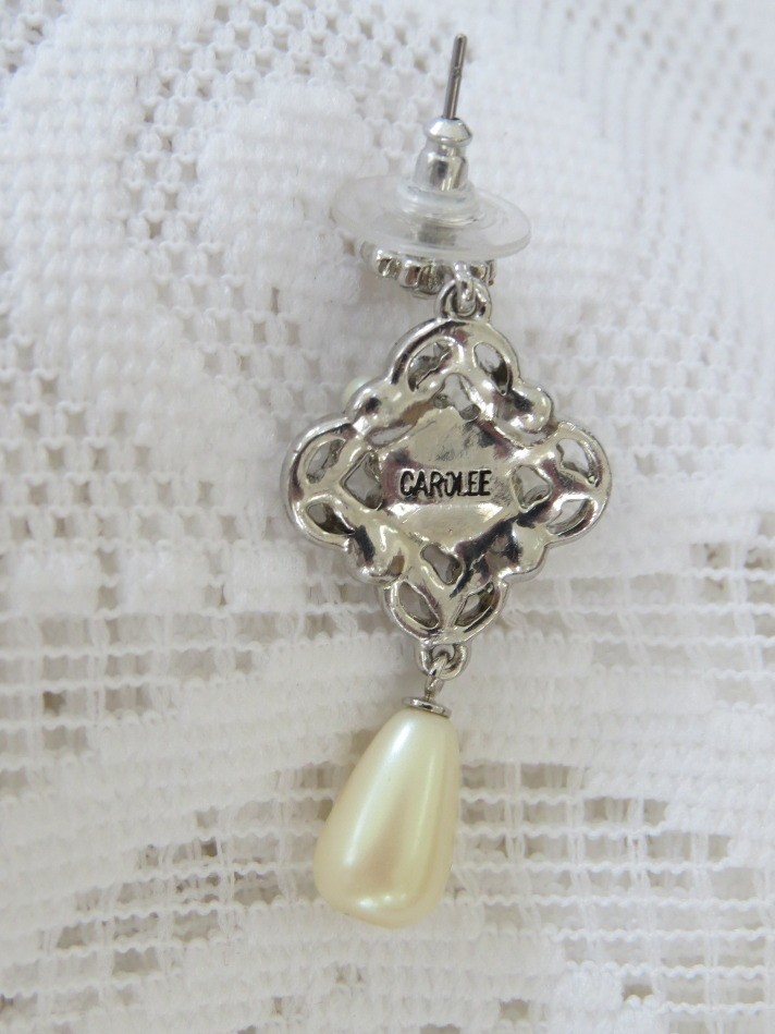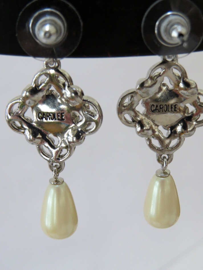 Dazzling iridescent rhinestones in this classy Carolee design will add sparkle to any outfit. Faux pearls provide a classical design to these 1 3/4" long stud dangle earrings. Earrings are marked Carolee on the backside.