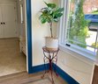 Decorative faux fiddle tree plant on metal scroll design stand.