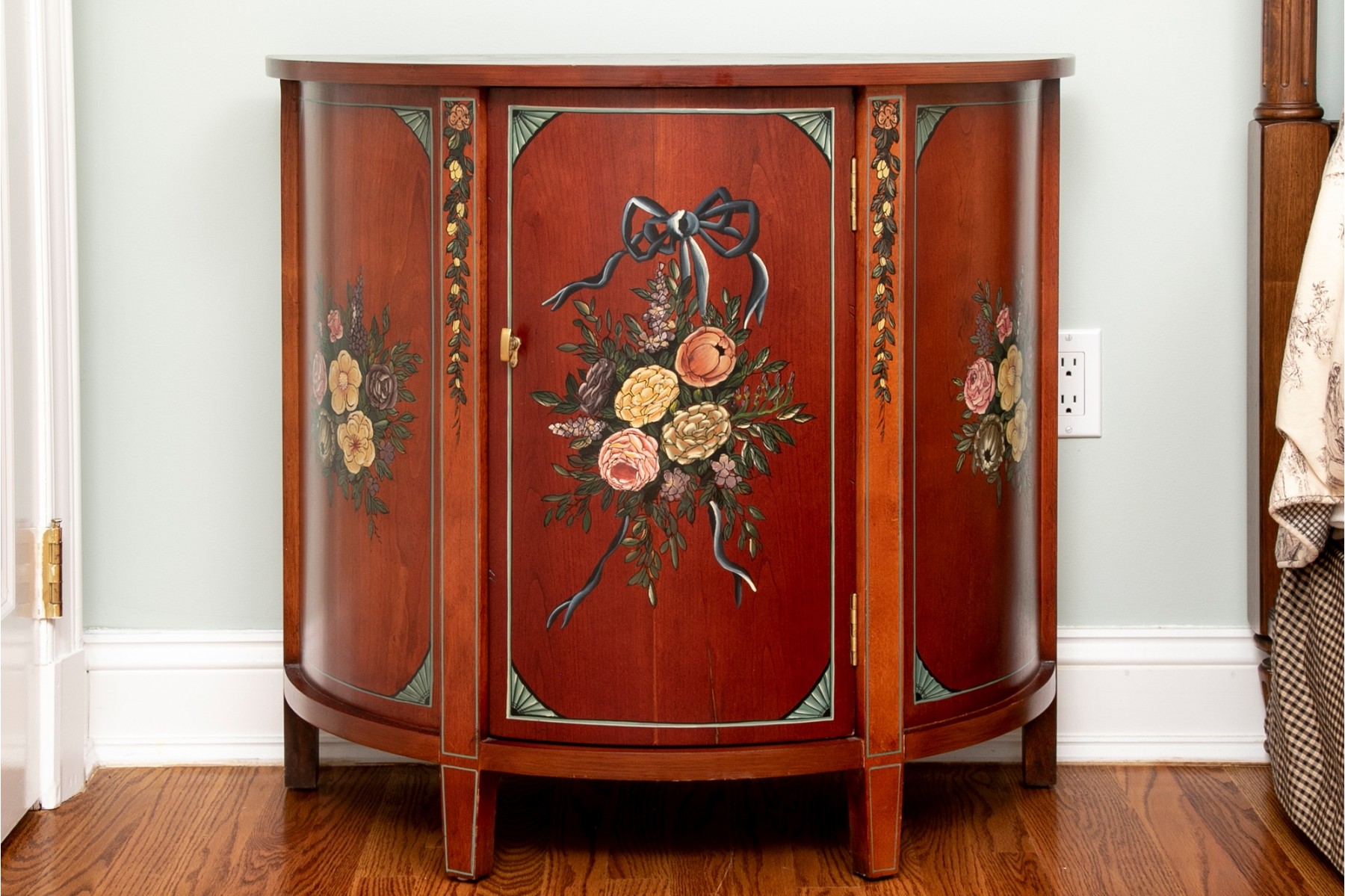 Perfect for an entryway, side table or use as bar server with pretty floral sprays throughout. Single door opens to a two shelf interior.