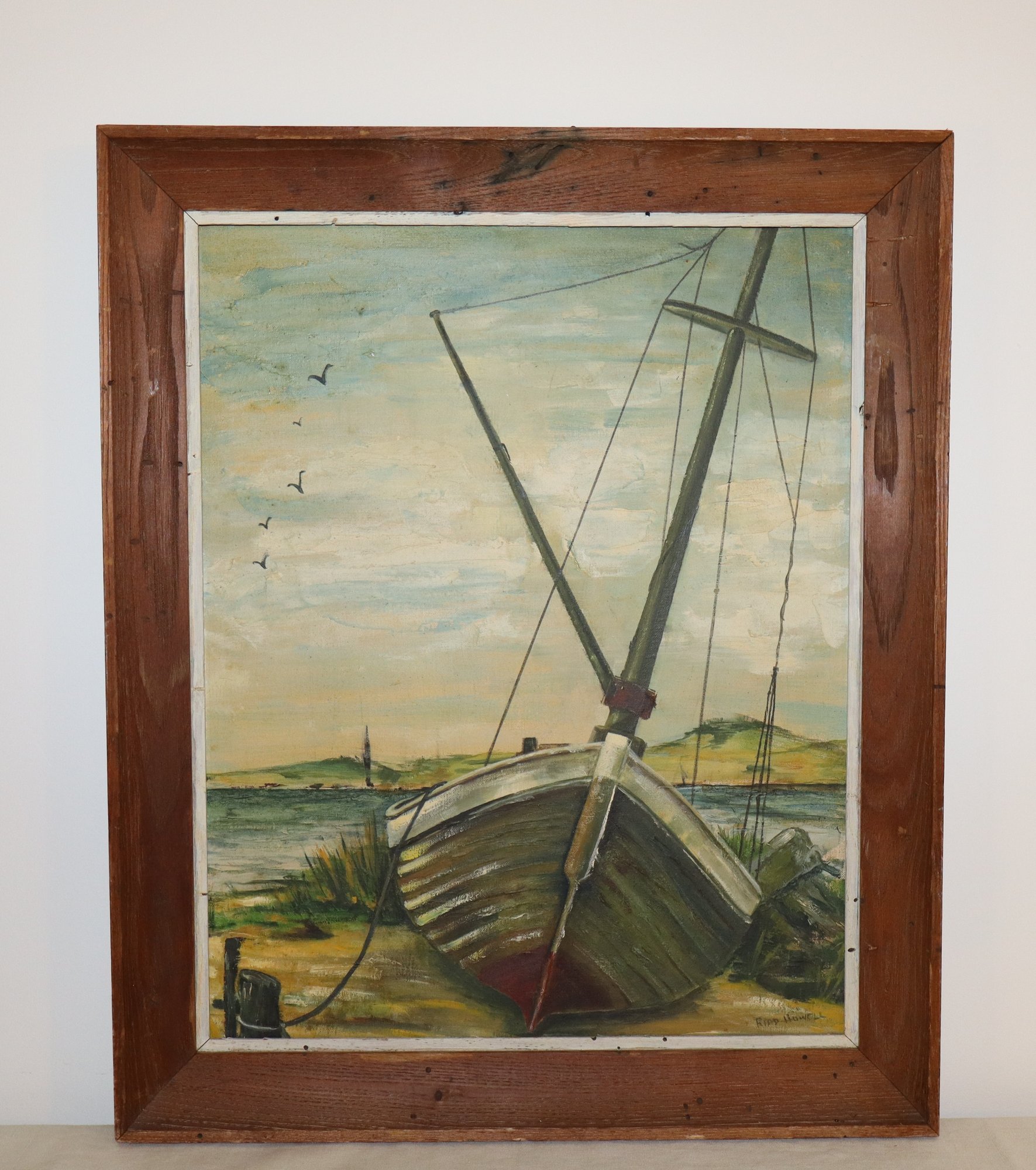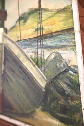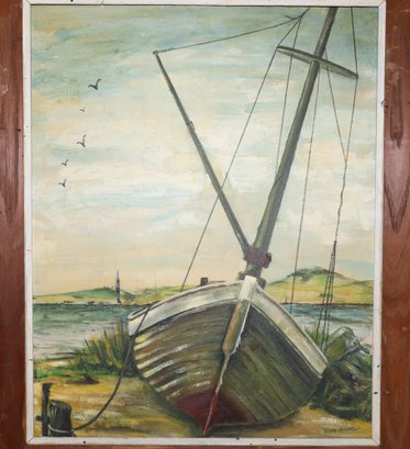 Depicts a beached fishing boat at low tide
