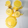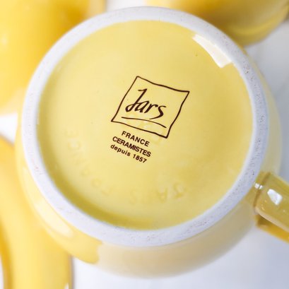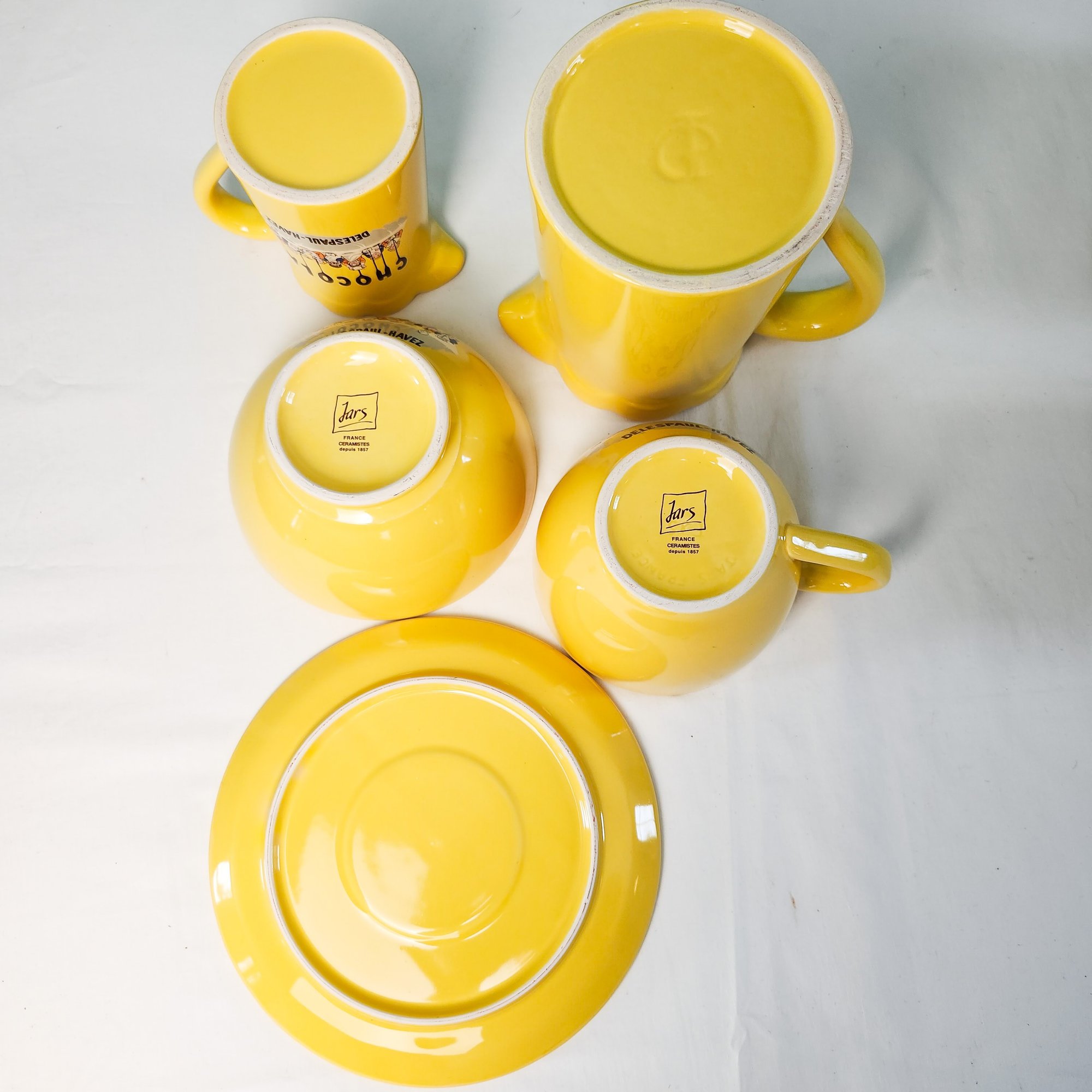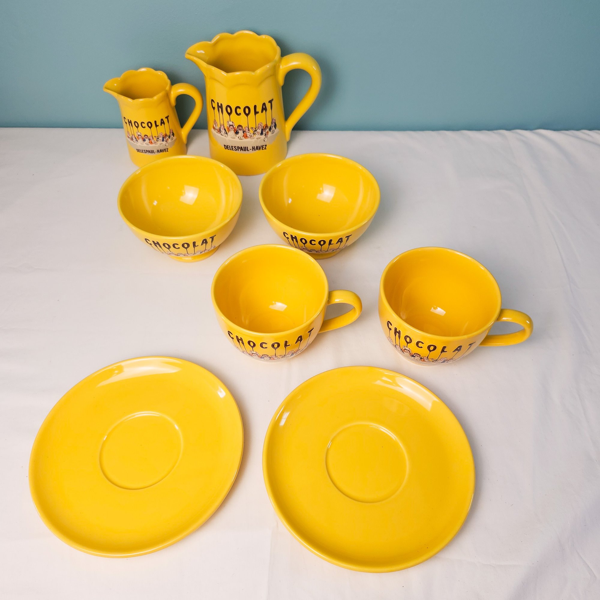 Pretty yellow chocolat set for two made in France by Delespaul-Havez. Includes two bowls, two plates, two mugs, and two pitchers.