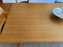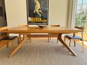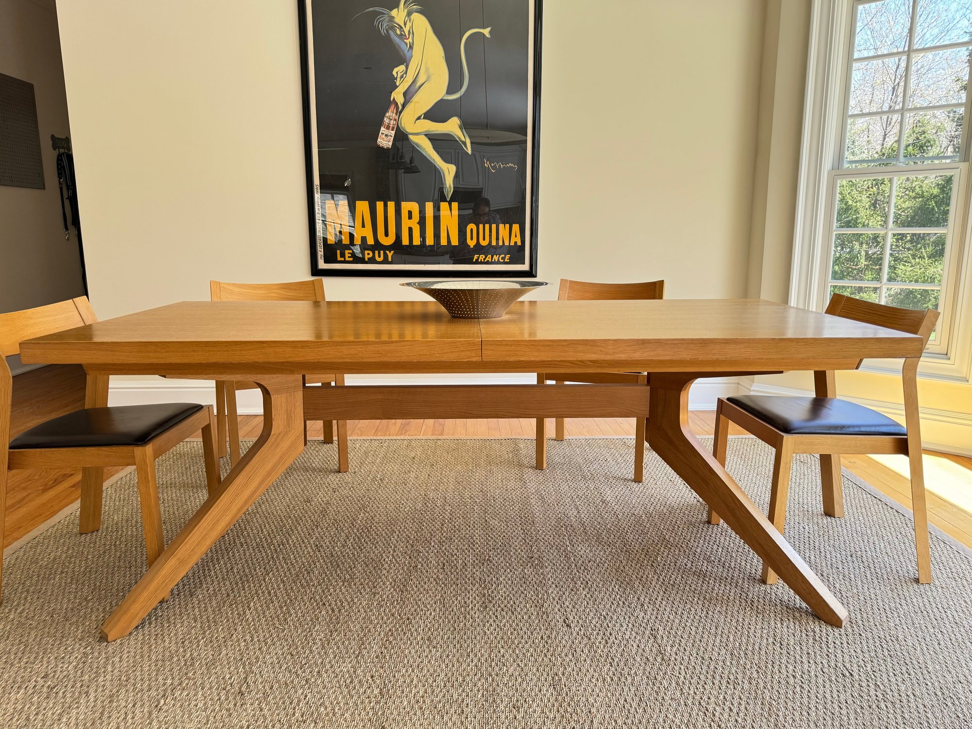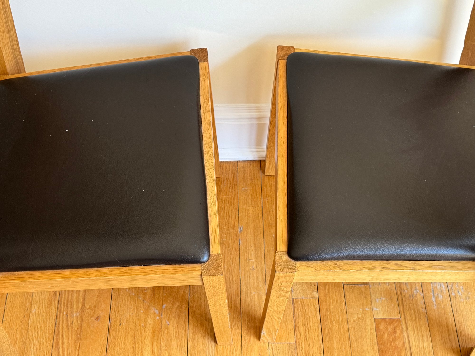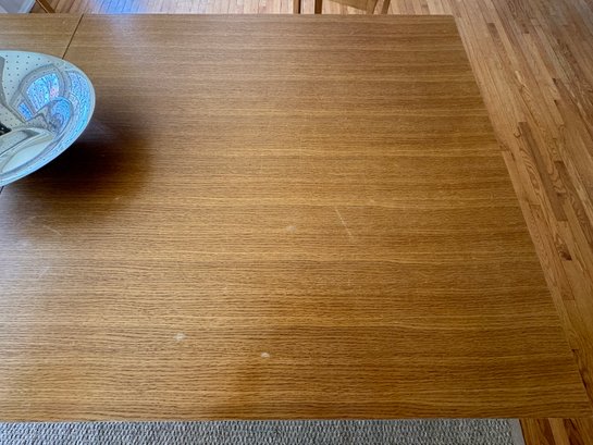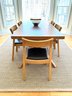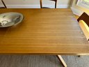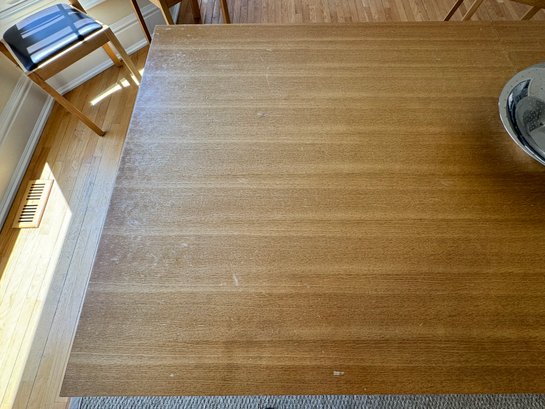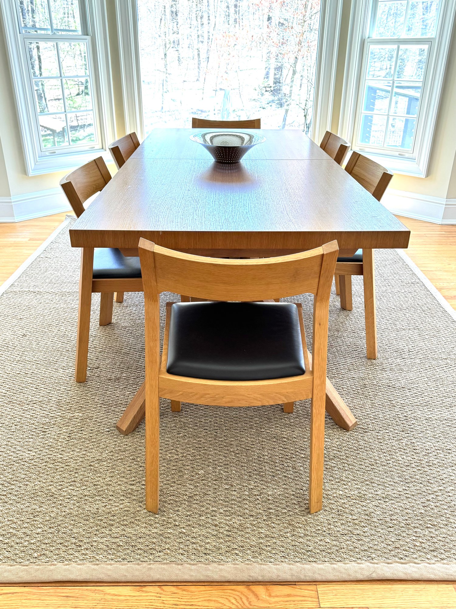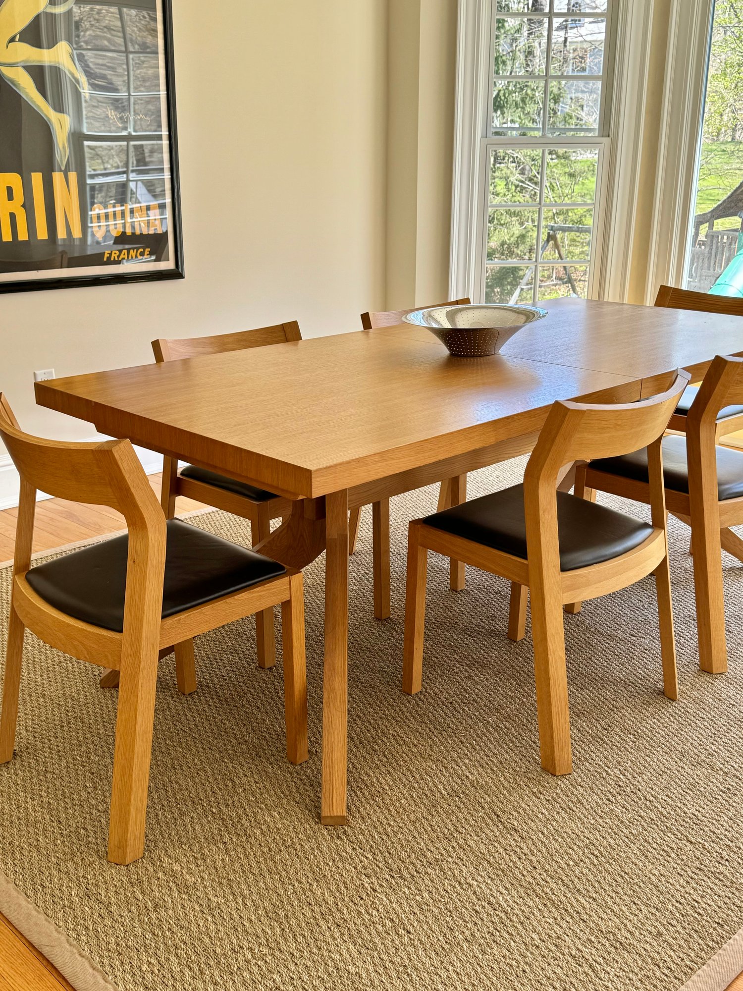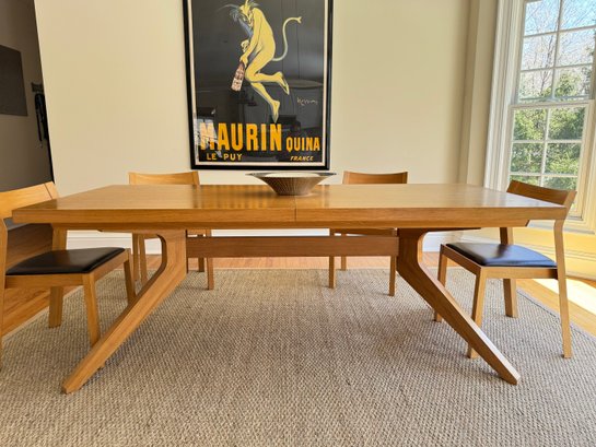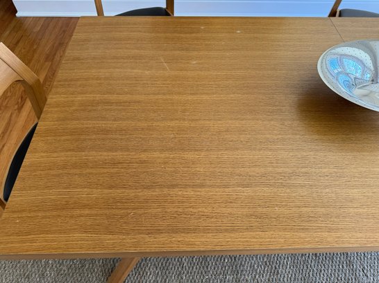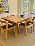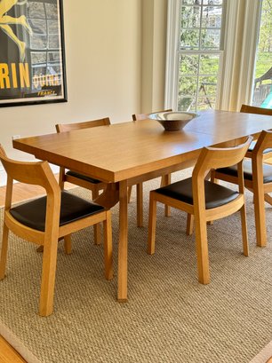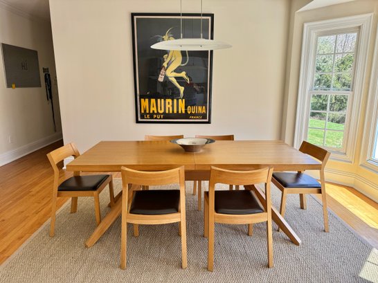 Modern farmhouse style wood dining table with 6 matching chairs. Overall the table presents well but could use a little TLC refresh. The top has some sun fade and wear on end that has been close to the window and some wear spots on top surface that furniture oil could help restore. Chairs are armless with brown leather seat cushions. A few of the chairs are a bit loose and could use tightening.
