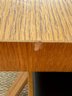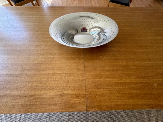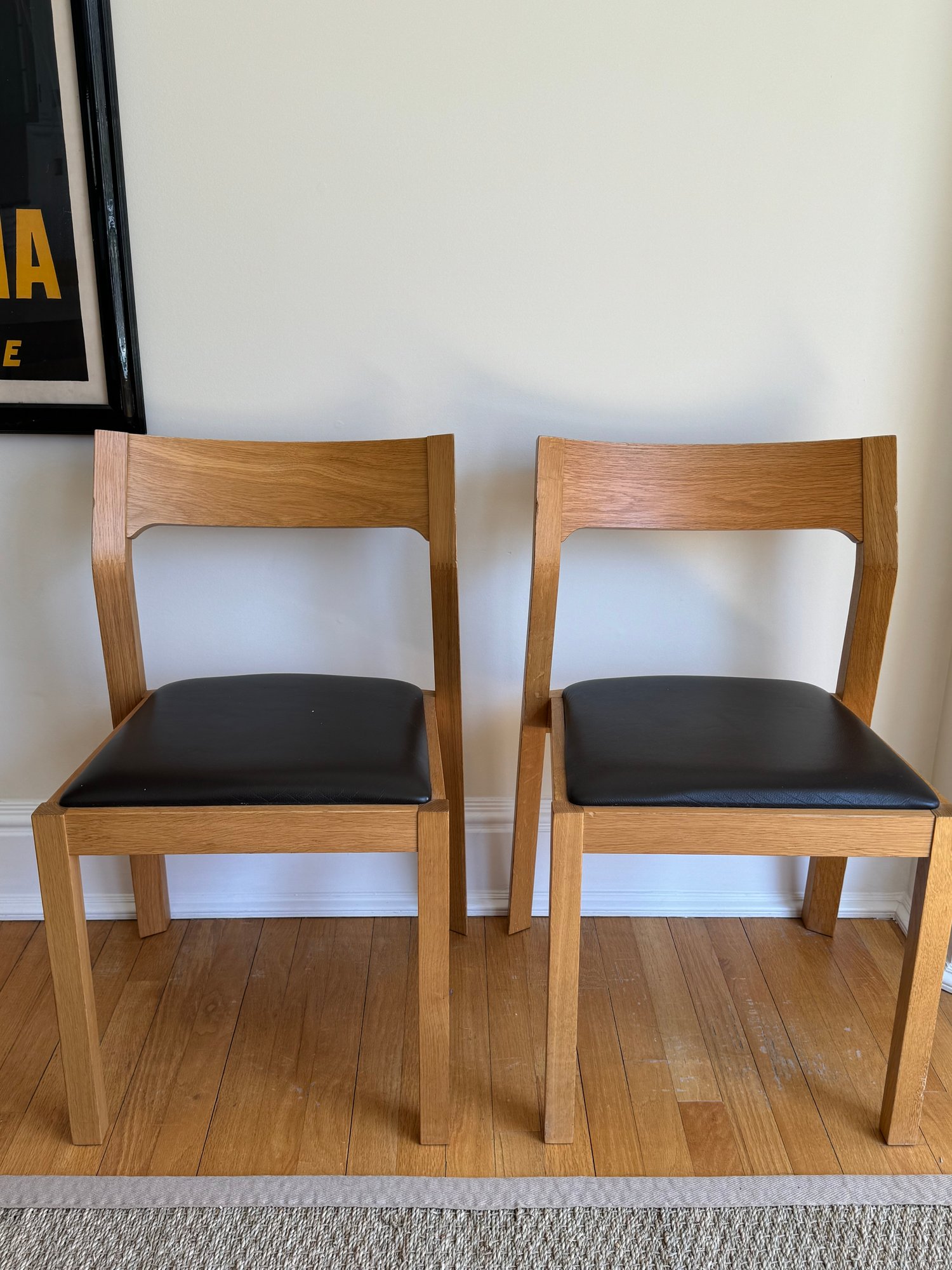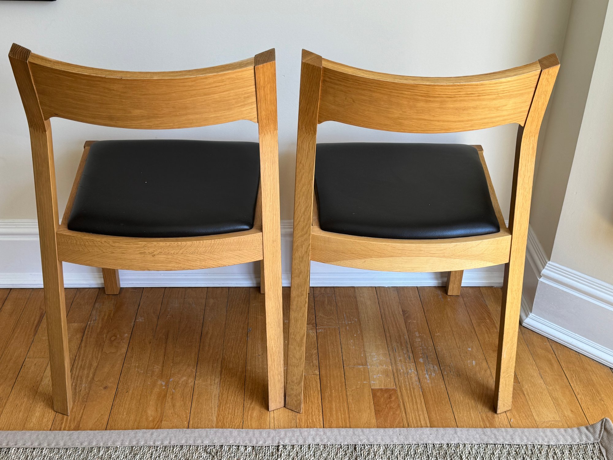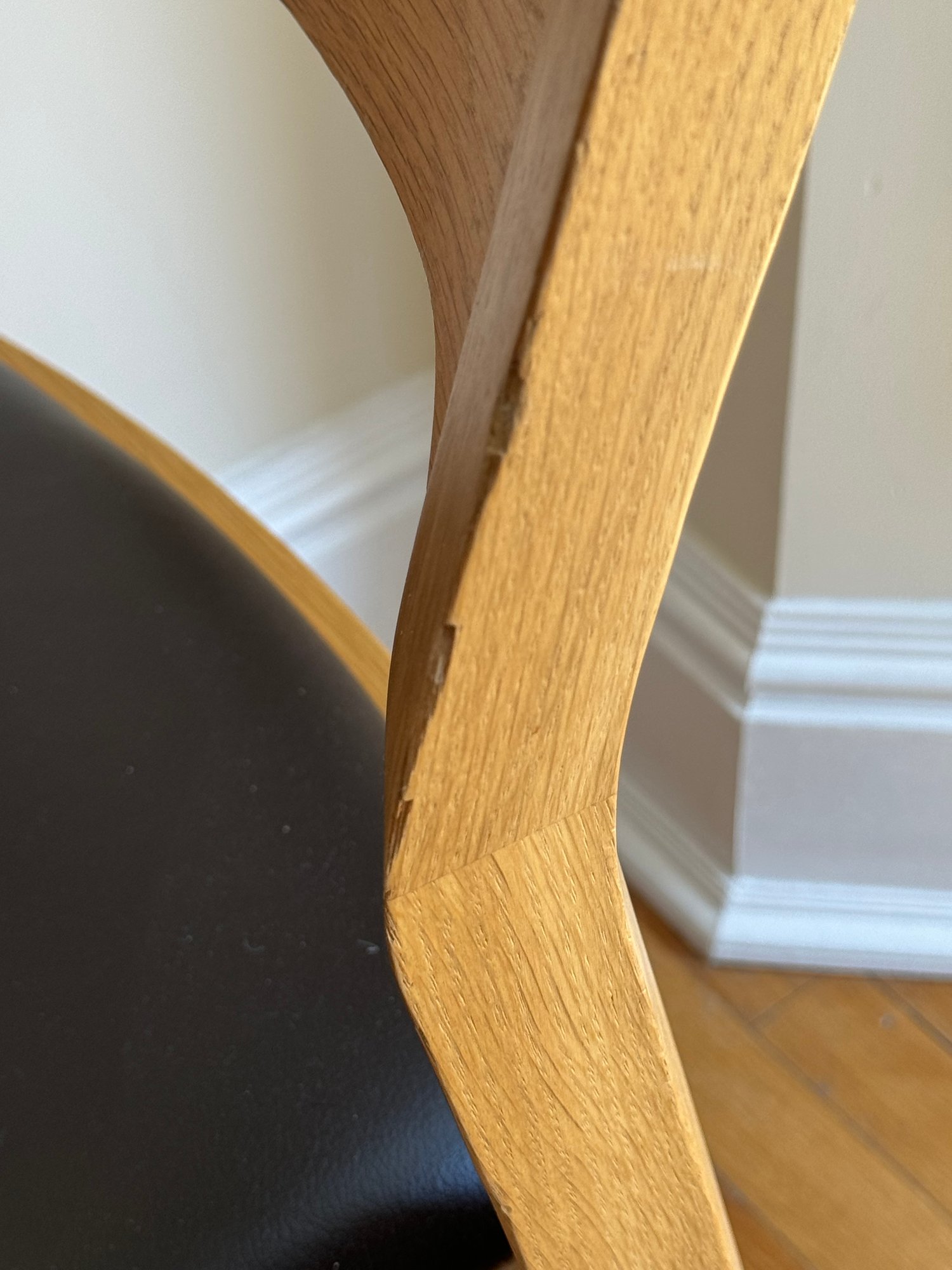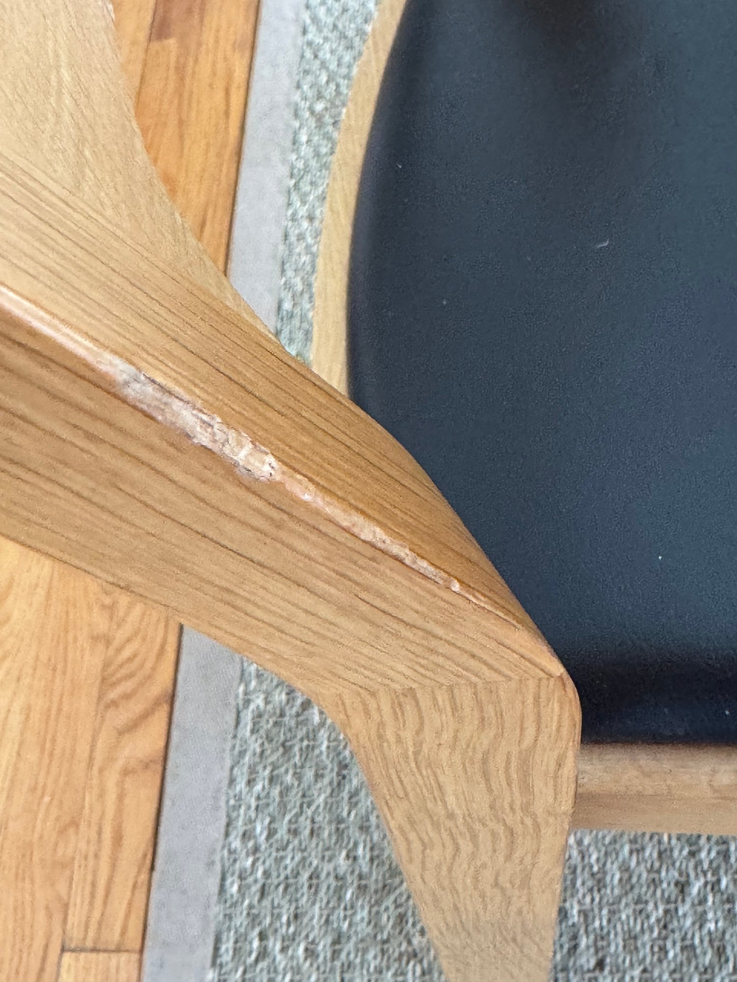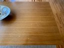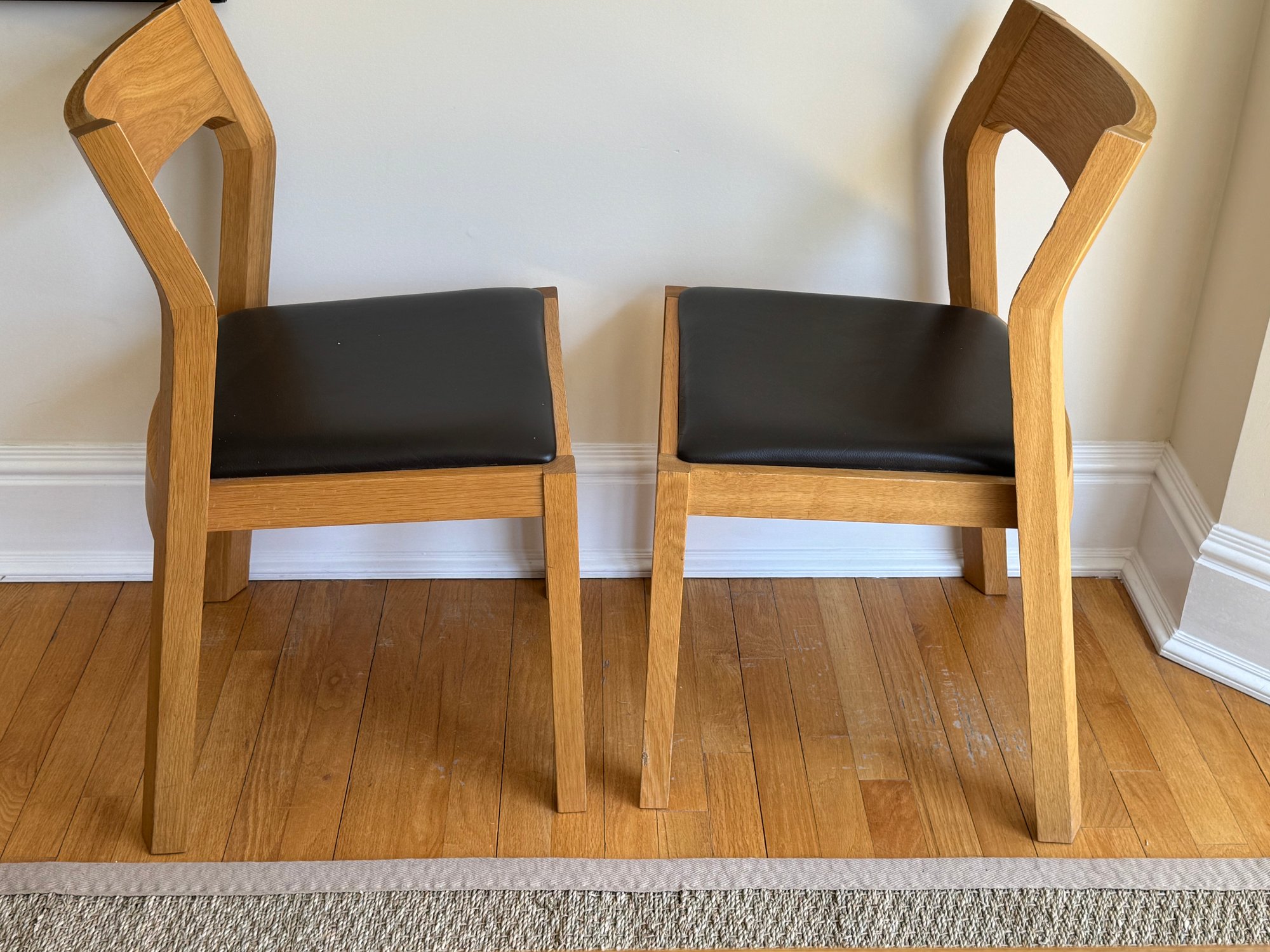 Modern farmhouse style wood dining table with 6 matching chairs. Overall the table presents well but could use a little TLC refresh. The top has some sun fade and wear on end that has been close to the window and some wear spots on top surface that furniture oil could help restore. Chairs are armless with brown leather seat cushions. A few of the chairs are a bit loose and could use tightening.