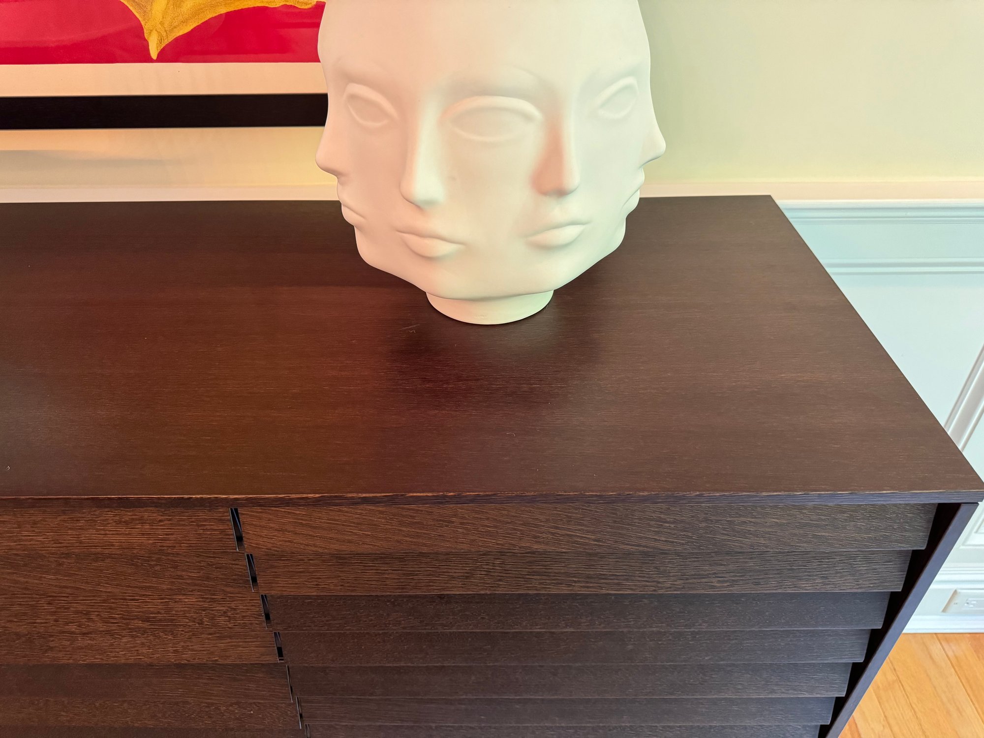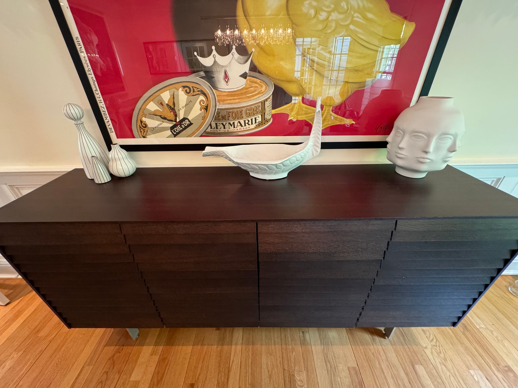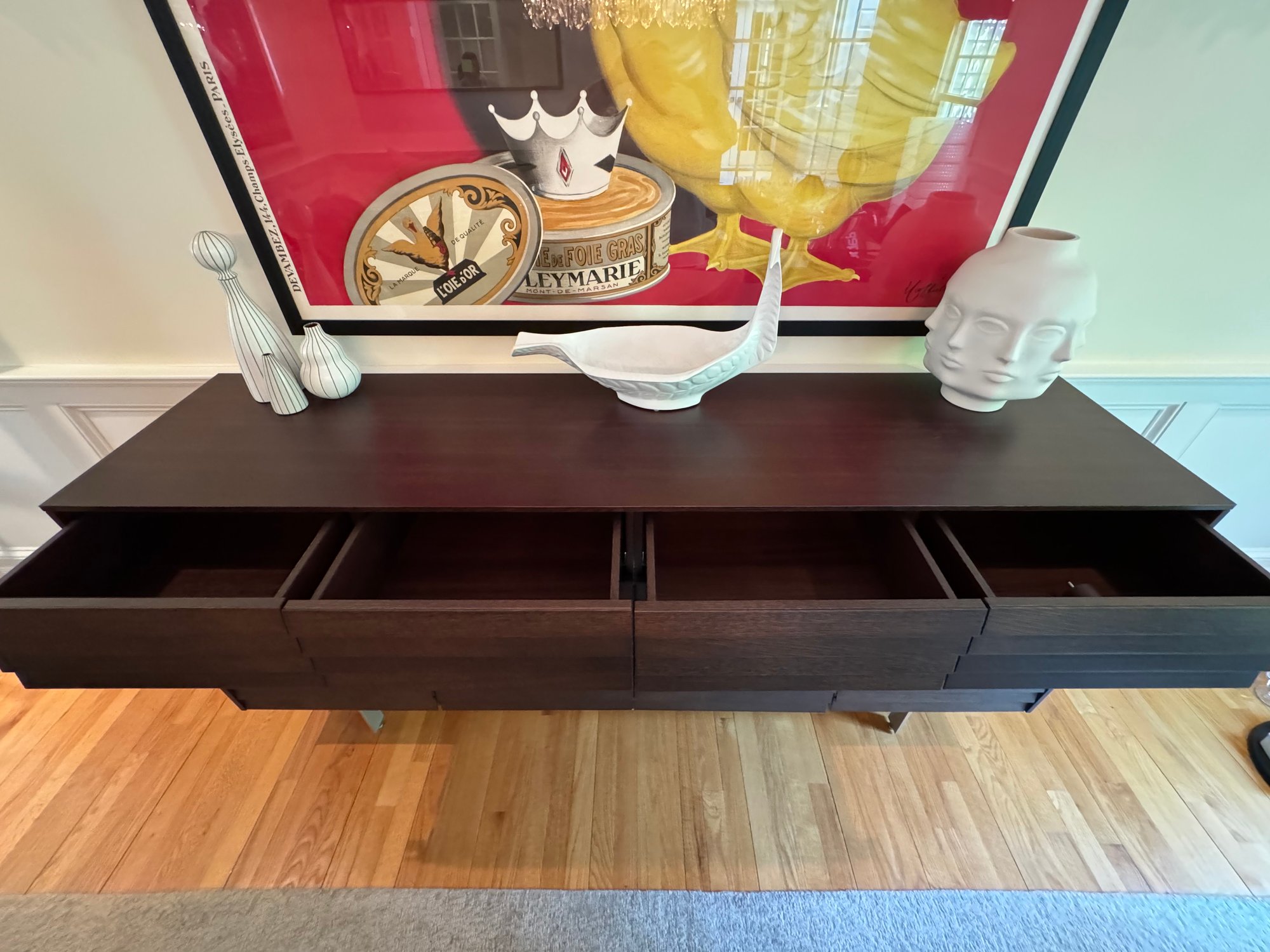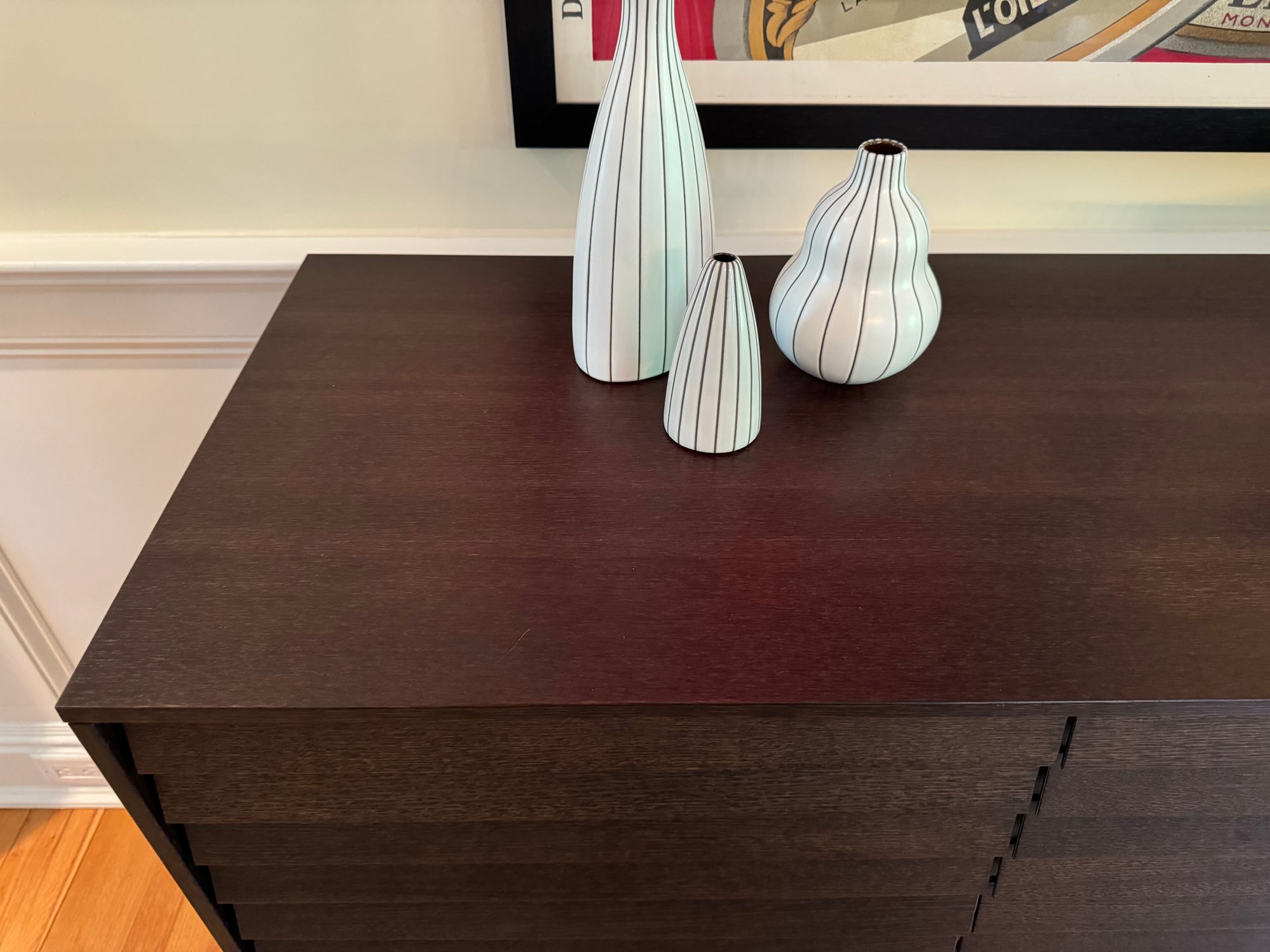 With work included in London's Victoria and Albert Museum, designer Terence Woodgate is known for combining compelling wood details and discreet functionality - e.g. his Sussex Collection, with doors and and drawers seamlessly integrated into the louvered fronts. The Sussex Tall Credenza has four smooth gliding drawers on top and four cabinets on the bottom. Each cabinets has an adjustable shelf that will support 106 libs. The credenza can be used in the dining room, bedroom, office or living room. The richly grained wood veneer is carefully chosen by hand for consistency from controlled and sustainably farmed forests. Made in Spain.