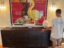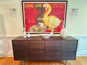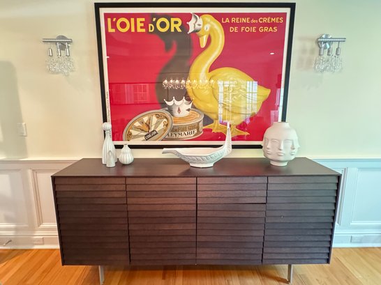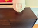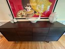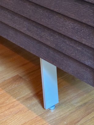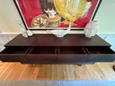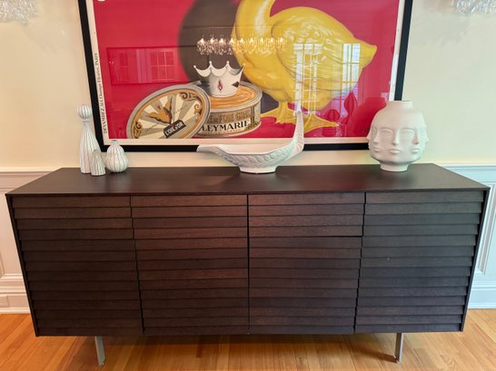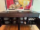 This beautiful DWR console cabinet is designed with a mid century style. It has slat style door panels - is a dark rich chocolate finish with brushed silver base and legs. There are 4 top pull out drawers with 4 separate bottom storage areas with shelves. Condition overall very good and in appearance looks almost new - has been well cared for and maintained from a pristine home. Note that inside door hinges could use readjusting to make them open and close with more ease (or use as is). This shows in the third bottom drawer inside hinge as it is currently appears to be hanging lower than the rest. Most likely/certainly adjusting door hinges will remedy this. Otherwise a beautiful piece in very good condition well cared for an maintained from pristine home. See all photos. Handsome eye candy for the modern home!