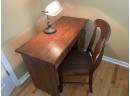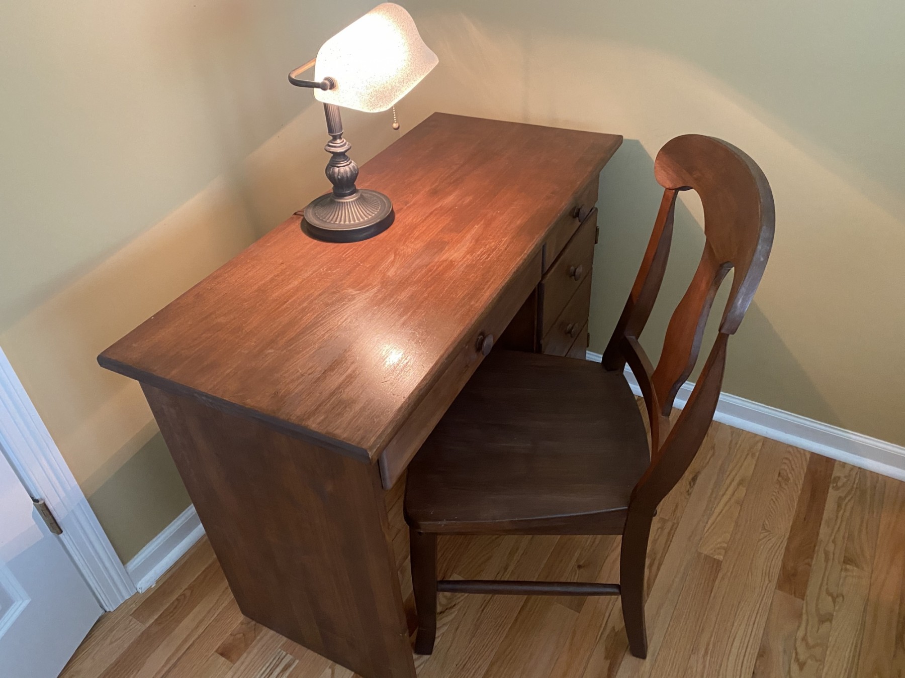 This small desk is great for a bedroom. Two drawers and cabinet with interior shelves 42 x 19 x 30 1/2. Chair very solid 18 1/2 x 17 x 37. includes bankers lamp with white shade