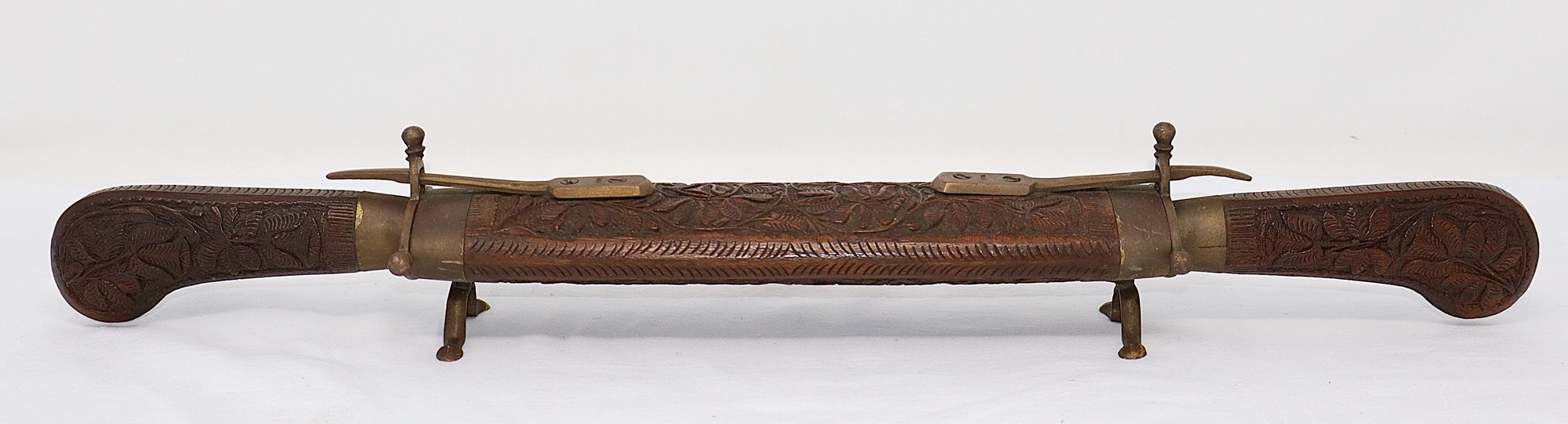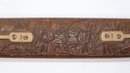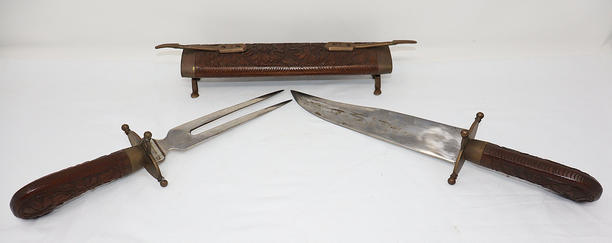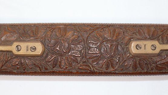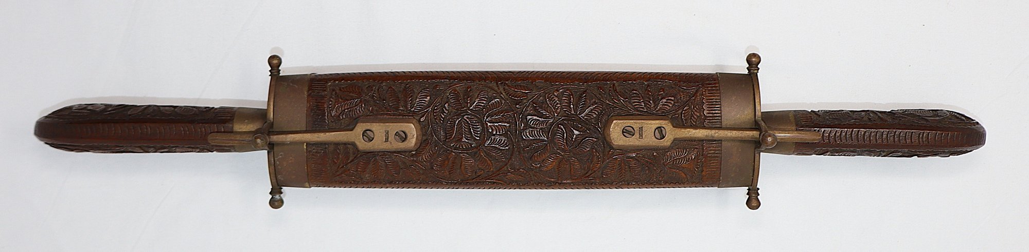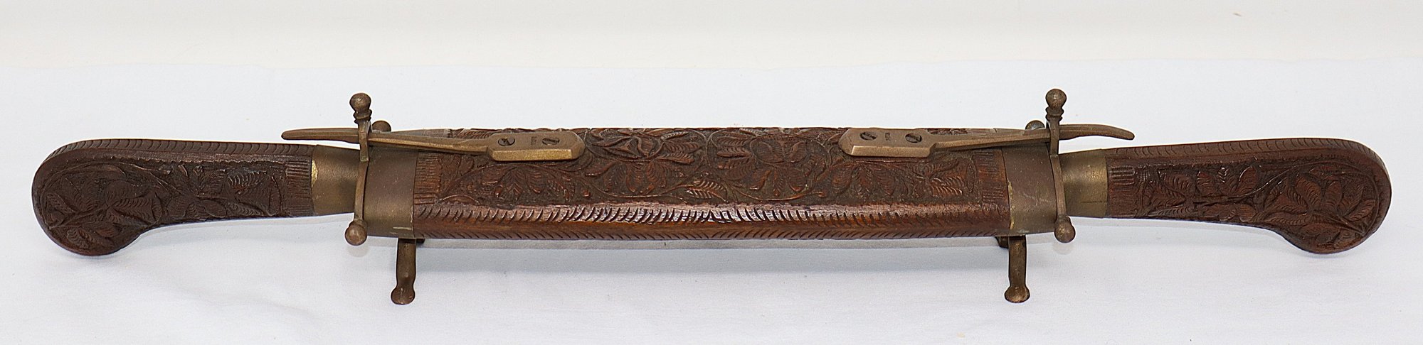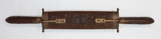 Features intricately hand carved leaf with vine motif throughout wood handles & sheath