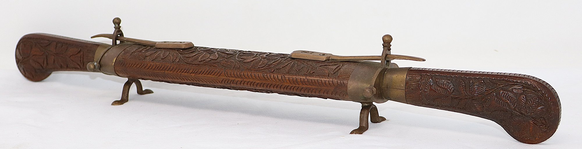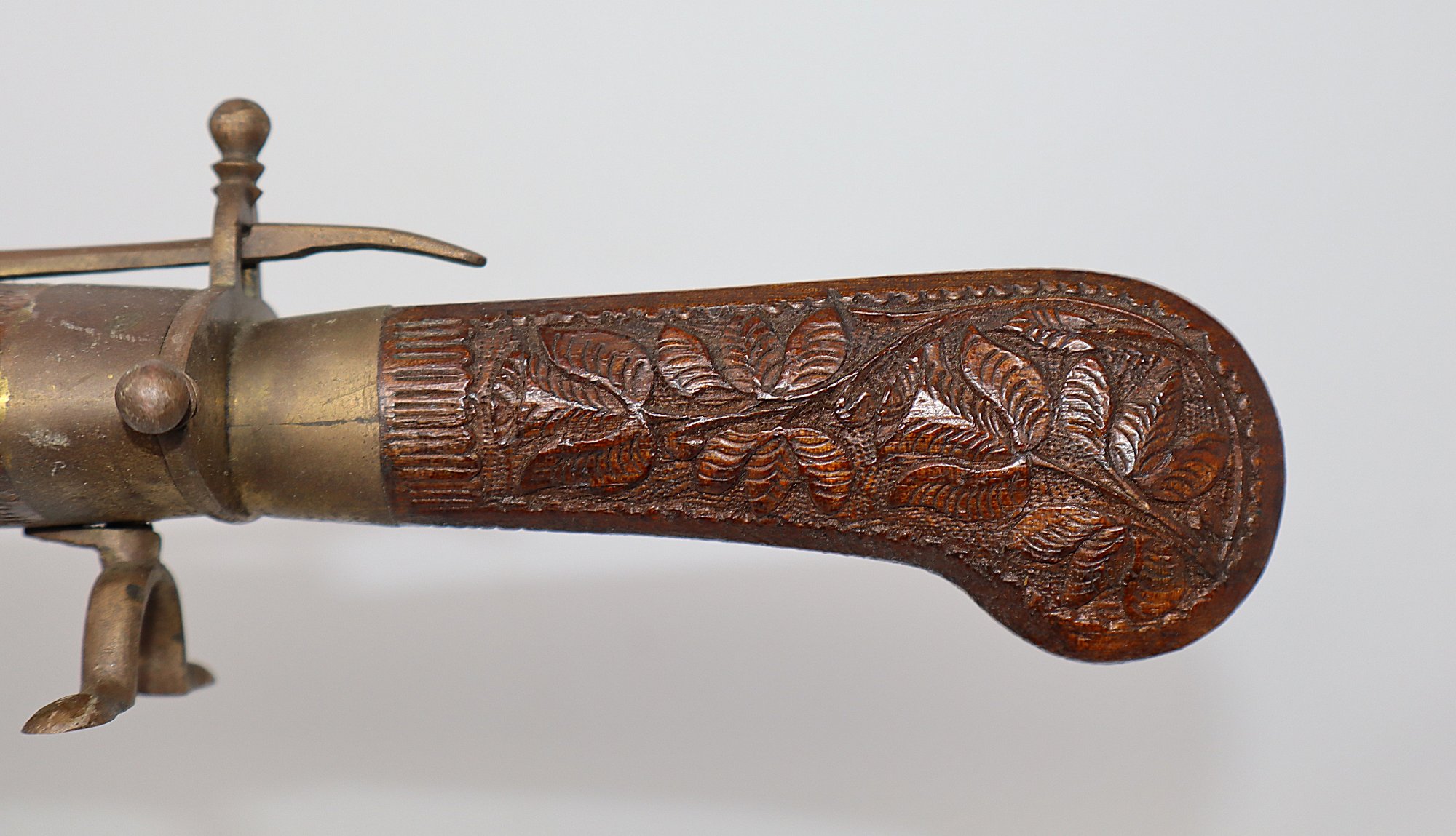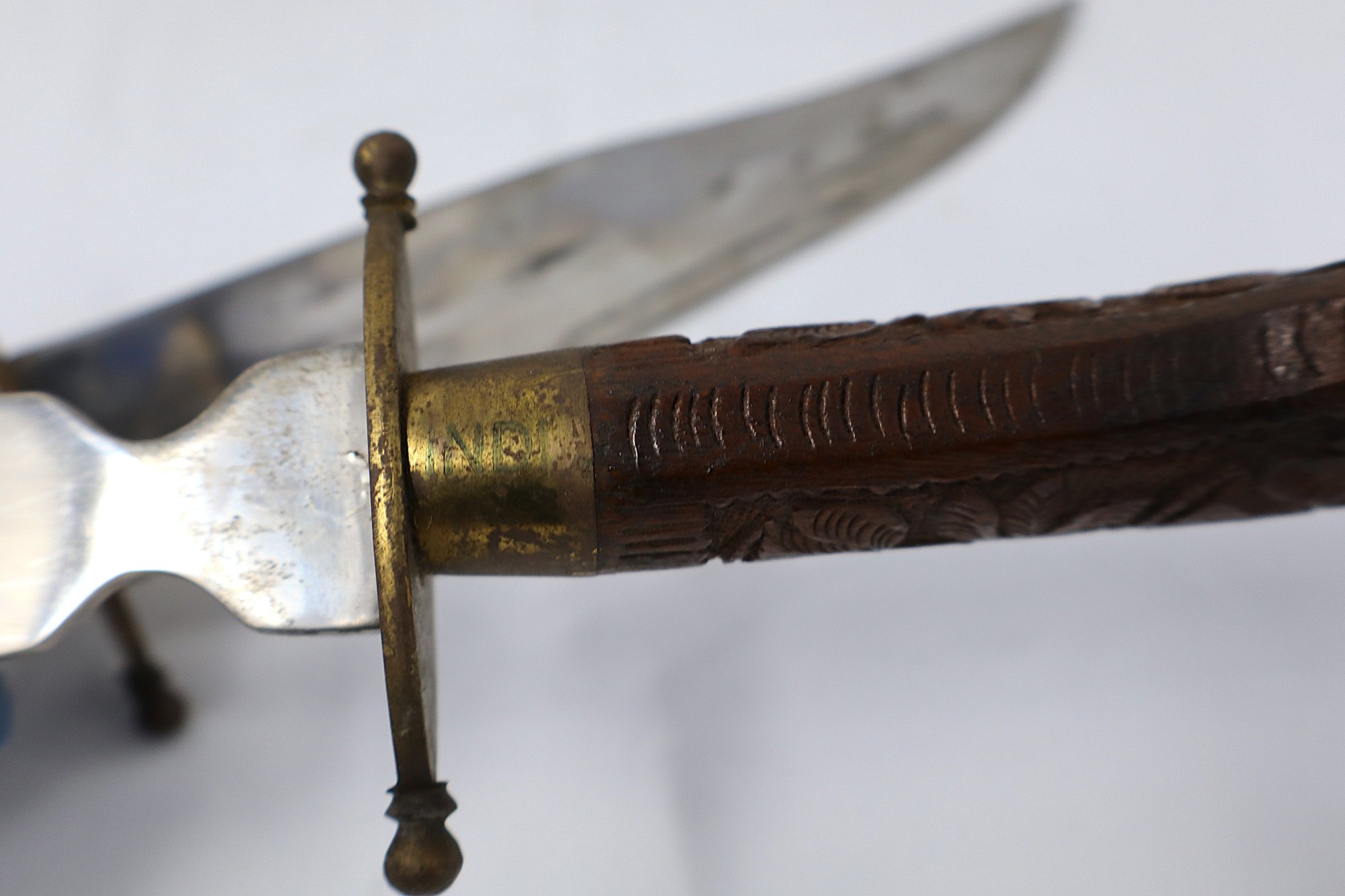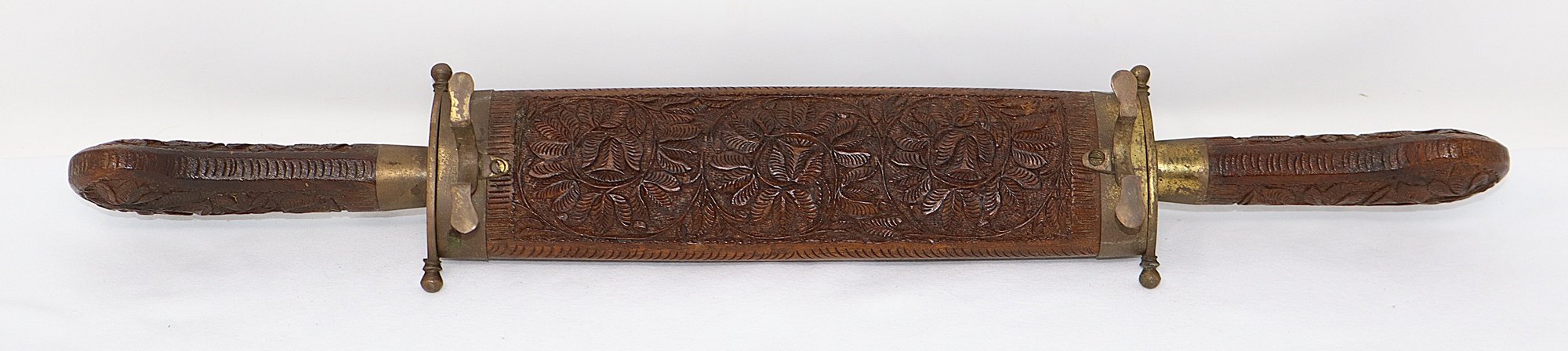 Features intricately hand carved leaf with vine motif throughout wood handles & sheath