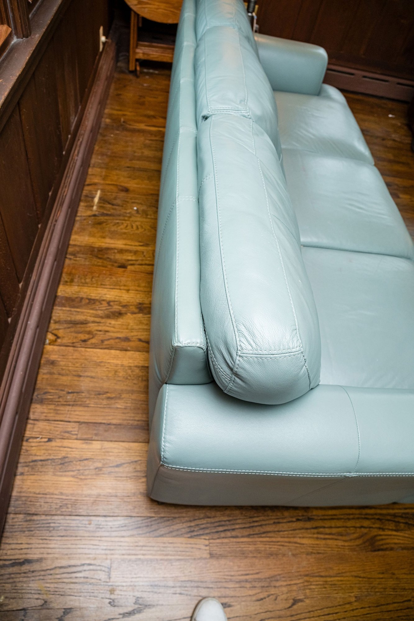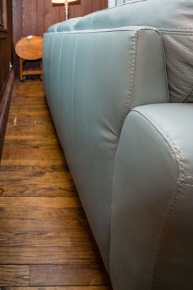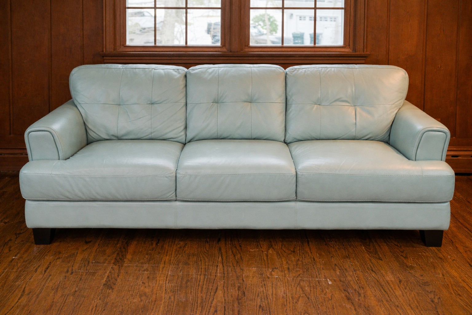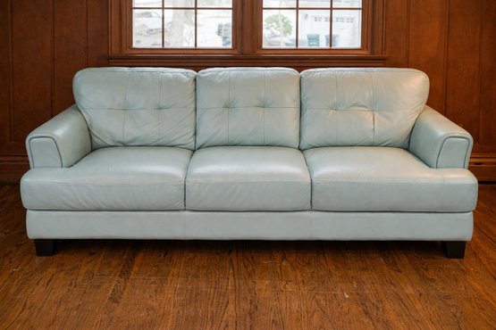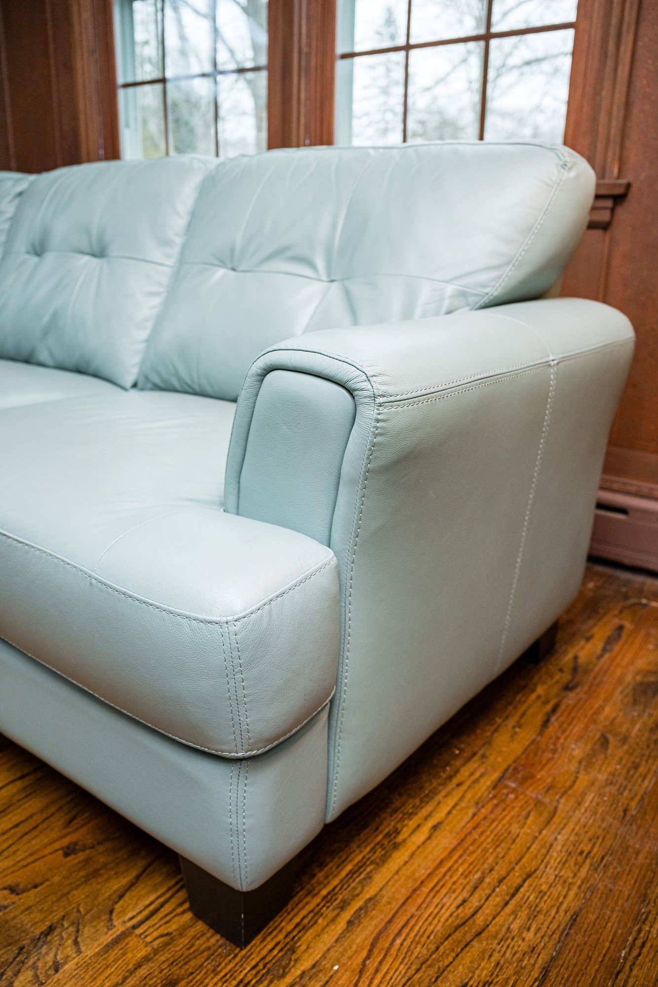 Similar to the Raymour & Flanigan Diego Leather Sofa - squared arms with piping and tufted cushions, clean and gorgeous!