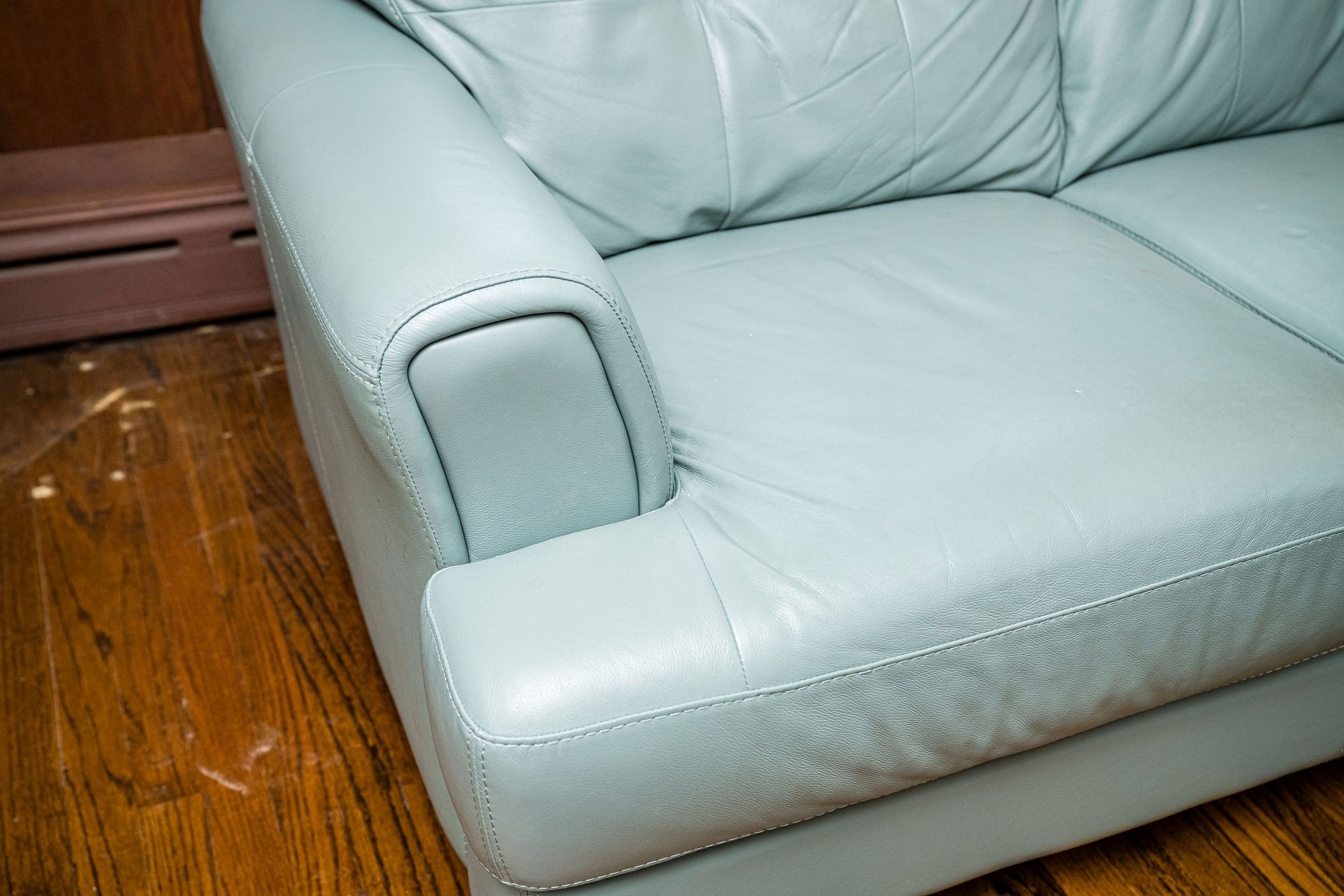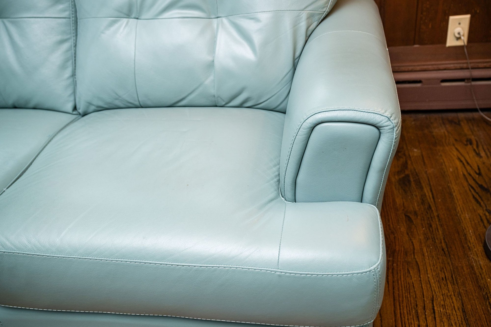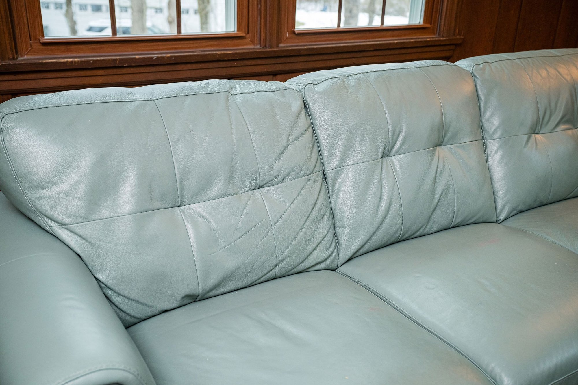 Similar to the Raymour & Flanigan Diego Leather Sofa - squared arms with piping and tufted cushions, clean and gorgeous!