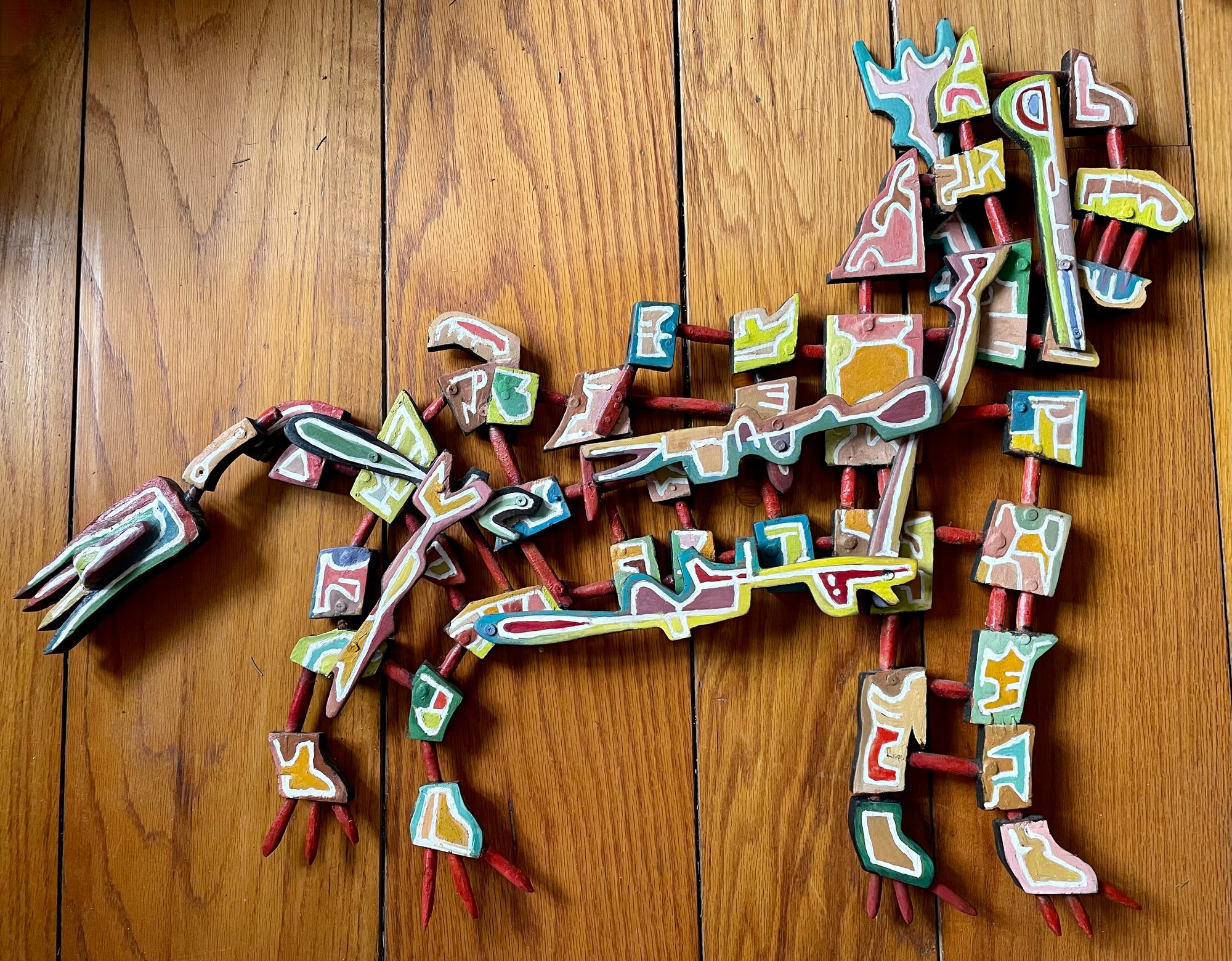 A wonderful large painted wood assemblage of a dog-like animal with an articulated tail. A very colorful, playful and fun piece of art. It's signed on the back with initials KAG. The piece is a nice large size measuring about 31" long by 23 1/2" tall. The condition is very good.