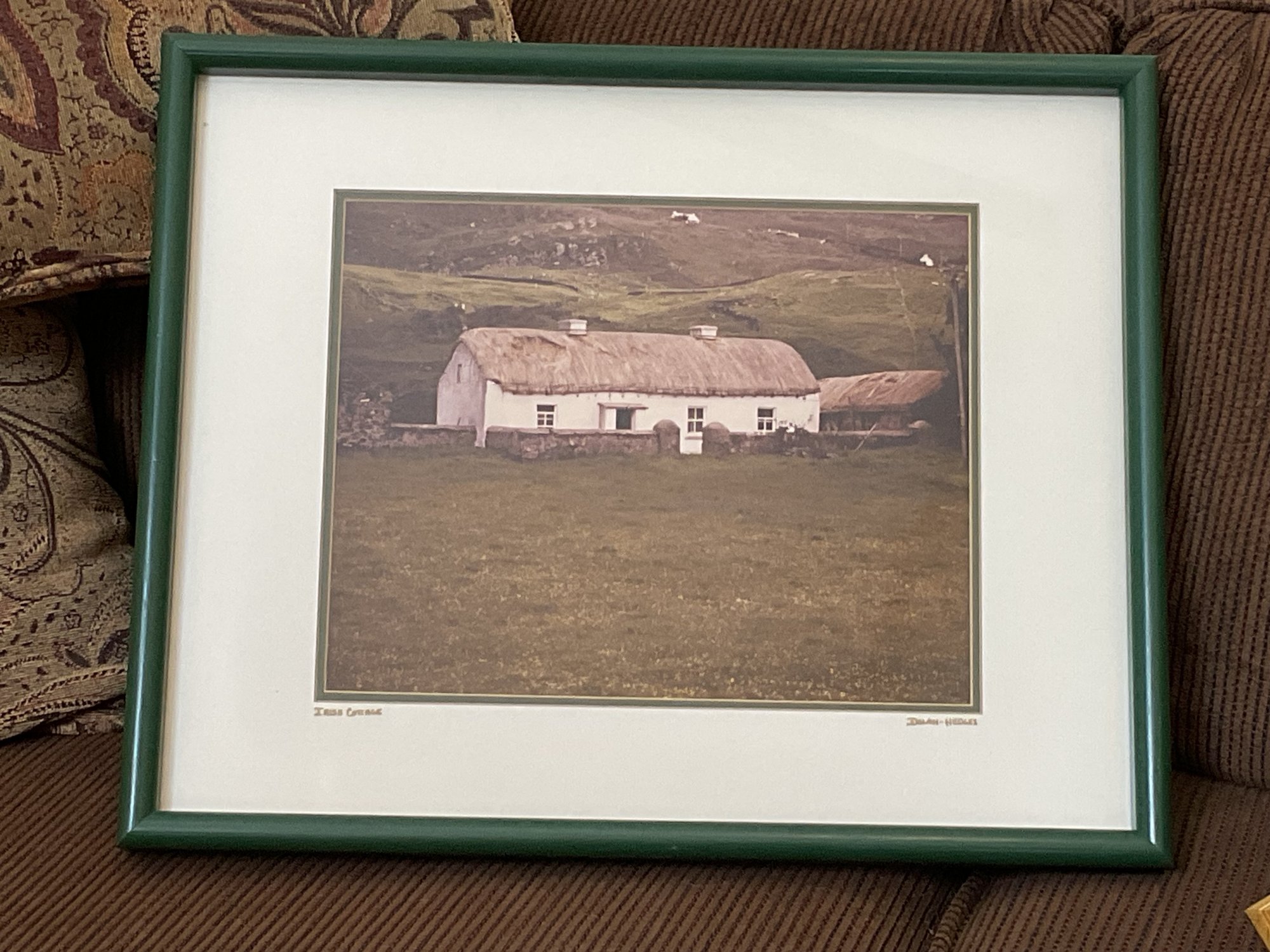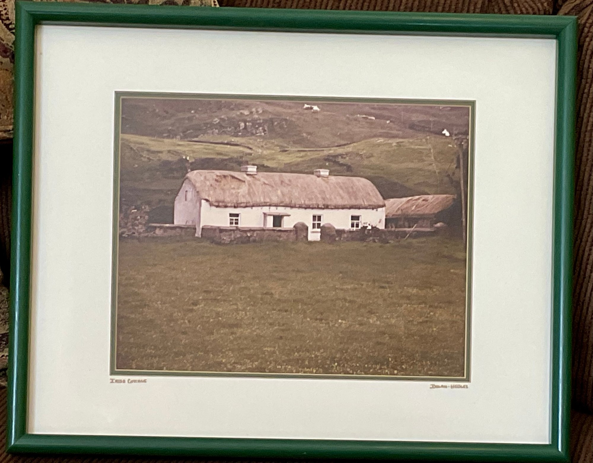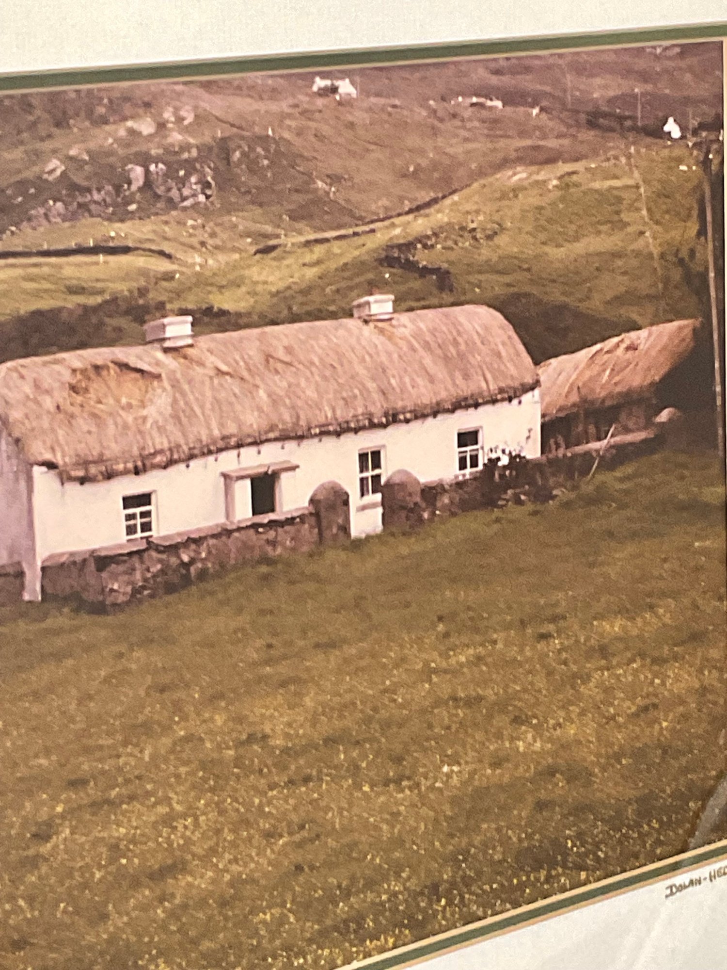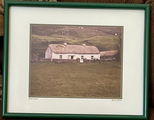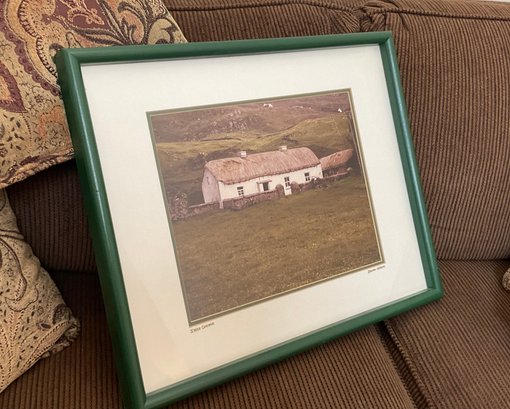 A serene, professional color photograph titled "Irish Cottage" by Dolan-Hedges Photography. This piece captures a classic whitewashed, thatched-roof cottage nestled in a rolling green landscape, embodying the quiet charm of the Irish countryside.