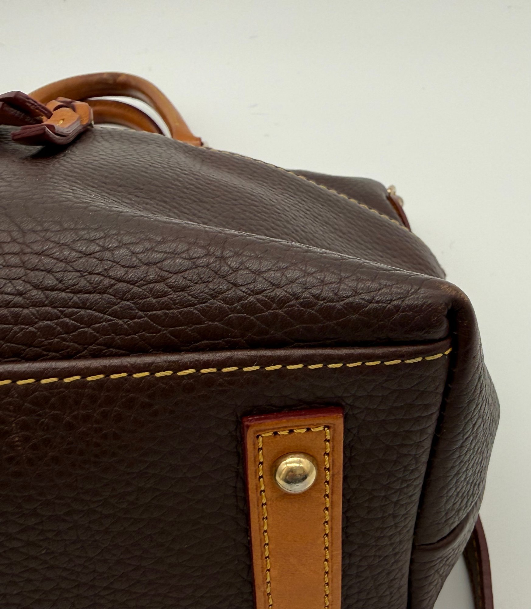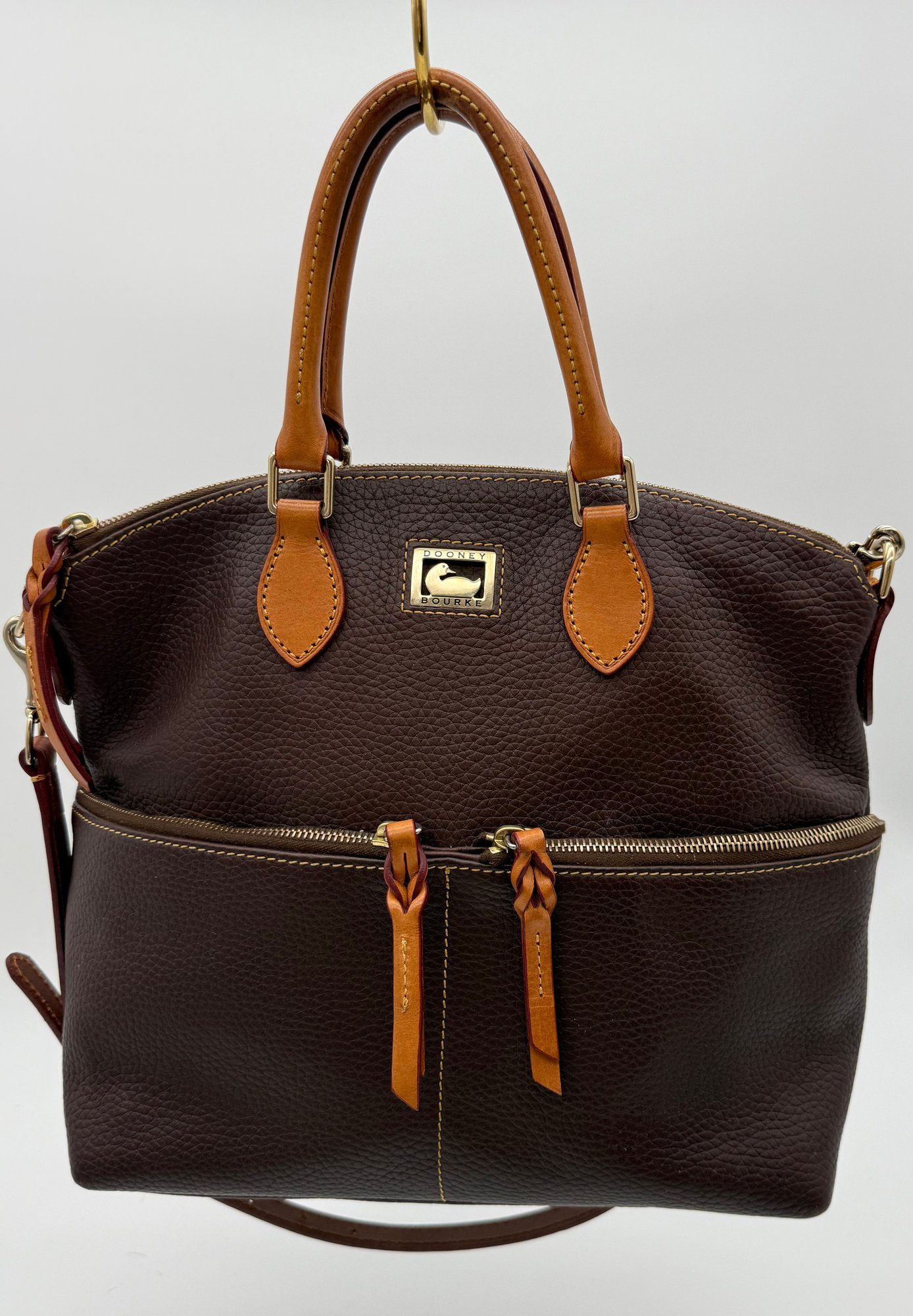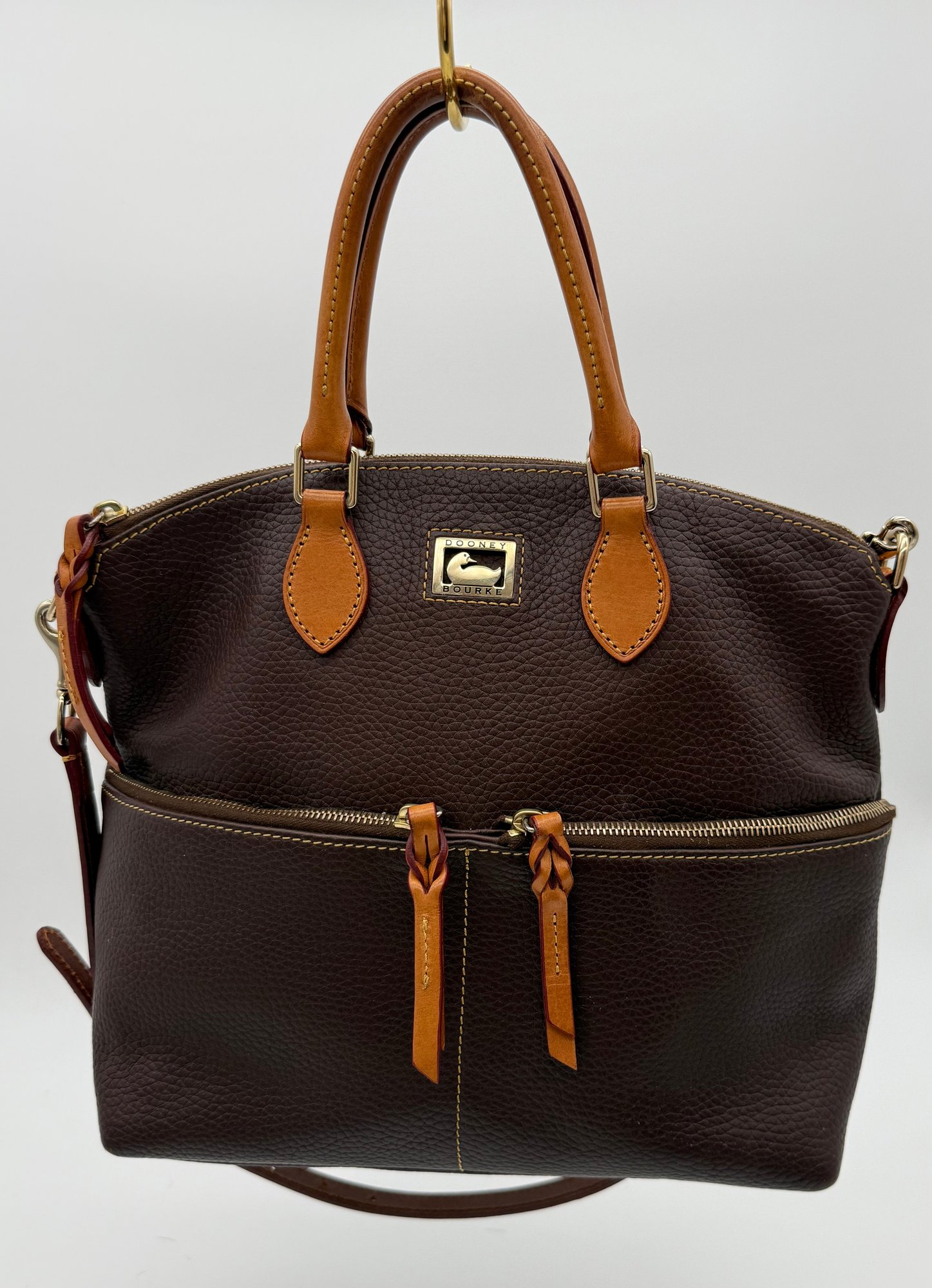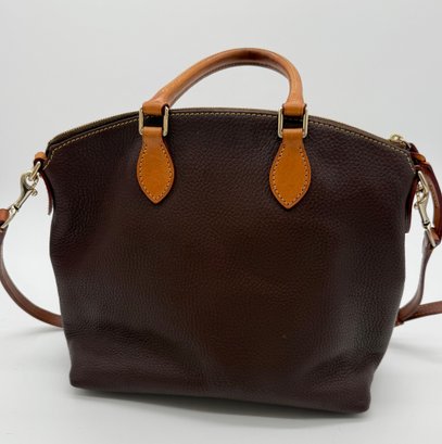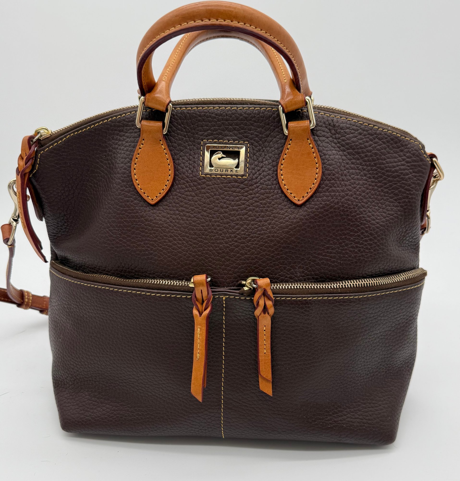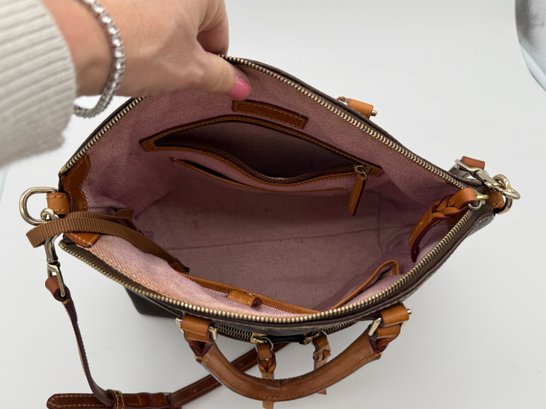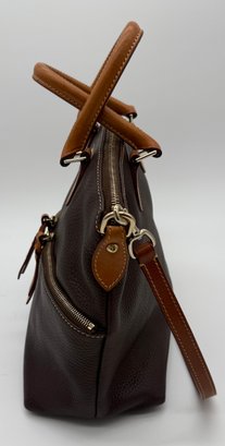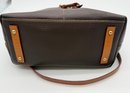 The lot features a beautiful Dooney & Bourke Dark Brown Leather tote adorned with the iconic goldtoned duck logo plate on the front.