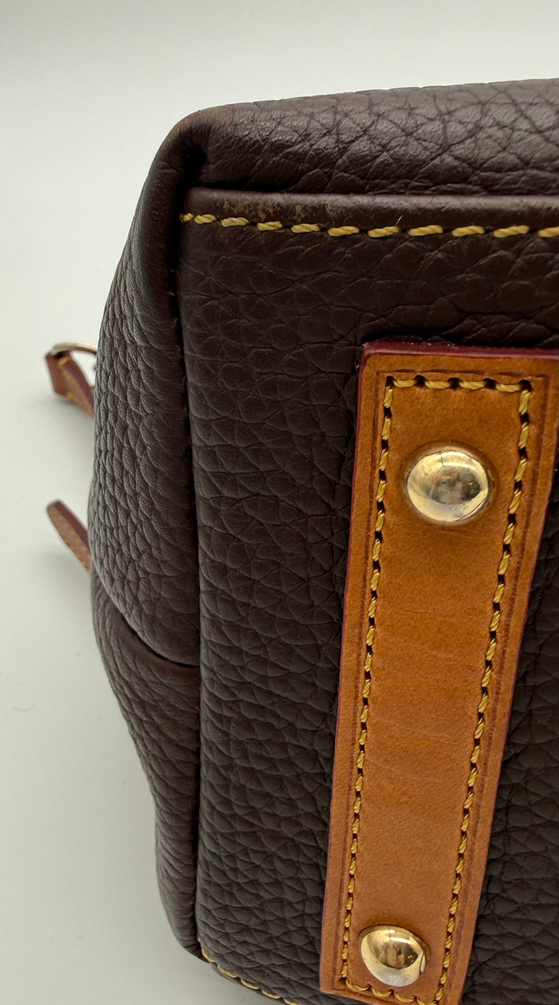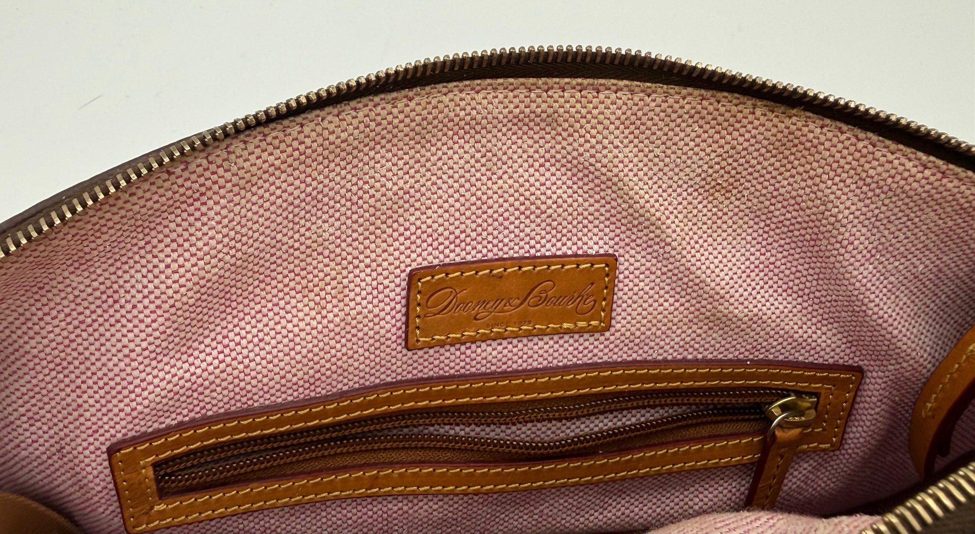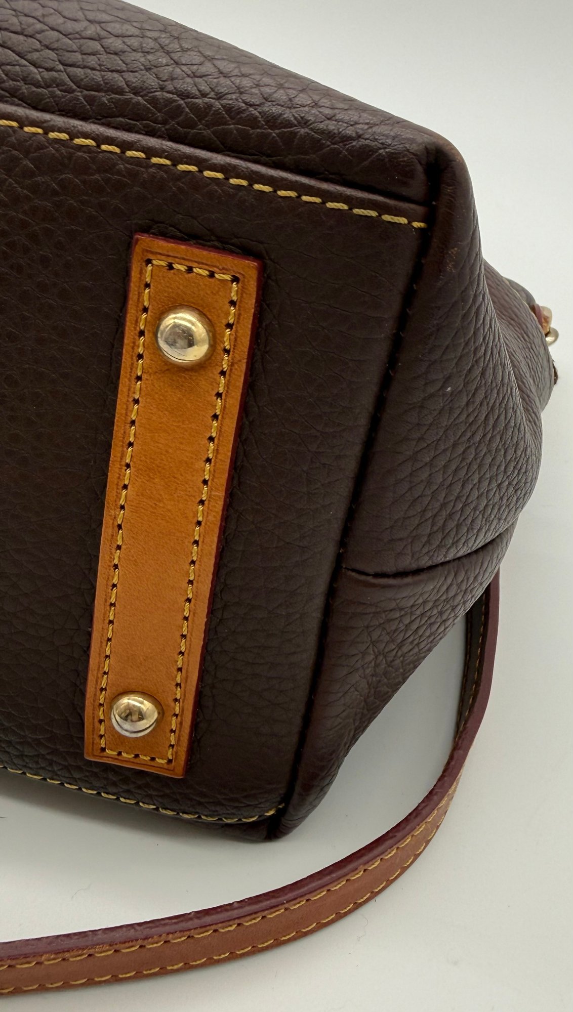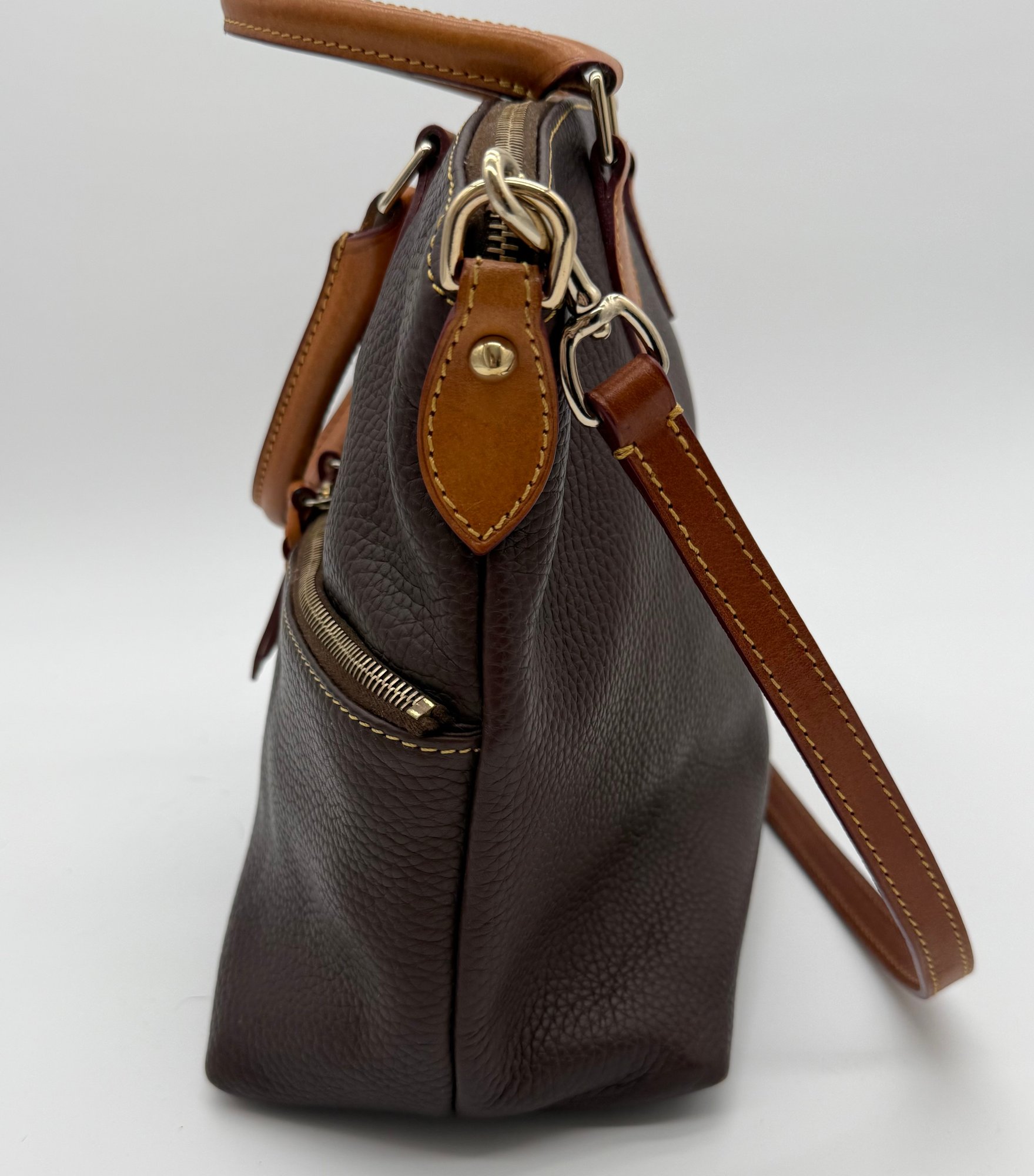 The lot features a beautiful Dooney & Bourke Dark Brown Leather tote adorned with the iconic goldtoned duck logo plate on the front.