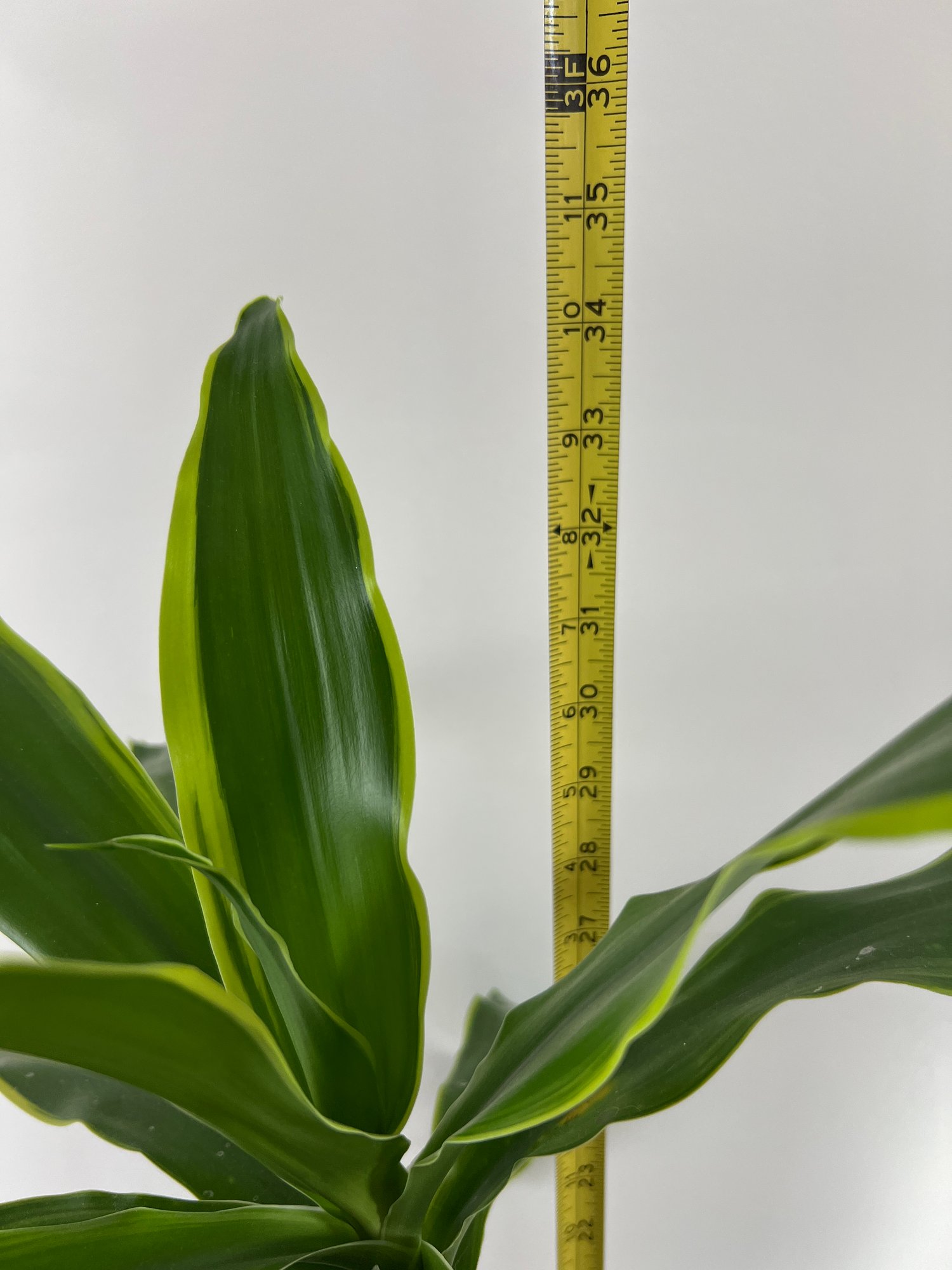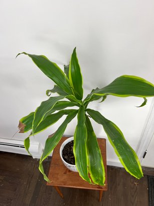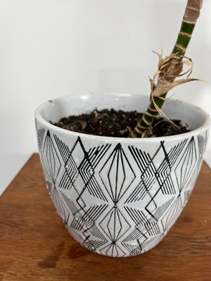 Petite tree-life dracaena houseplant in a black and white ceramic planter. Height overall for plant in planter is 34".