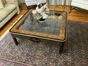 Magnificent Drexel Heritage ET Cetera collection chinoiserie black & gold painted & burl coffee table with beveled glass insert top. Beautiful condition, keeping in mind that this is vintage (1980's) and not new so will have minor signs of use and wear. We have noticed a couple very small dings & scuffs so please see photos and zoom in for details. There are some scratches to the glass - we tried to show these but they are hard to see. A coffee table Extraordinaire! This beautiful gem is a part of the Drexel ET Cetera collection and is comprised of a square wood frame with highly skilled, meticulously painted gold and brown floral chinoiserie designs along the apron of the table and down the straight legs. The top has a square burl wood frame with a beveled clear glass inlay. The detail in the gold and brown floral accents is impeccable. And, it is made by Drexel, so you know it was created with exceptional quality and unmatchable style. We found this table in similar condition selling online for $2500!