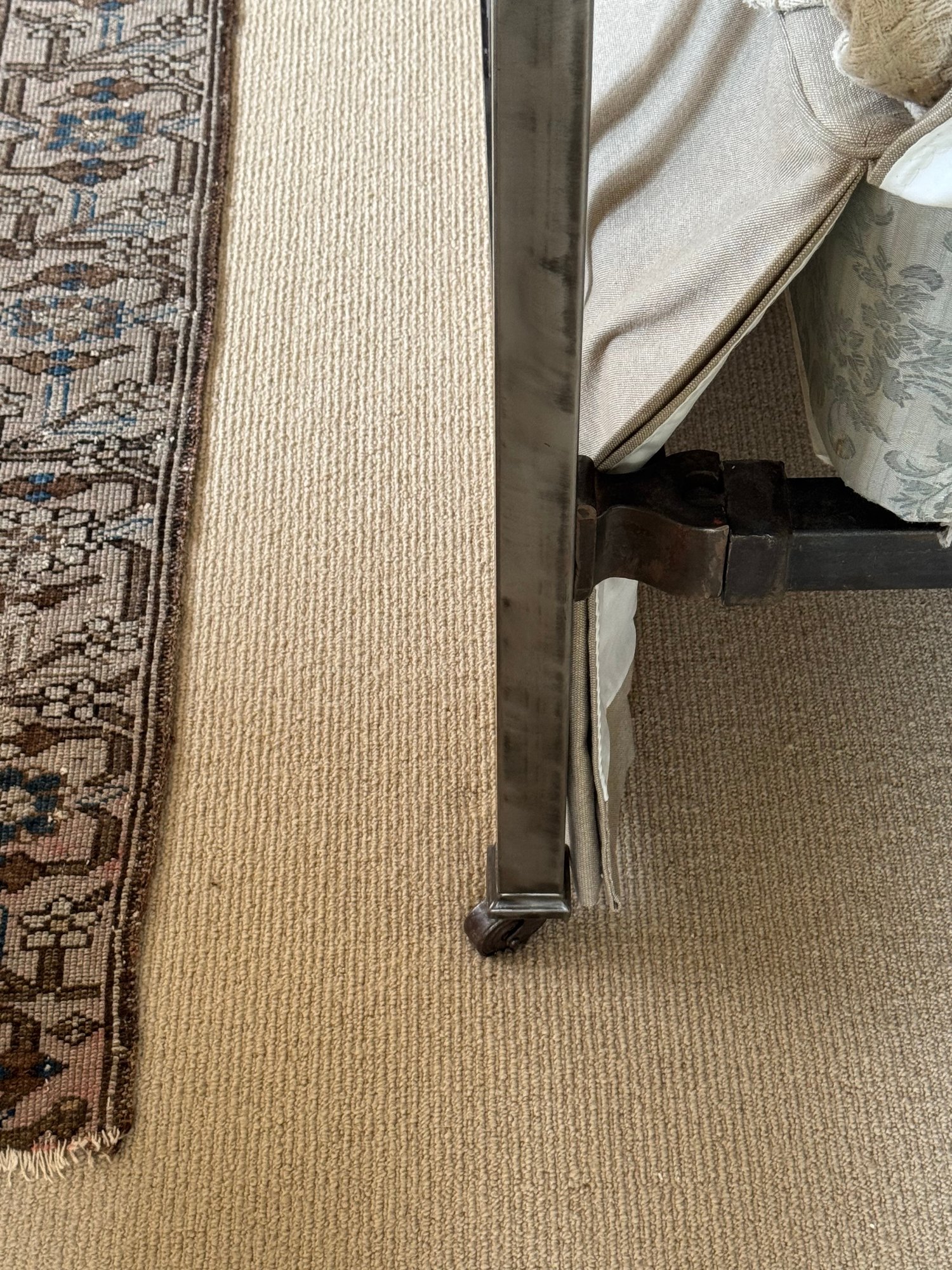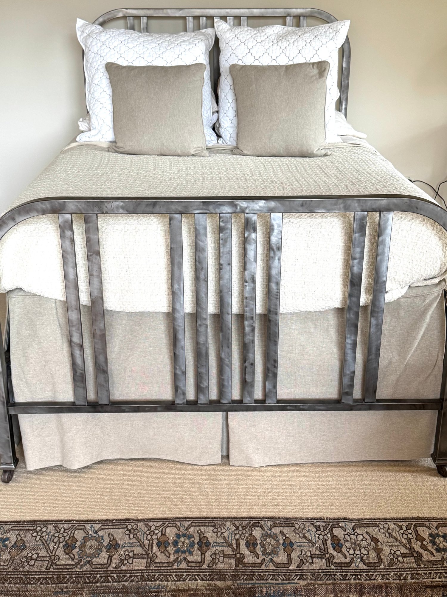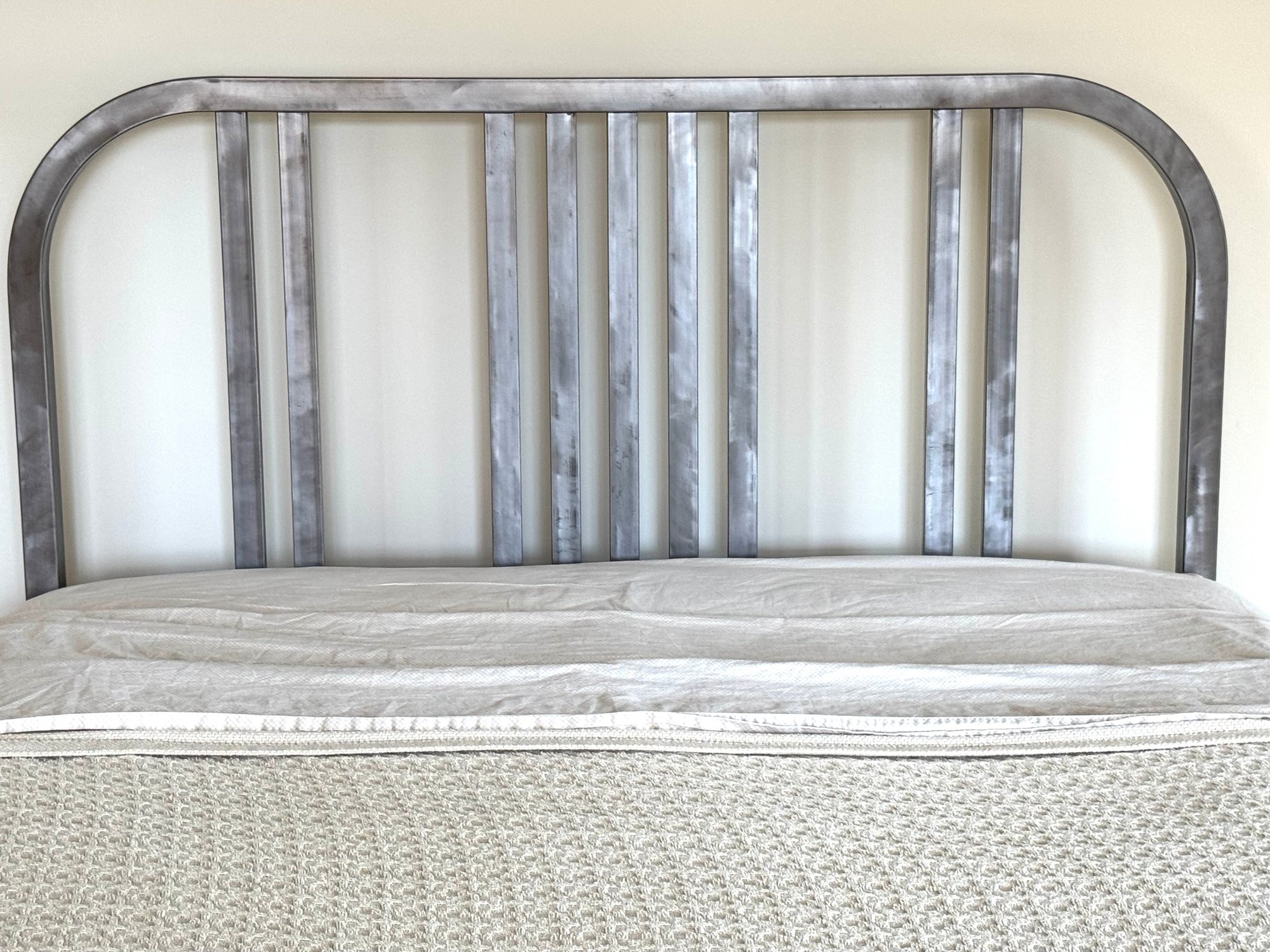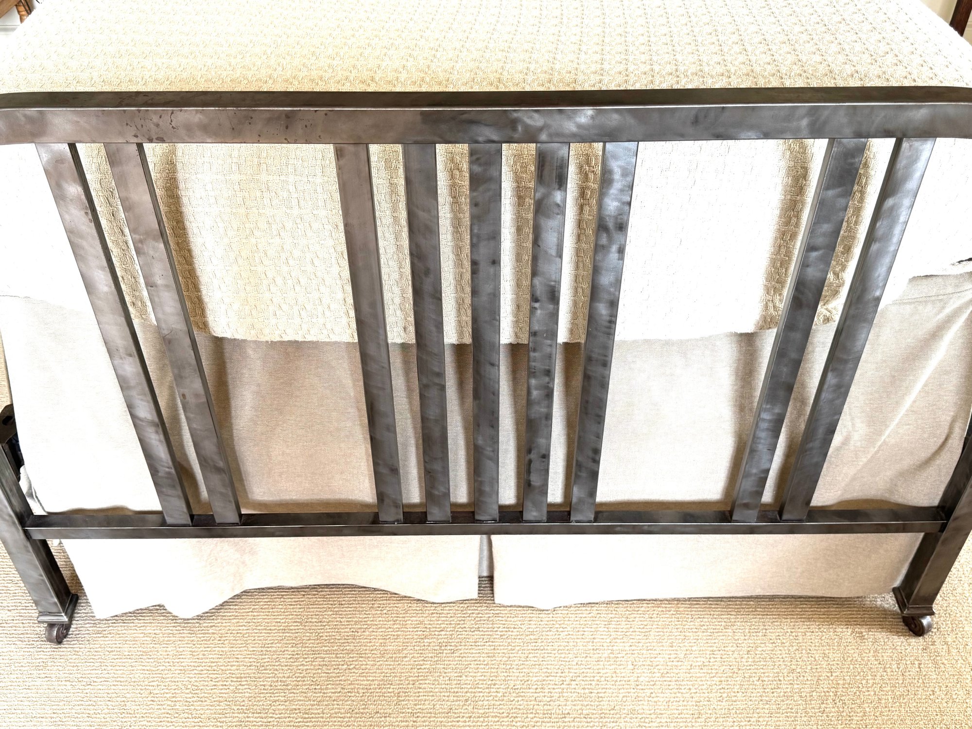 Heavy and well made. Linens include a custom tailored linen bedskirt with matching down throw pillows, Calvin Klein full size duvet and insert and pair matching shams, sheet set and cotton coverlet. Mattress and boxspring are older but have been used lightly in this weekend home. They are optional buyer may take or leave.