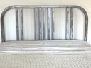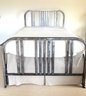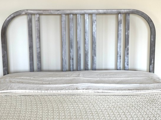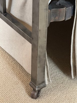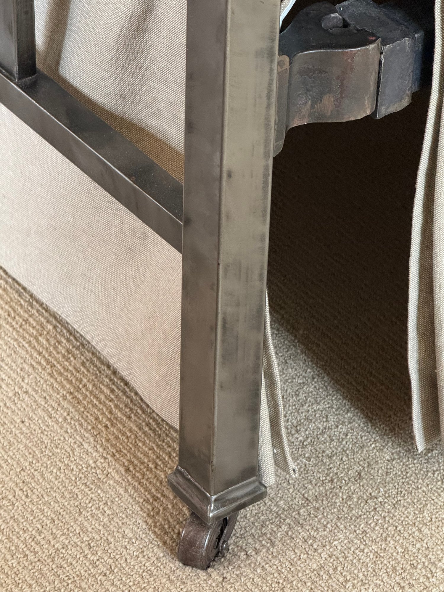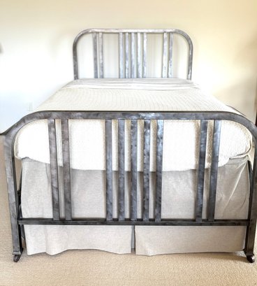 Vintage industrial style metal bed with open slats and distressed patina finish. Bed rests on wheel casters.