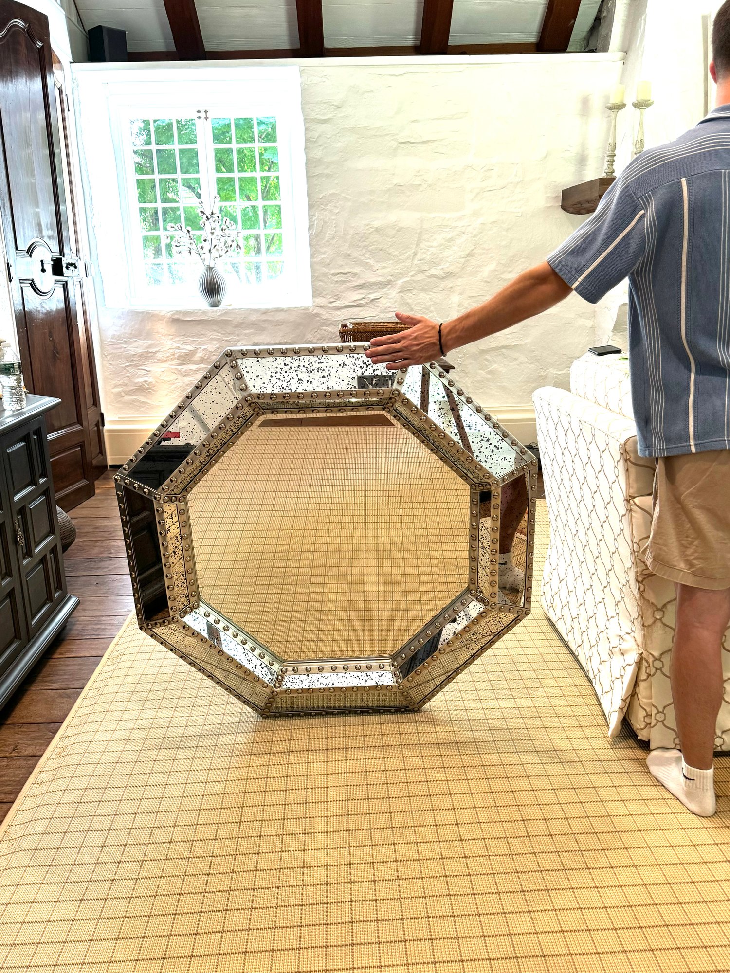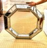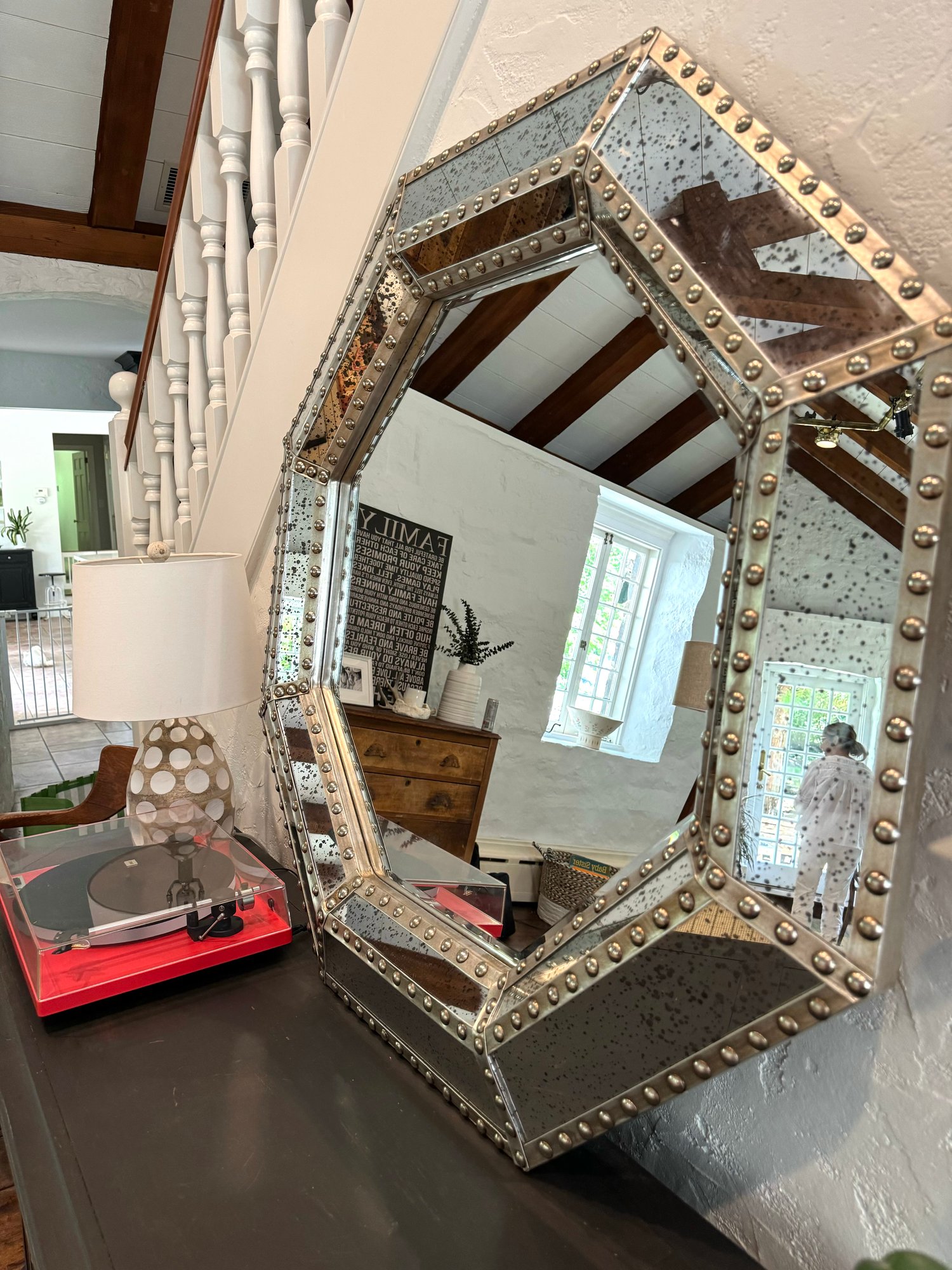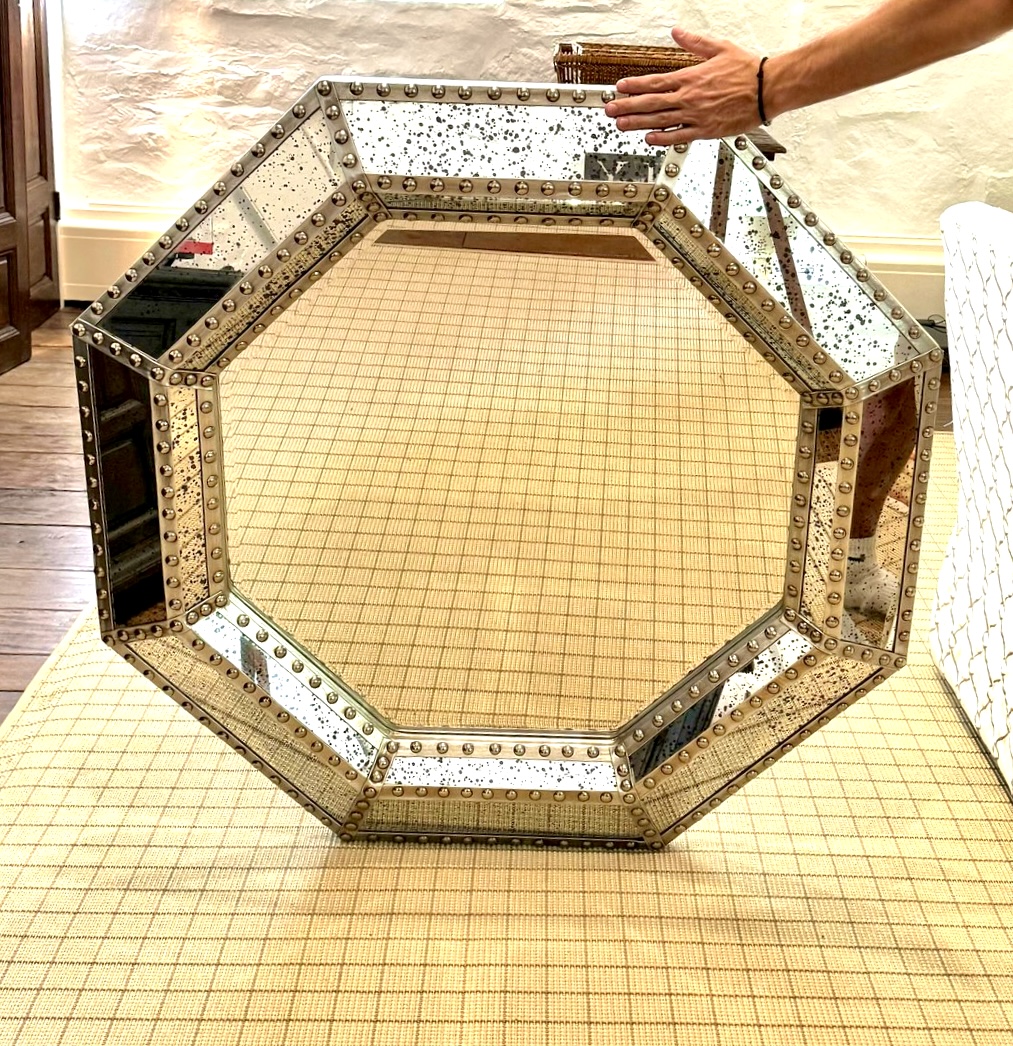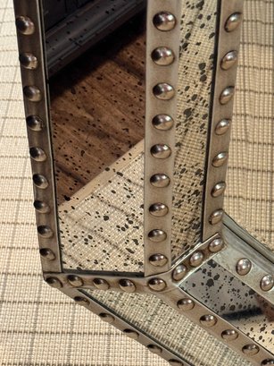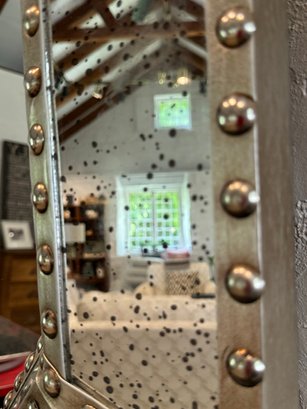 Good looking industrial style octagonal frame with a metal border frame with hobnail detailing. Mirror is a speckled antique style.
