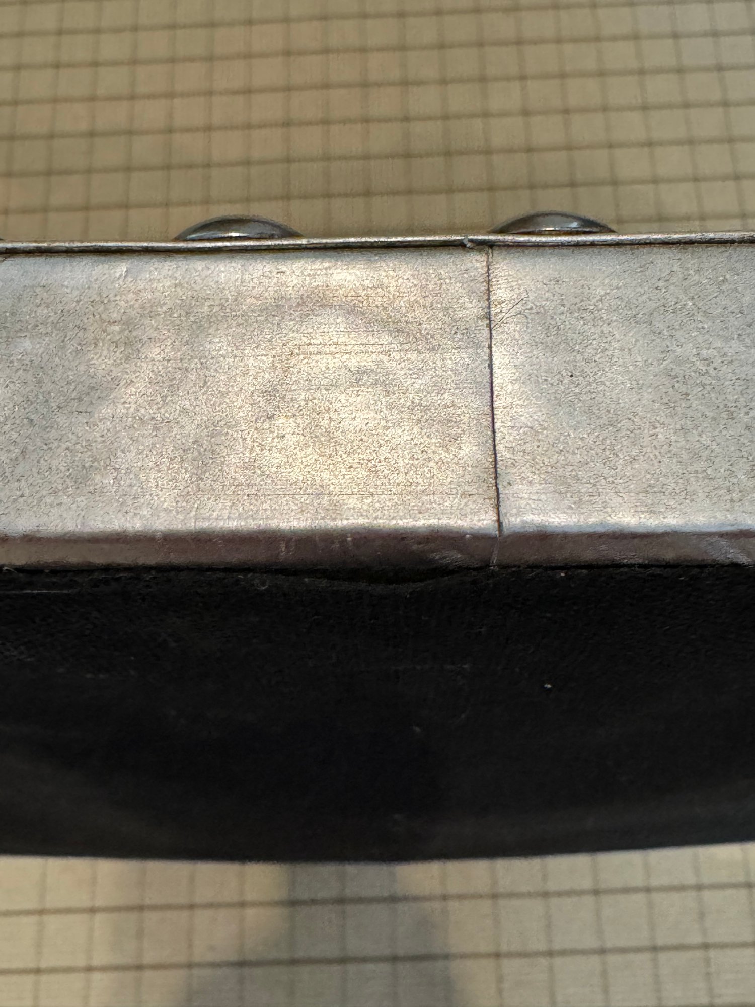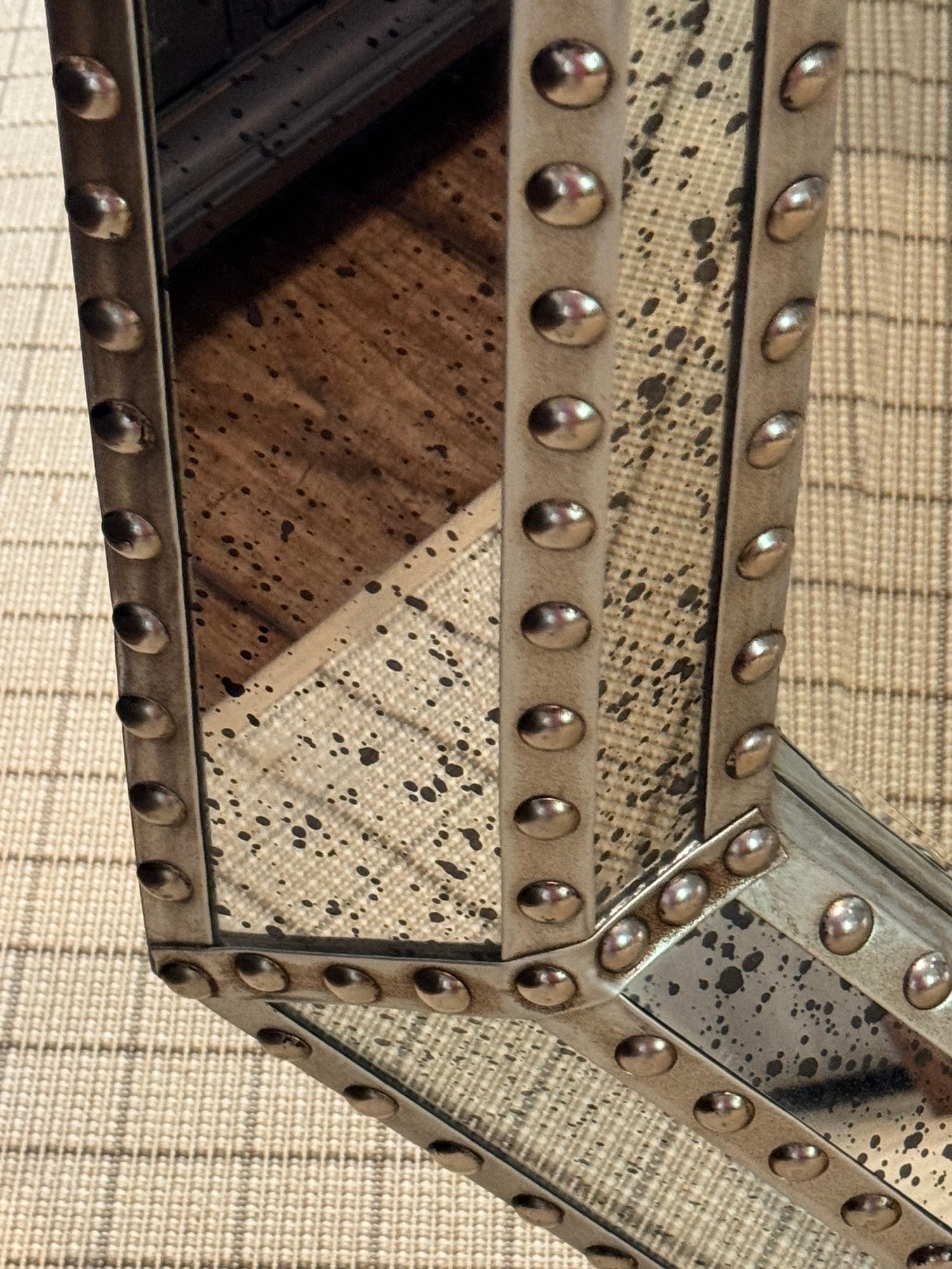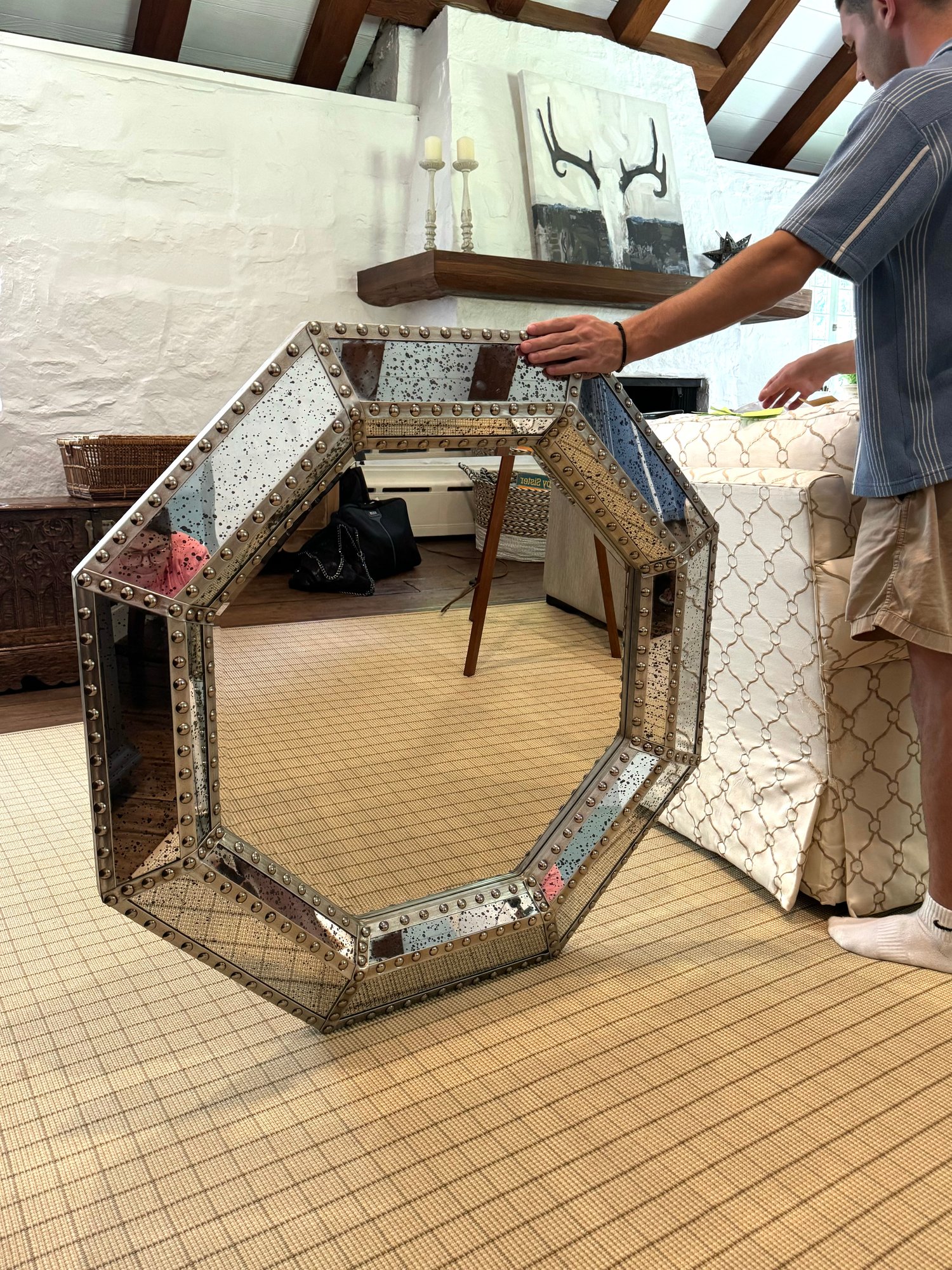 Good looking industrial style octagonal frame with a metal border frame with hobnail detailing. Mirror is a speckled antique style.