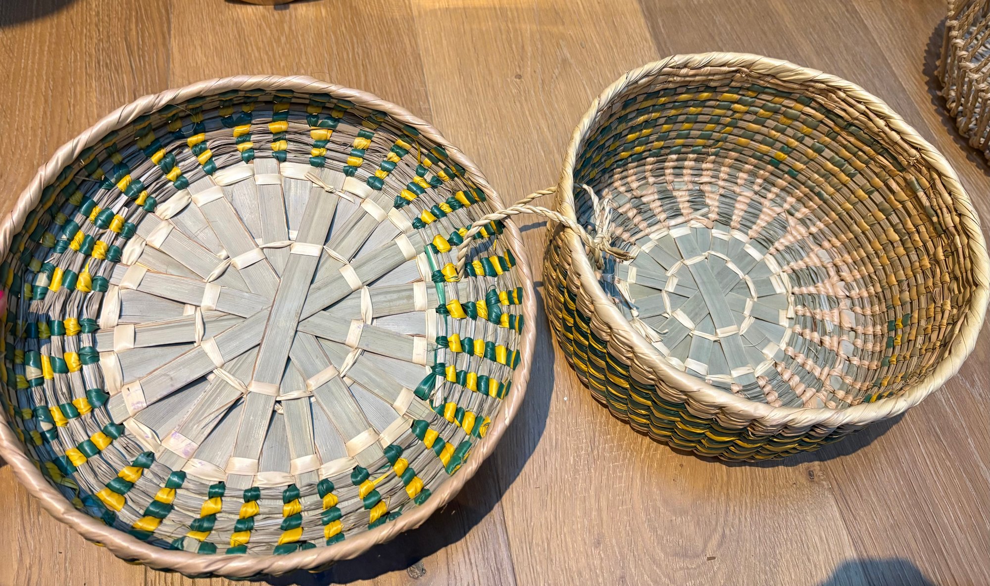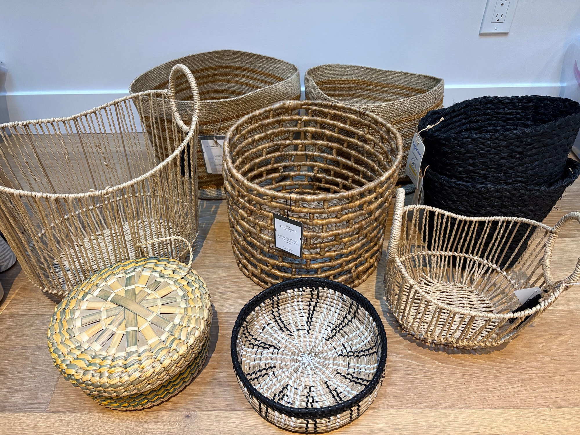 Nine natural fiber woven round baskets in varying sizes and colors