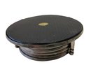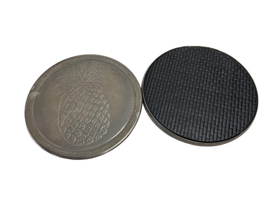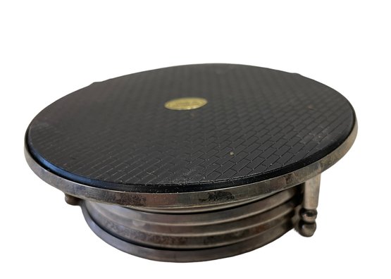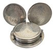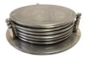 Six Etched pewter coasters in stacking stand.