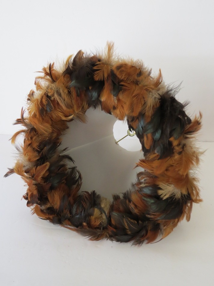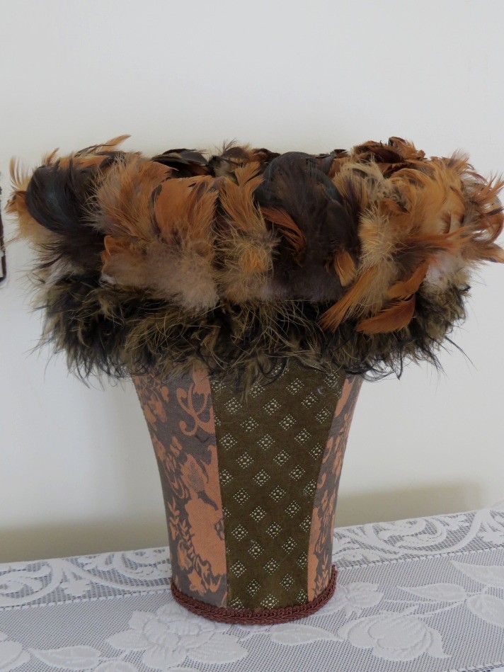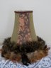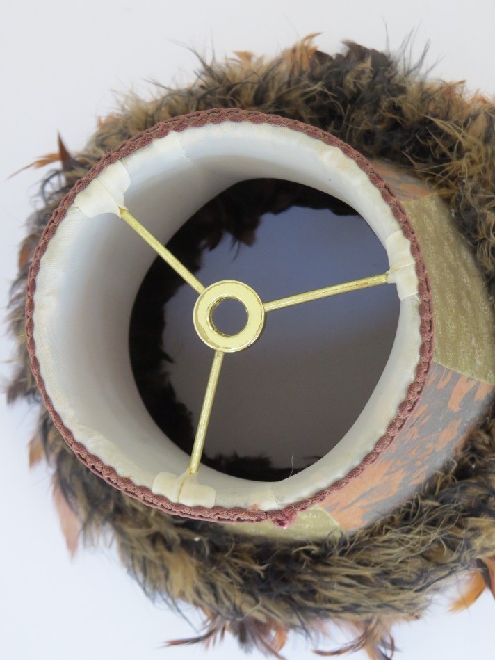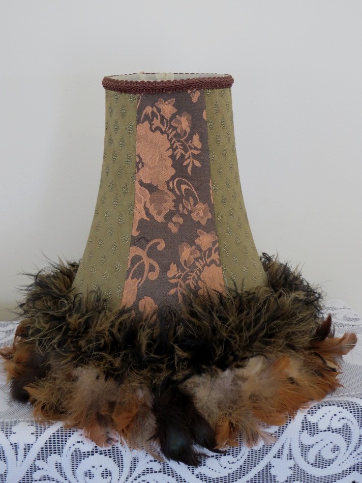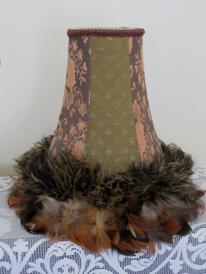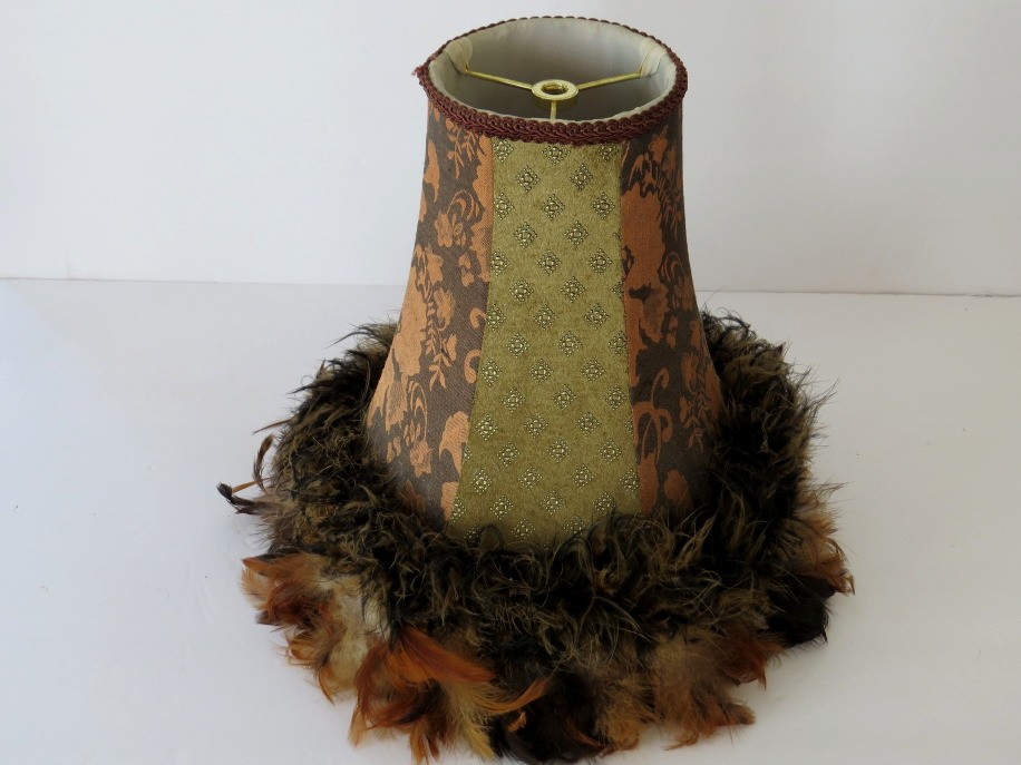 This boho lamp shade with feather trim, designed to add a statement decorative touch to any room, measures 12" tall. Two different cloth patterns are featured and blend very nicely with the various shades of brown feathers. The top opening has a 4 1/2" diameter with the bottom opening measuring 8" with the feathers adding an additional 2" on the outside rim. The shade has a harp mounting.