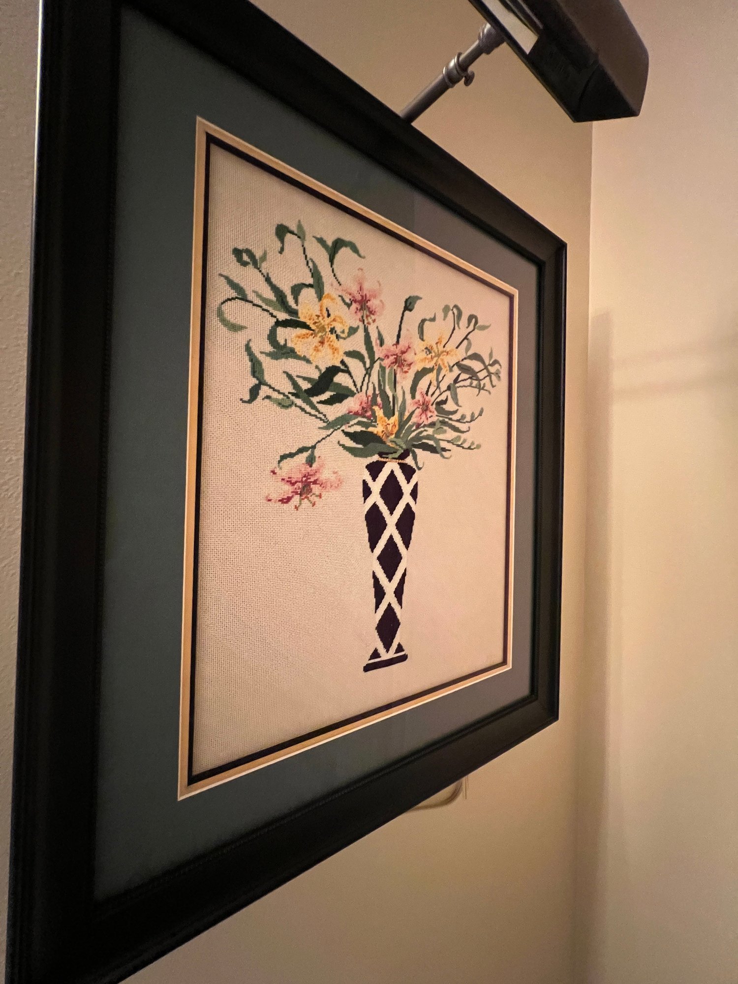 Needlepoint vase with flowers, with light