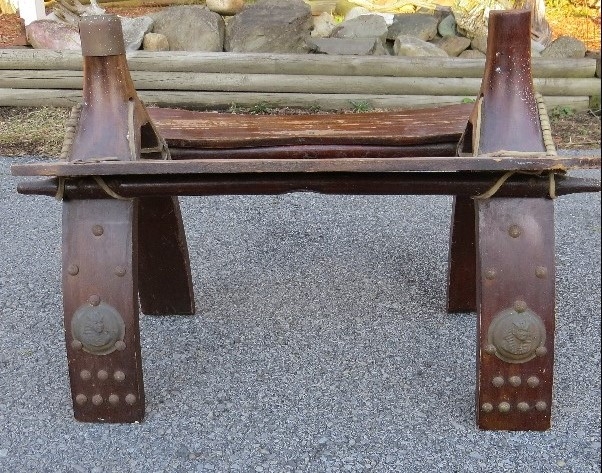 A highly unusual foot stool or saddle frame made of sinew and wood, designed to accommodate a small pillow for foot rest. Measuring 22" long by 11" high to the seat section by 12" wide. One brass end cap is missing, the other is present but a little rough. Has Egyptian Pharaoh or Tutankhamen brass embellishments. A true conversation starter pick the type of pillow or padding you wish to use and wheels up in style!