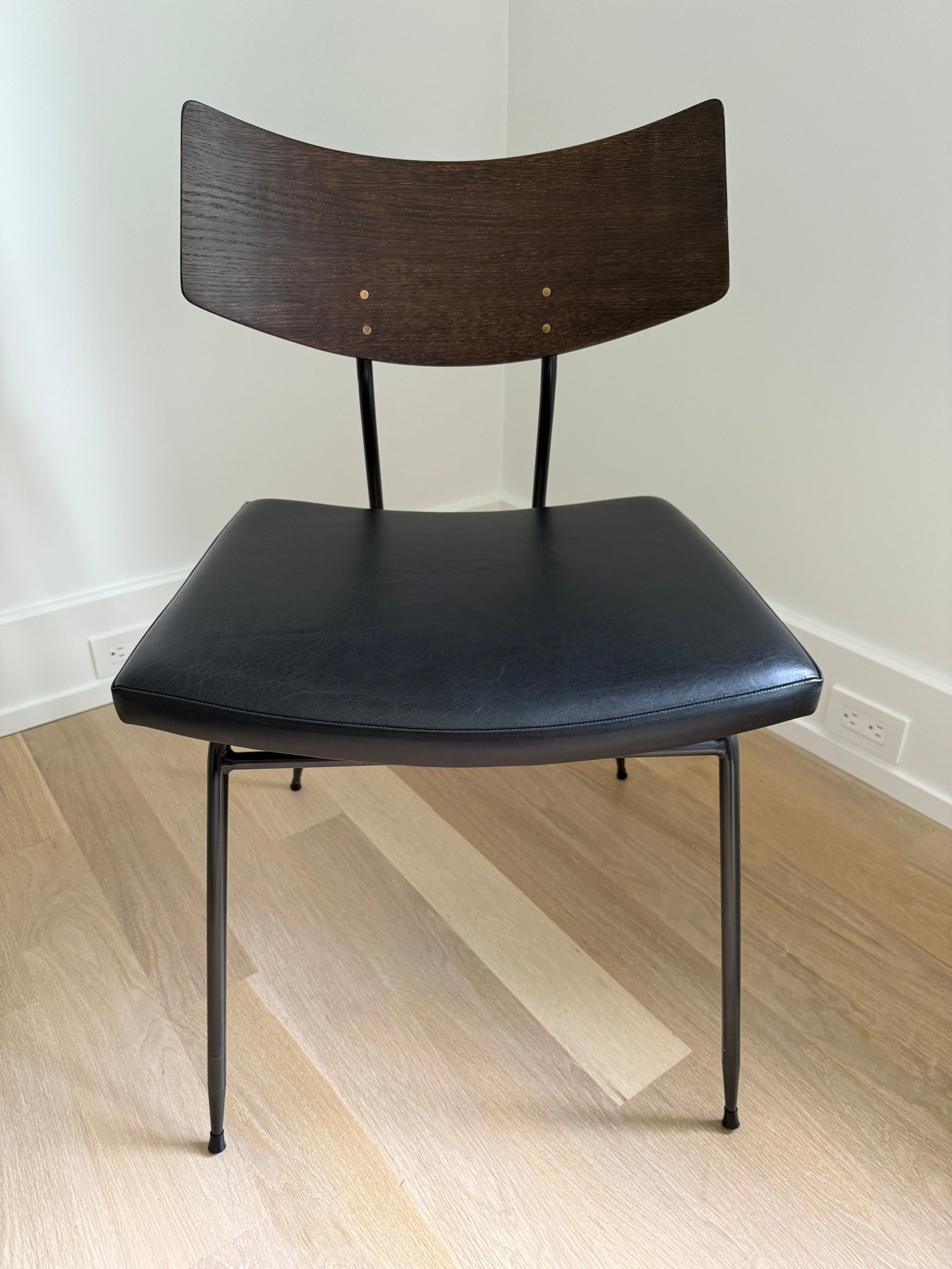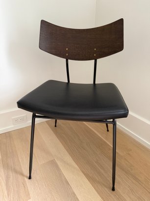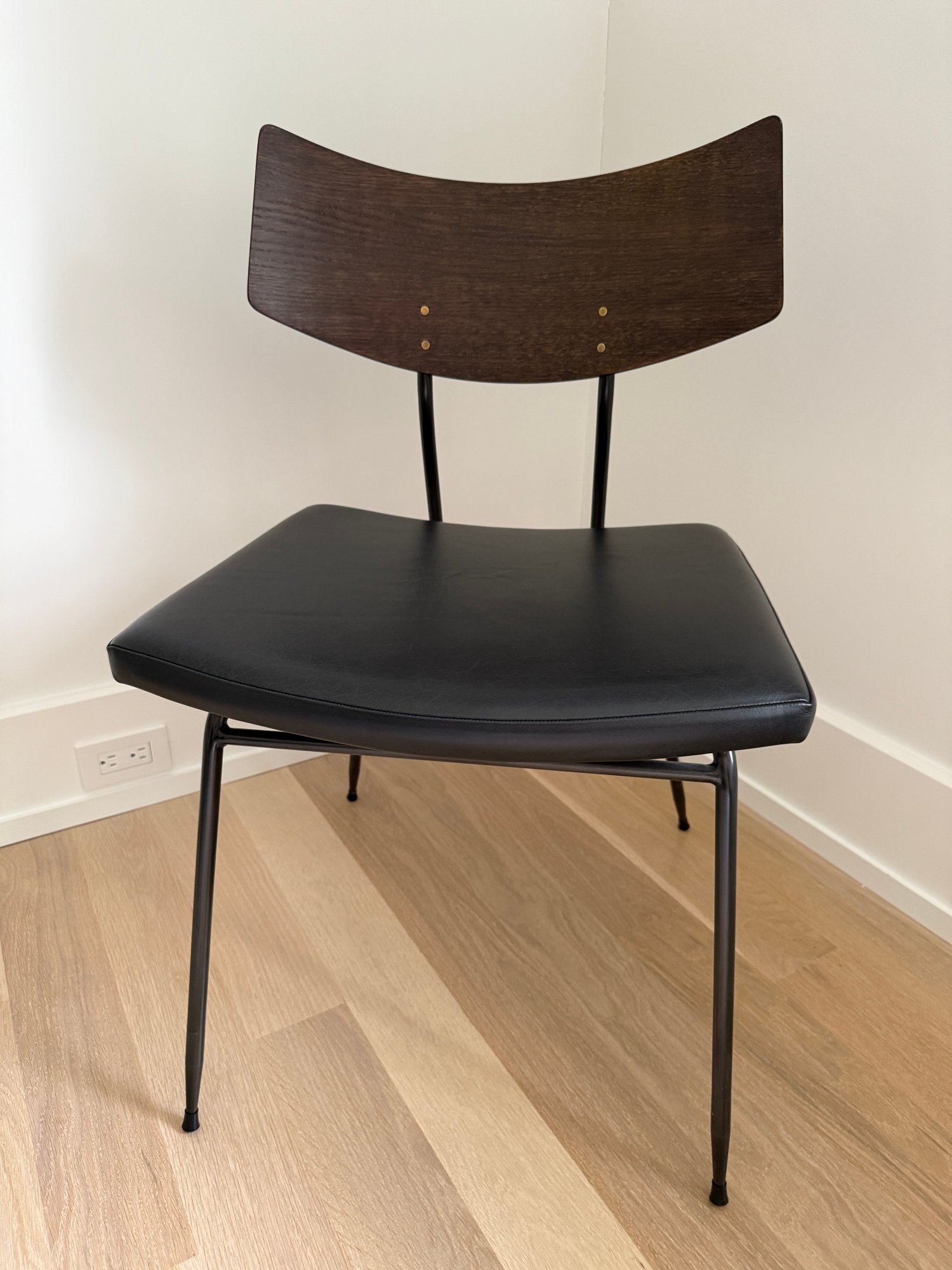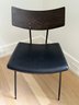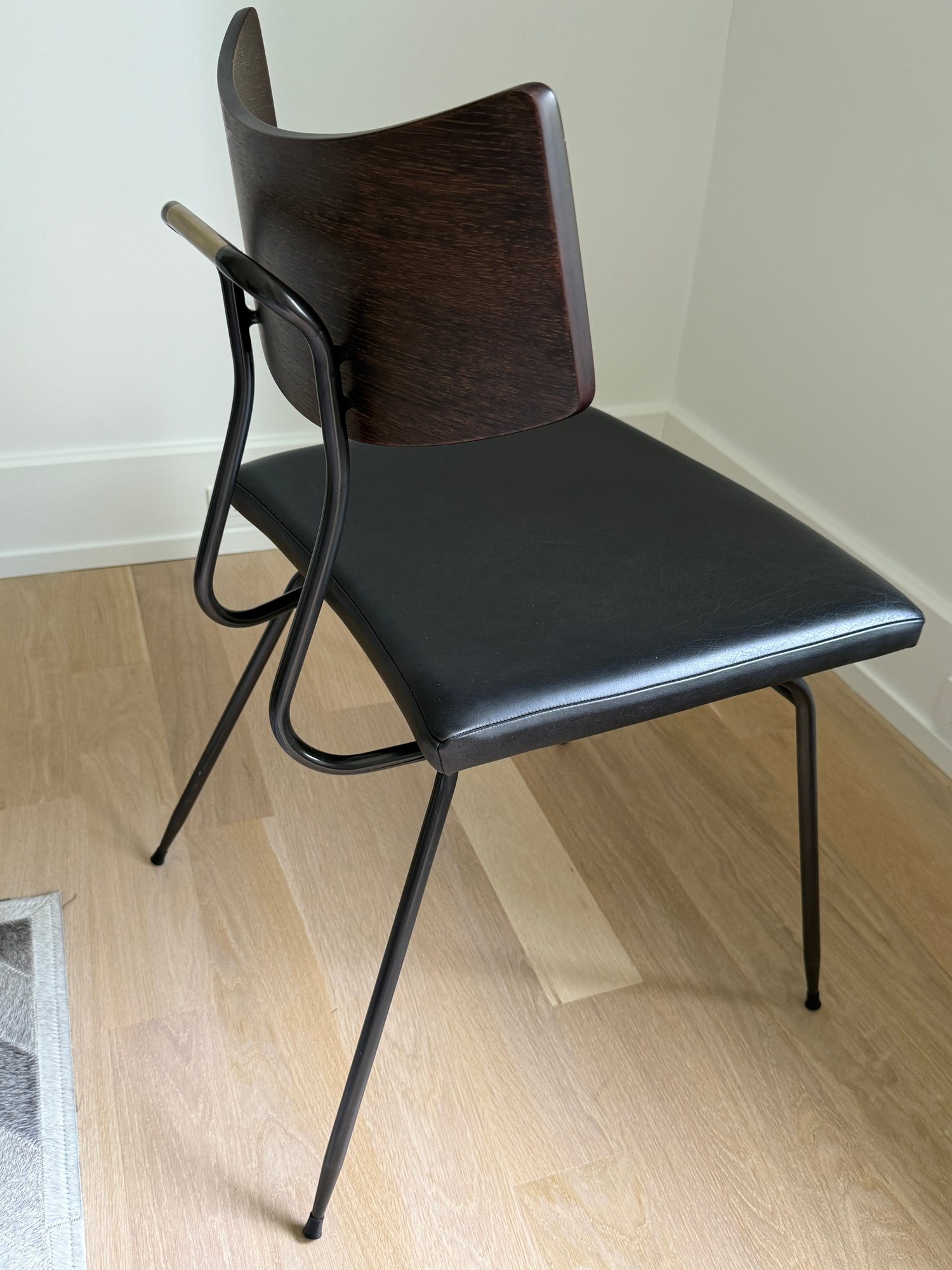 Fitted leather seat , tapered black steel, and a curved natural oak backrest.