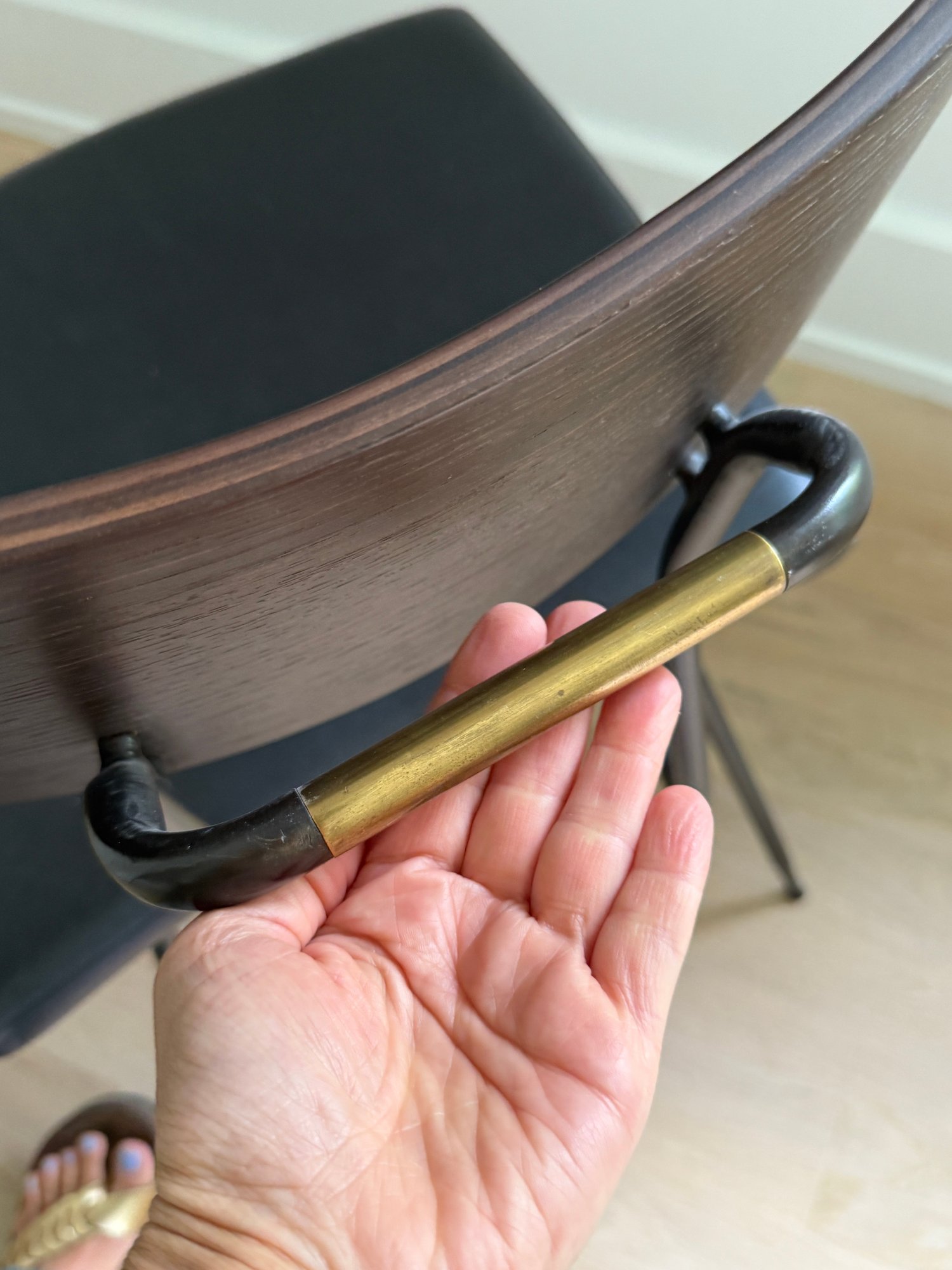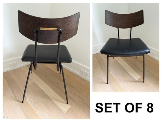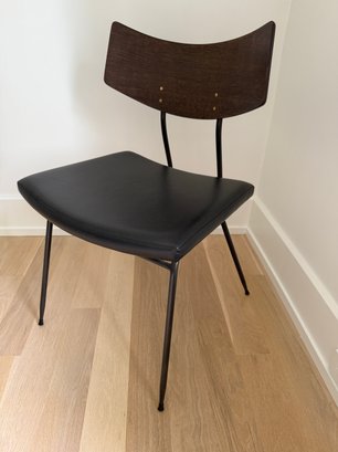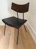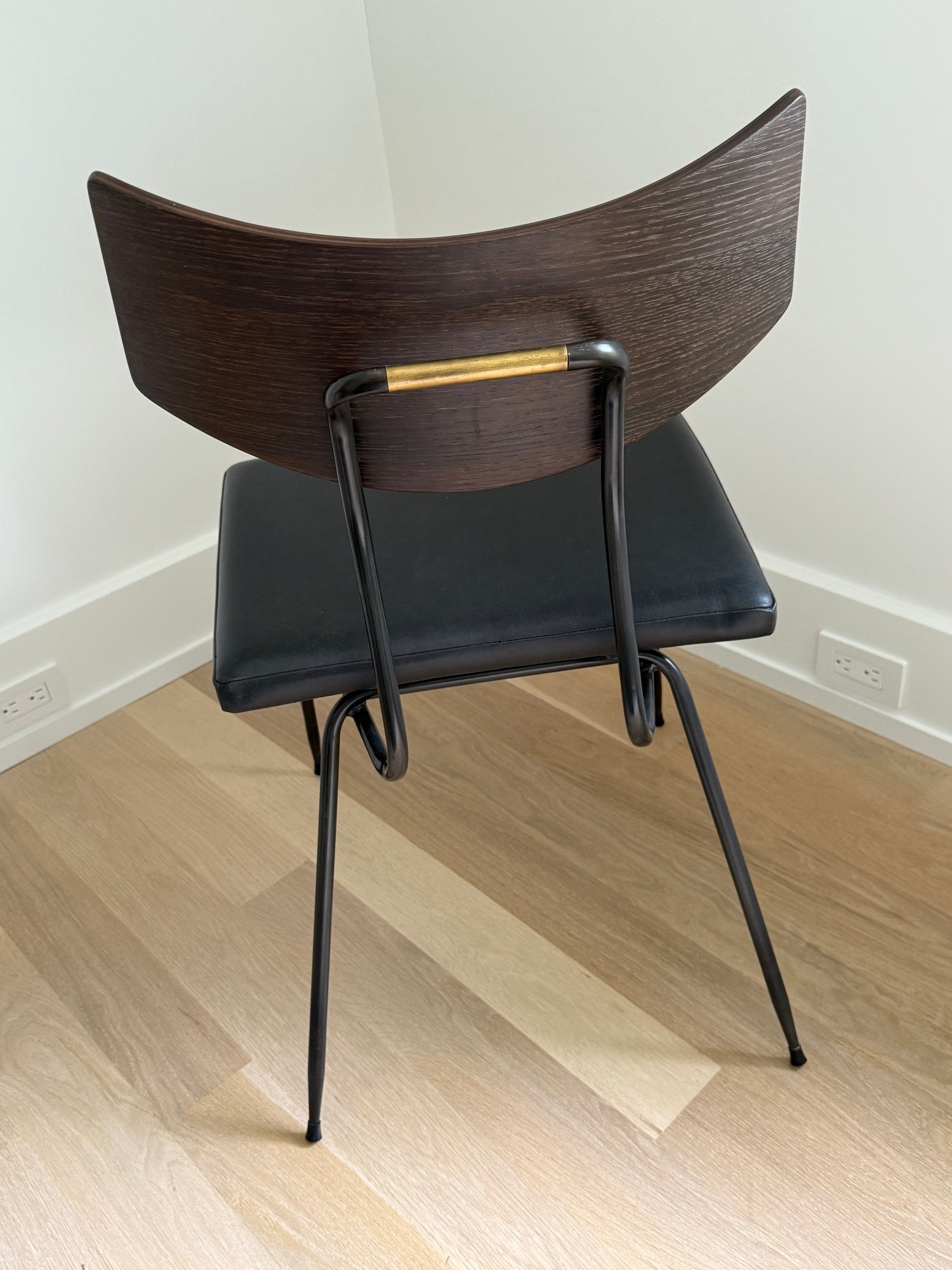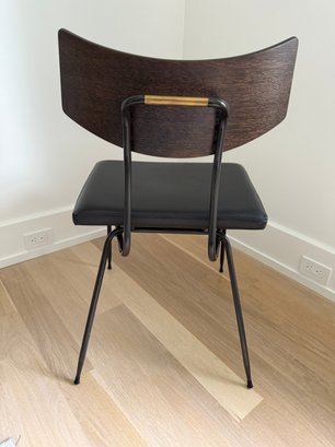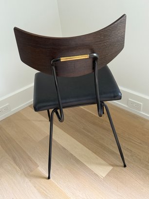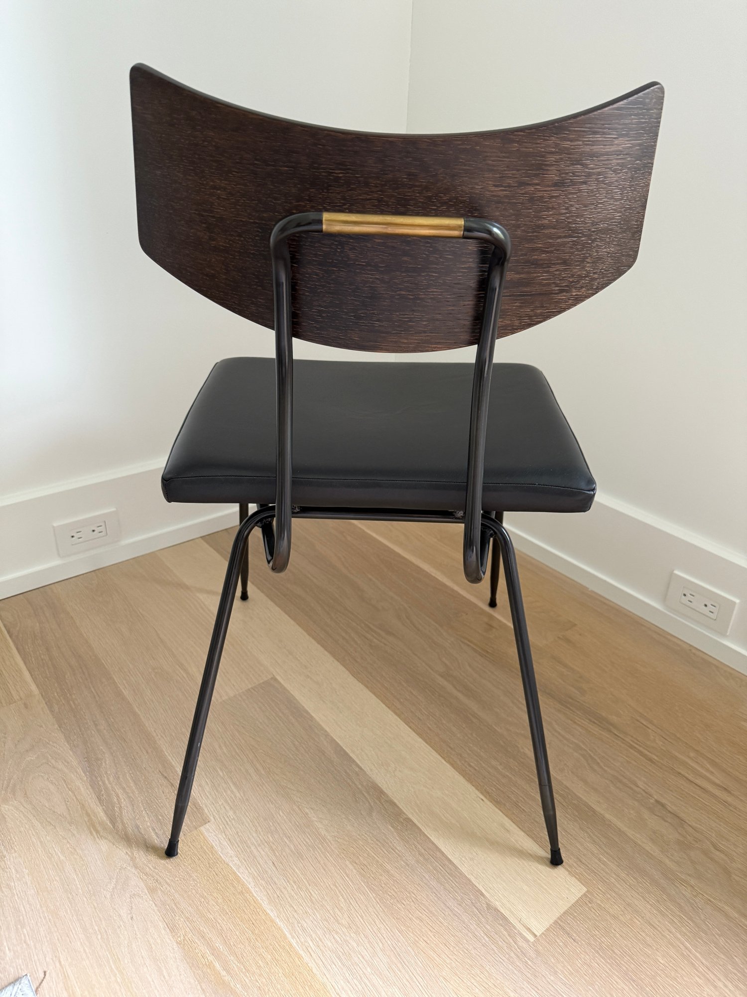 Fitted leather seat , tapered black steel, and a curved natural oak backrest.
