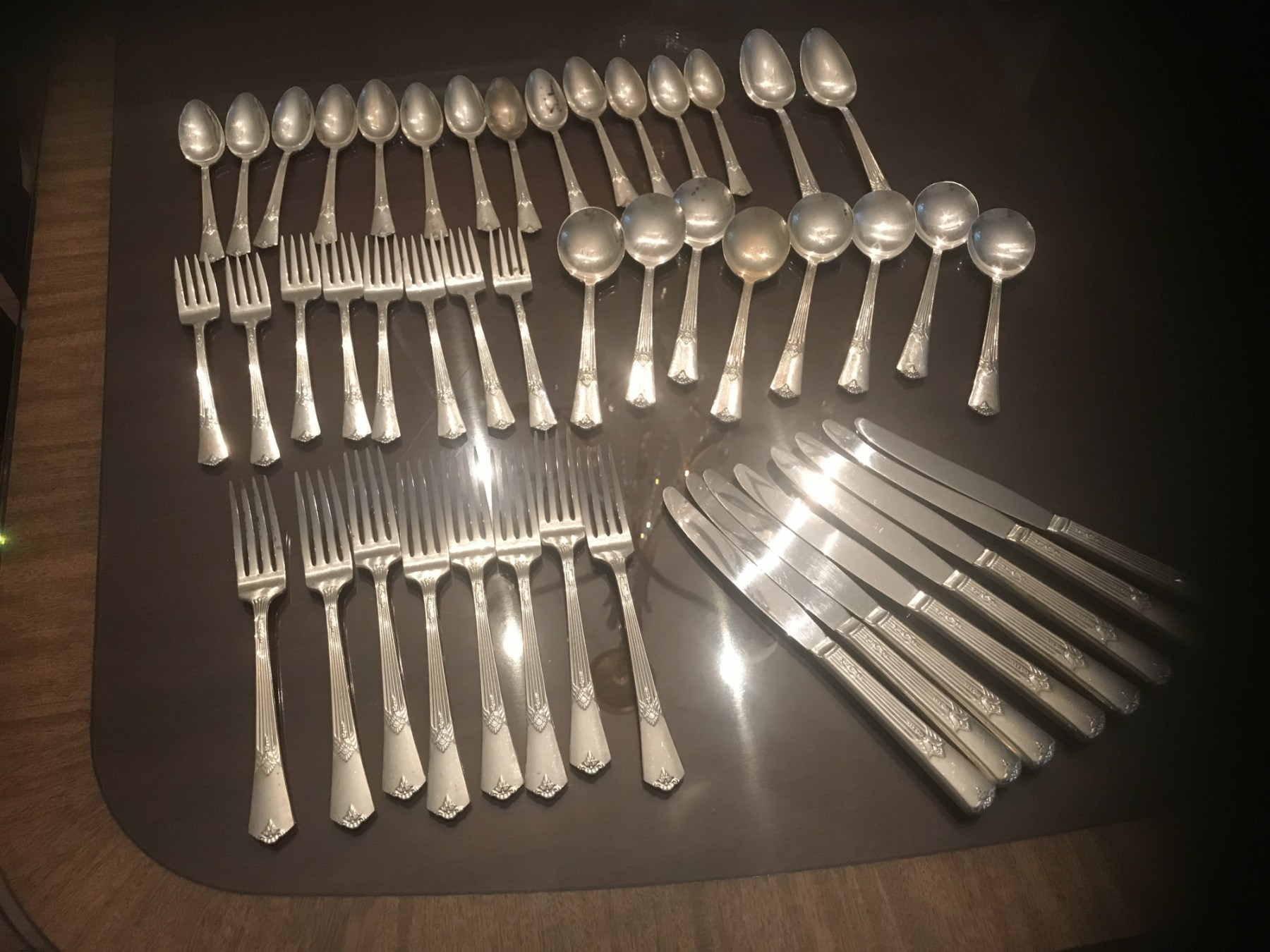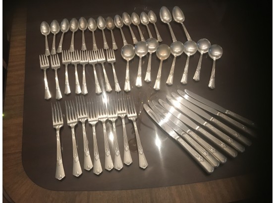 Eight piece place setting of William Rogers & Co in tarnish proof wooden box. Includes two serving spoons.