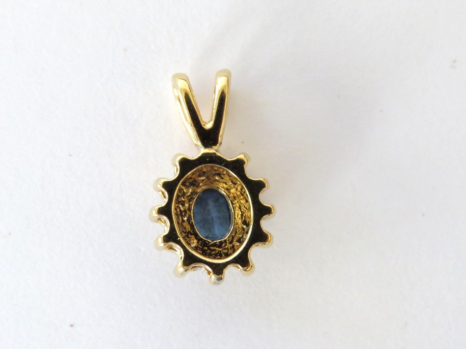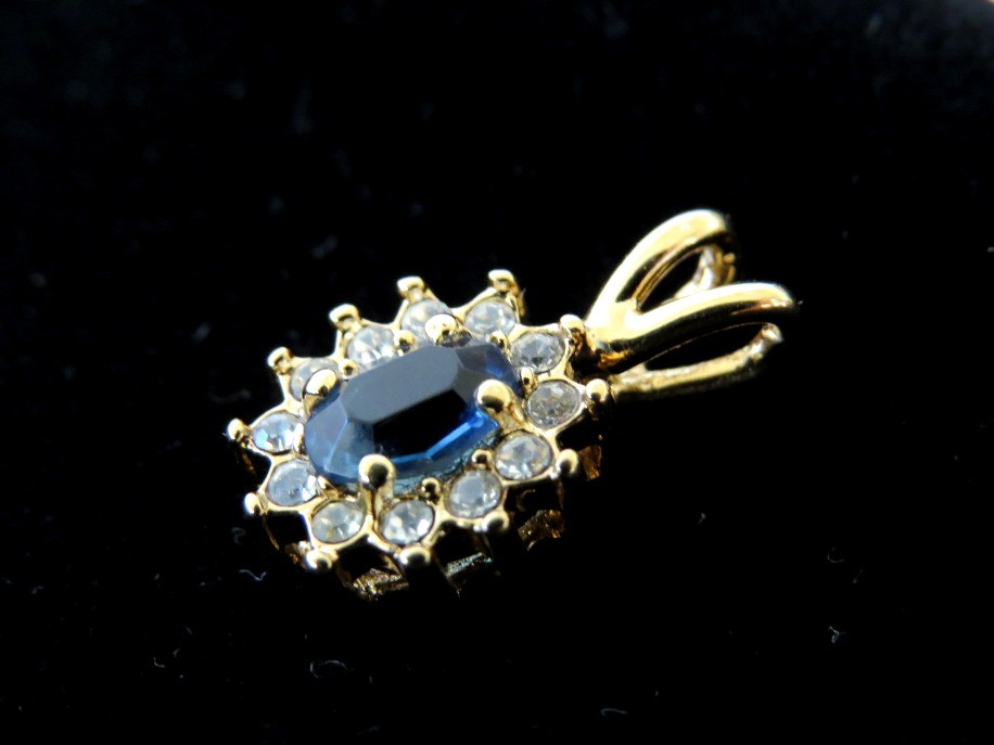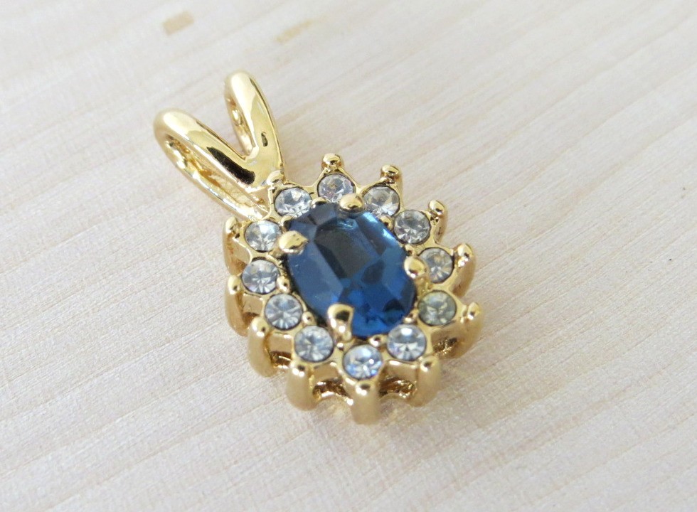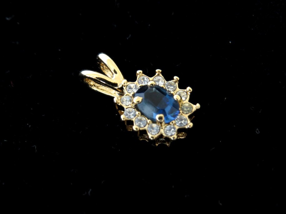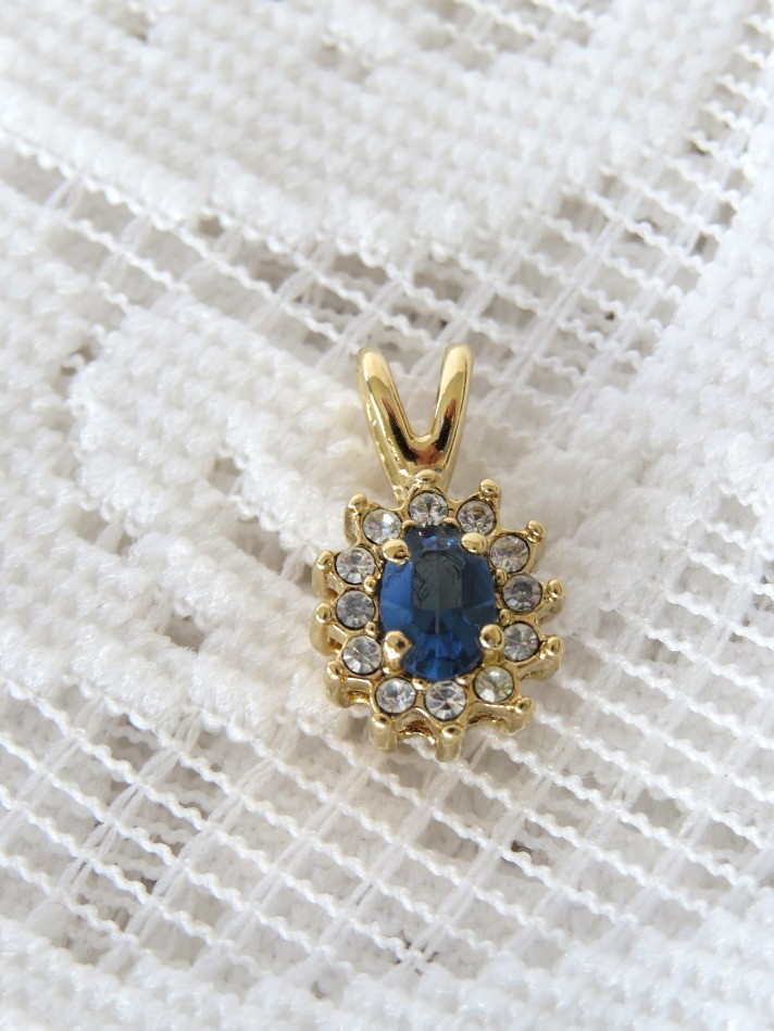 Elegant 10K oval pendant with blue sapphire centered stone surrounded by sparkling clear stones. Pendant measures 3/4" in length and has tested at 10K in the acid test.