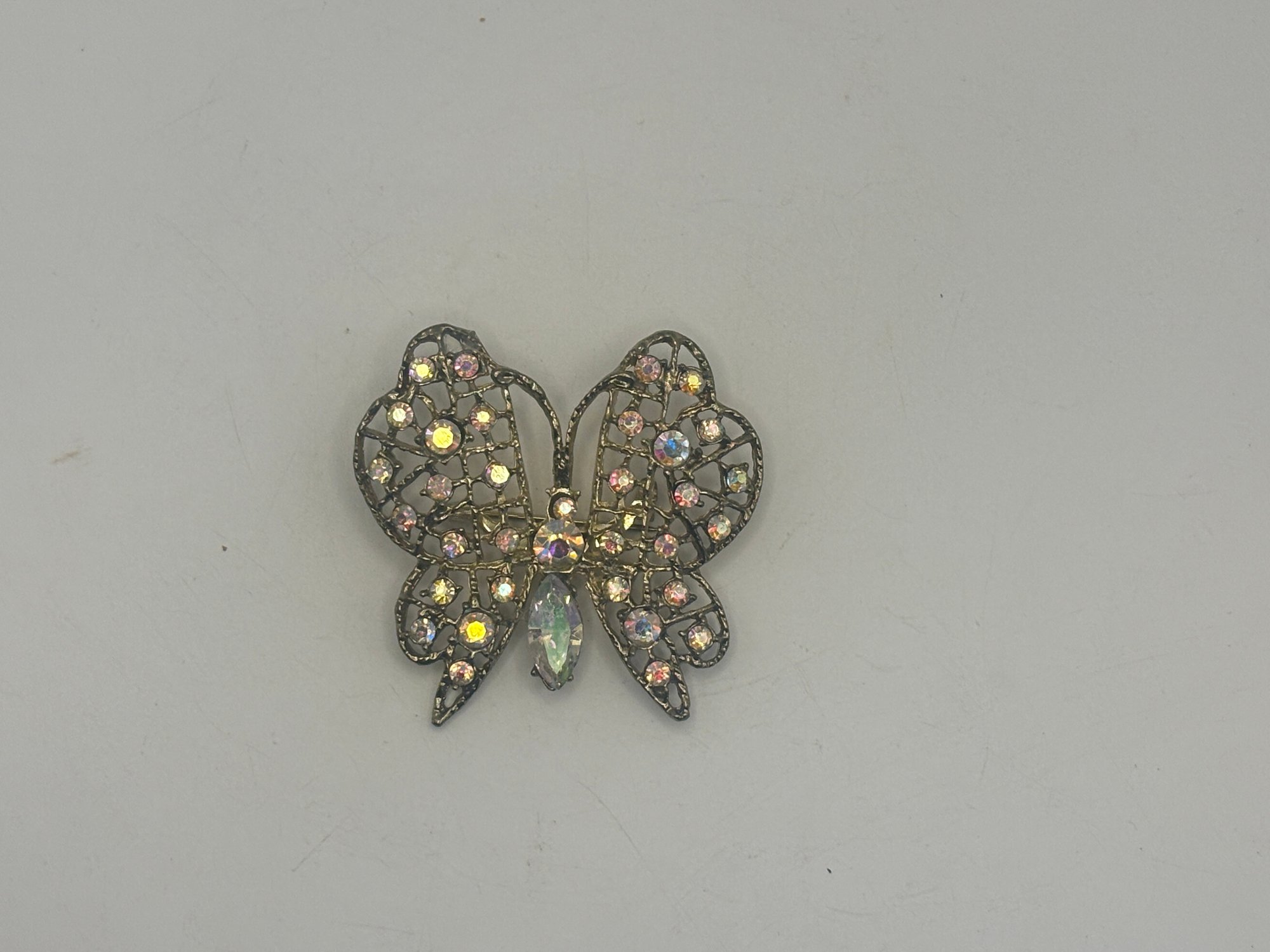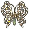 An elegant openwork butterfly brooch featuring intricate filigree-style wings accented with shimmering iridescent rhinestones in soft pastel tones. A marquise-cut center stone forms the body, adding a graceful vertical focal point, while the delicate latticework gives the piece an airy, lace-like presence.