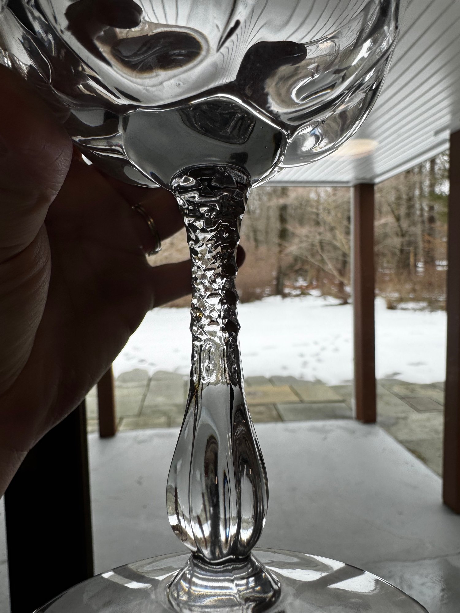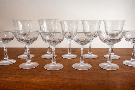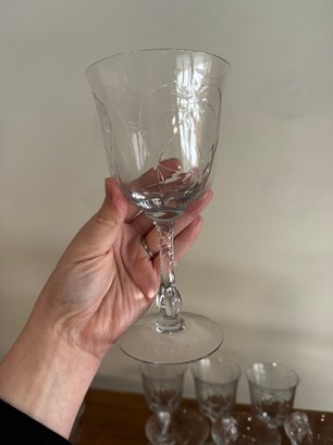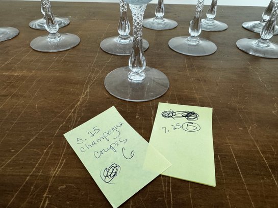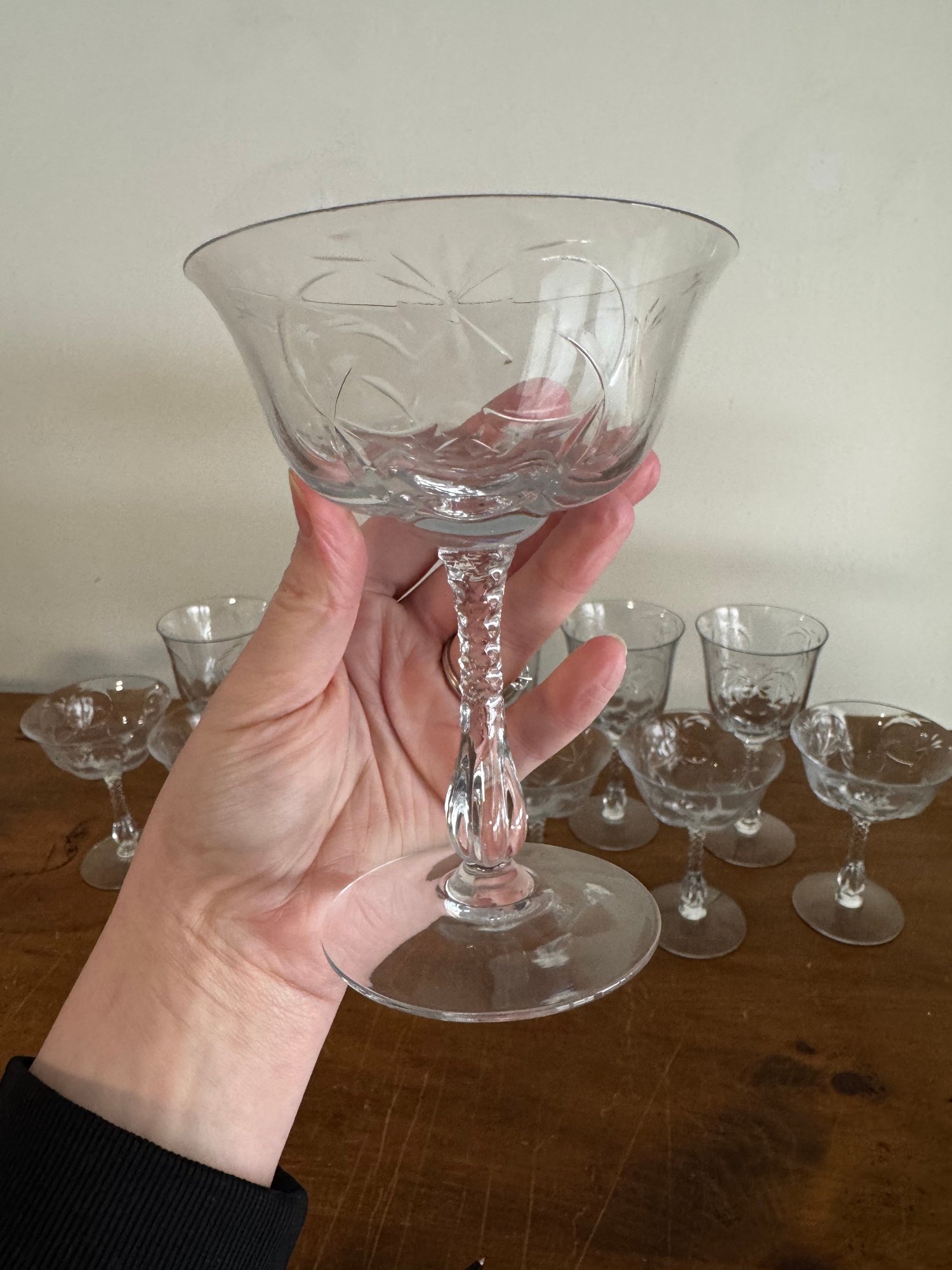 Pretty stemware to gift or collect, likely Libbey or similar - 6 champagne 5.25"H / 5 wine 7.25"H