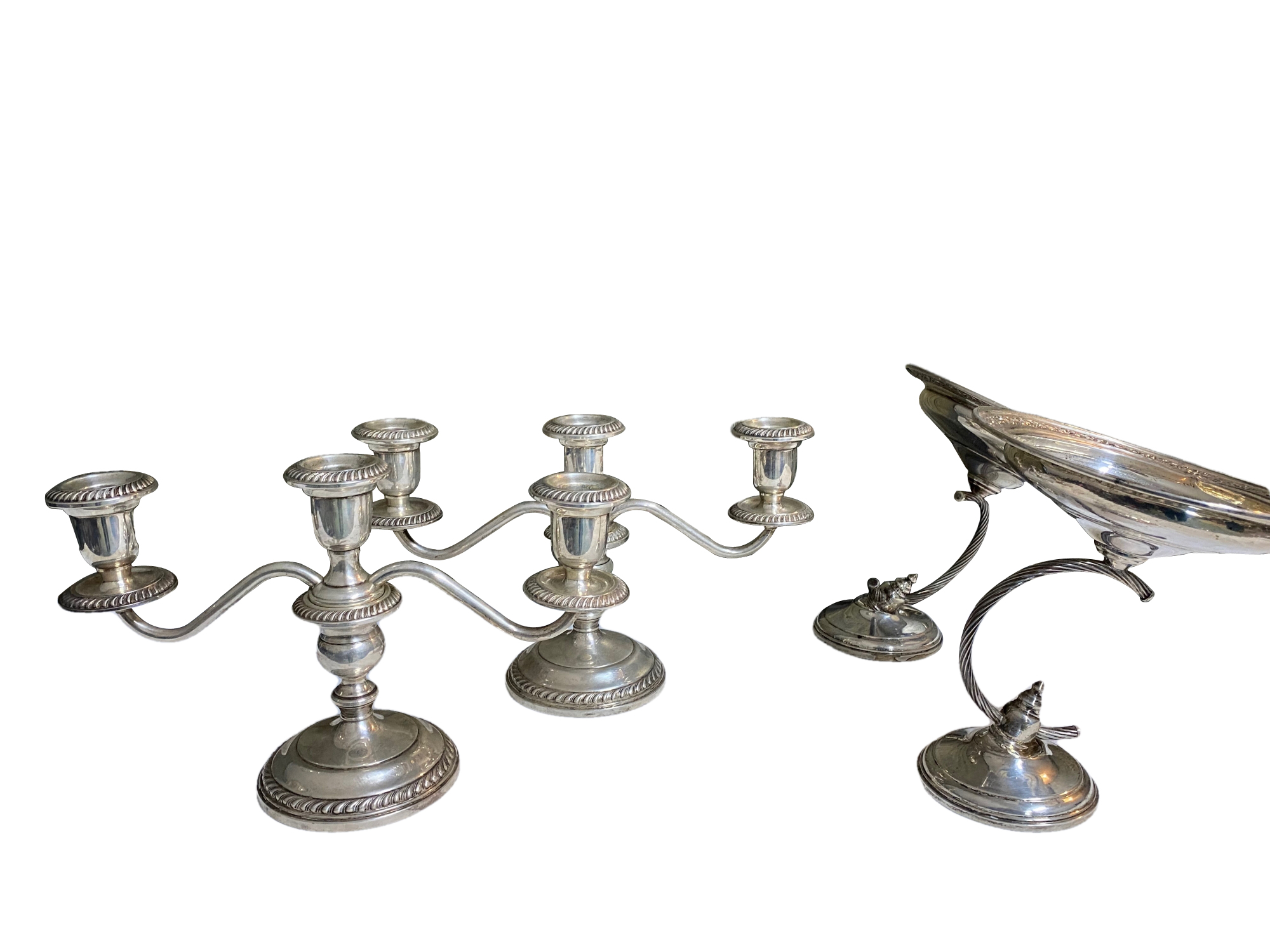 Elegant candelabras in good condition. One of the serving dishes is damaged at the base - see all photos.