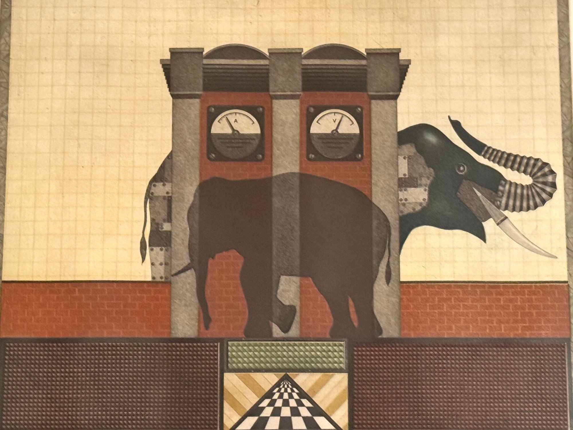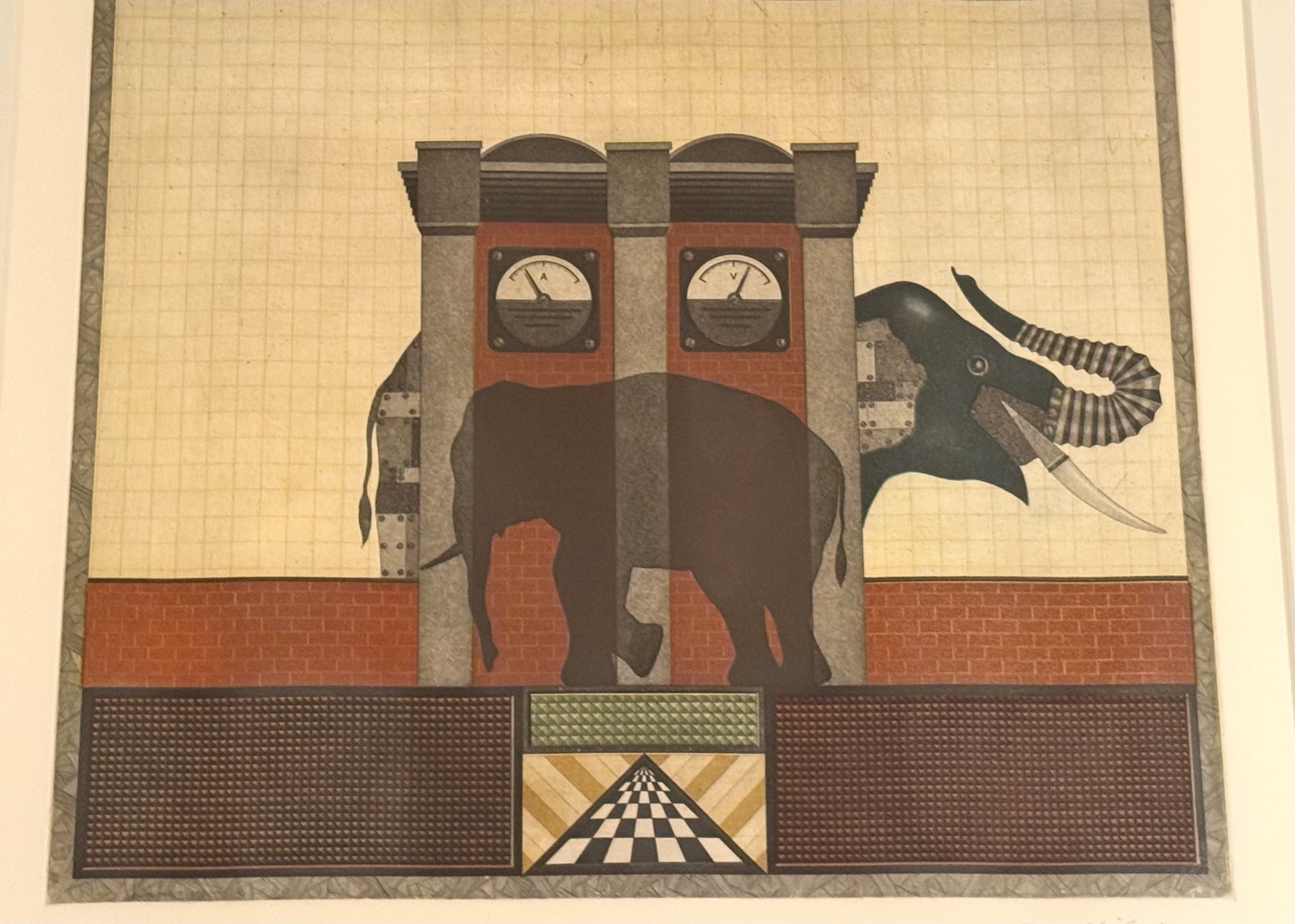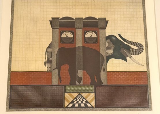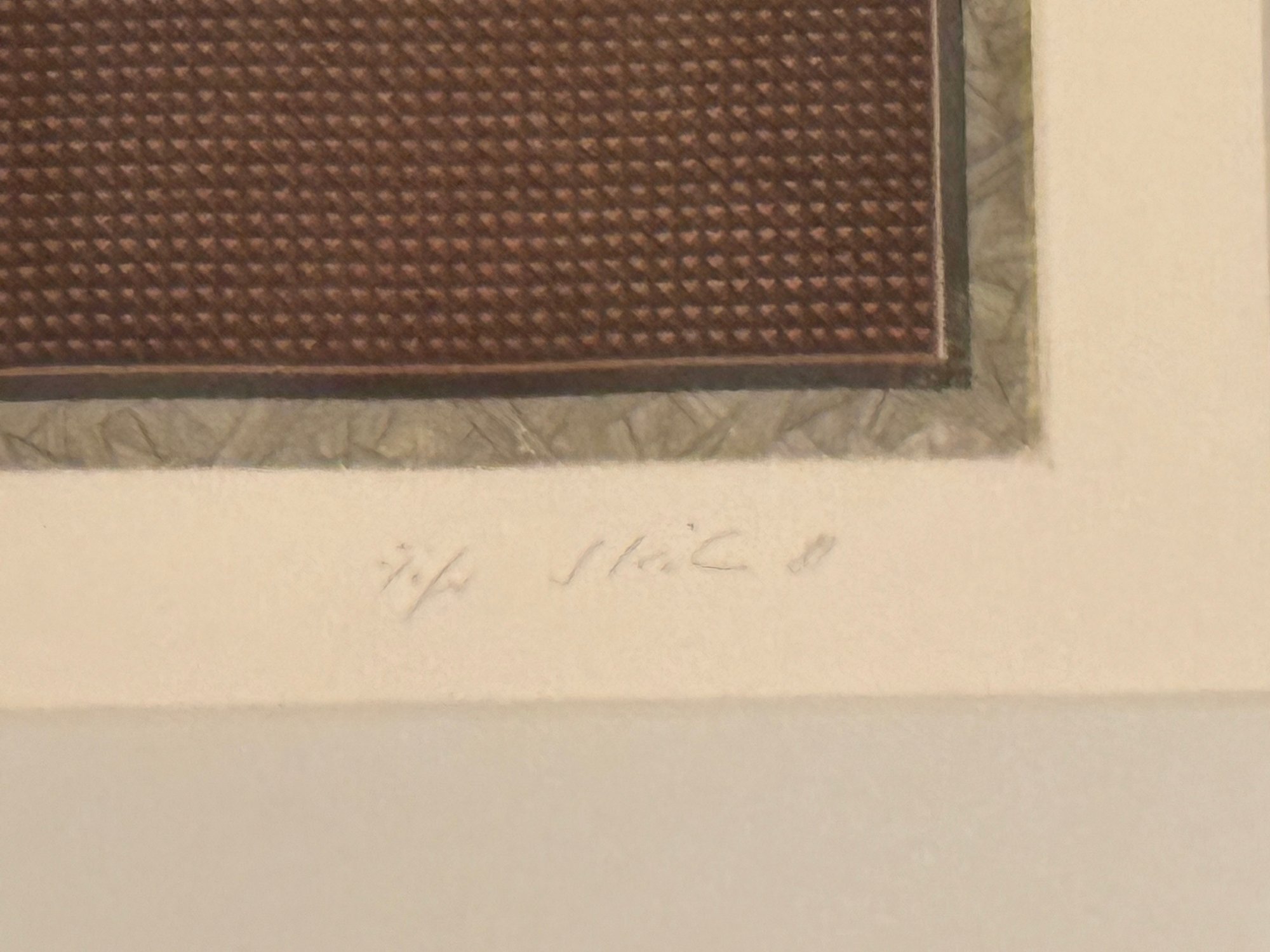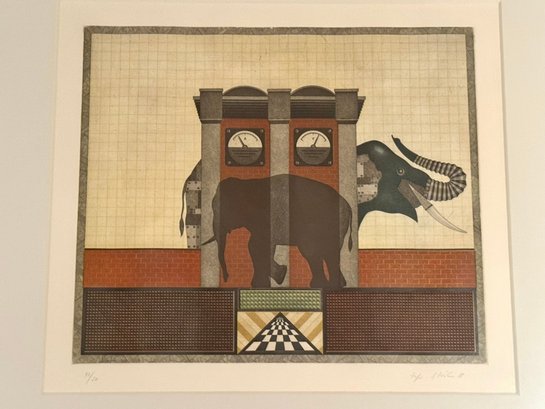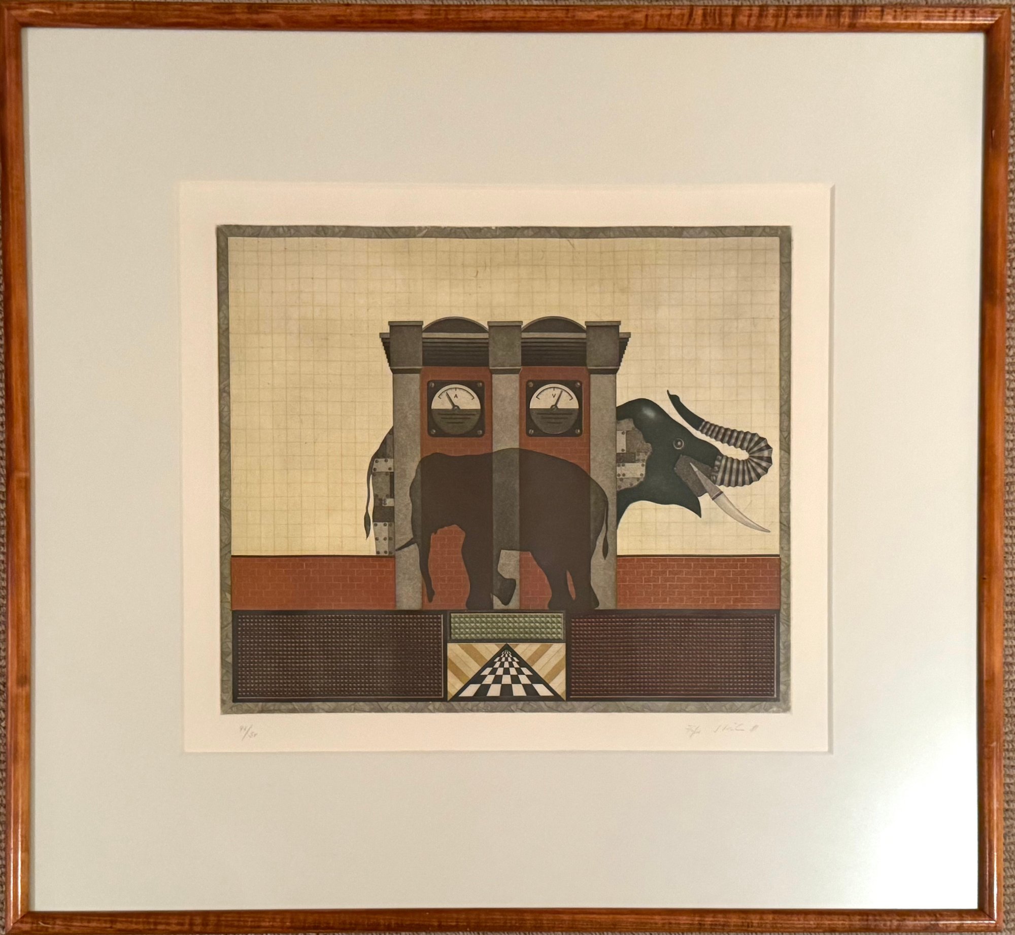 This wonderful colored etching is by Swiss artist Fifo Stricker. Born in 1952 Stricker gave up his law studies to pursue art and has continued to work in the art autodidactic style of the fanciful bizarre and surreal. He lives and works in Basel. Signed in pencil on bottom right corner and numbered 47/50 edition. Framed in a burlwood style wood frame under a deep beveled ivory matt. Size Approx 24 x 26