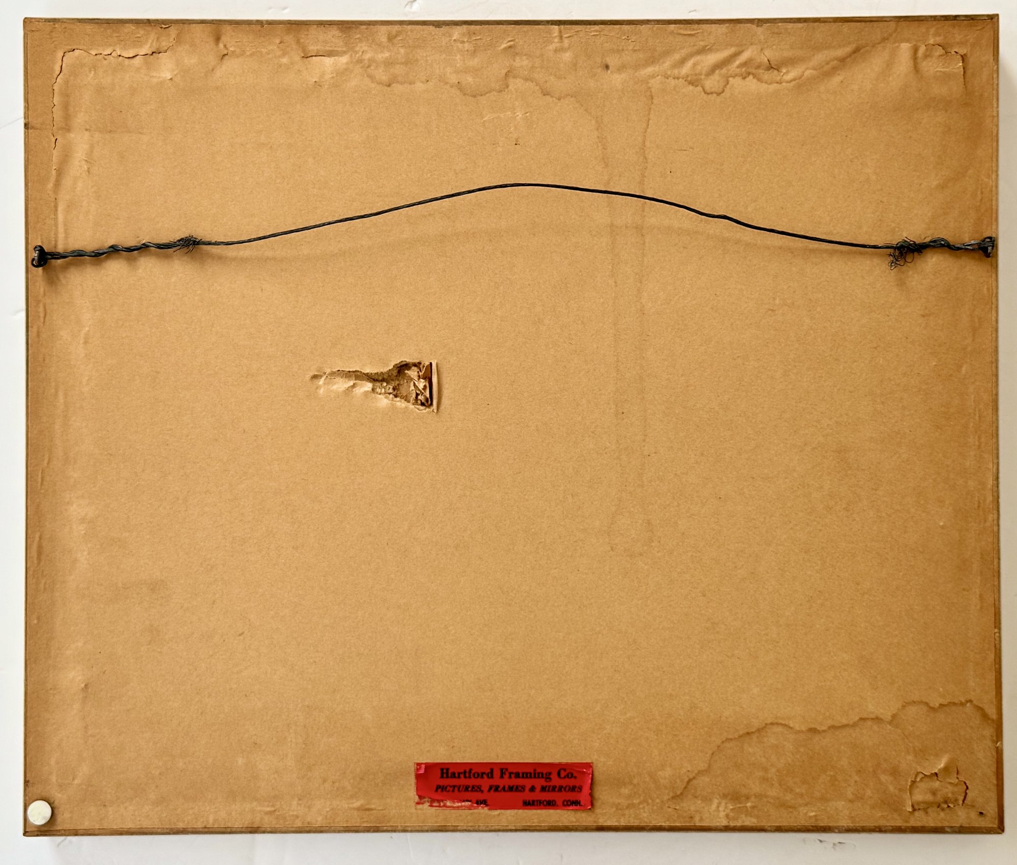 Professionally framed under glass with wide neutral mat and black frame. Back retains label from Hartford Framing Co., Hartford, Connecticut.