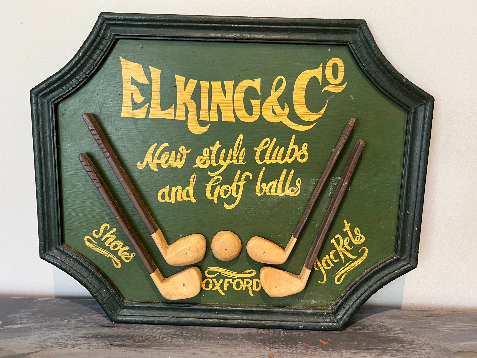 Vintage Elking & Co. golf clubs, balls and apparel green and gold painted wooden sign.