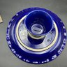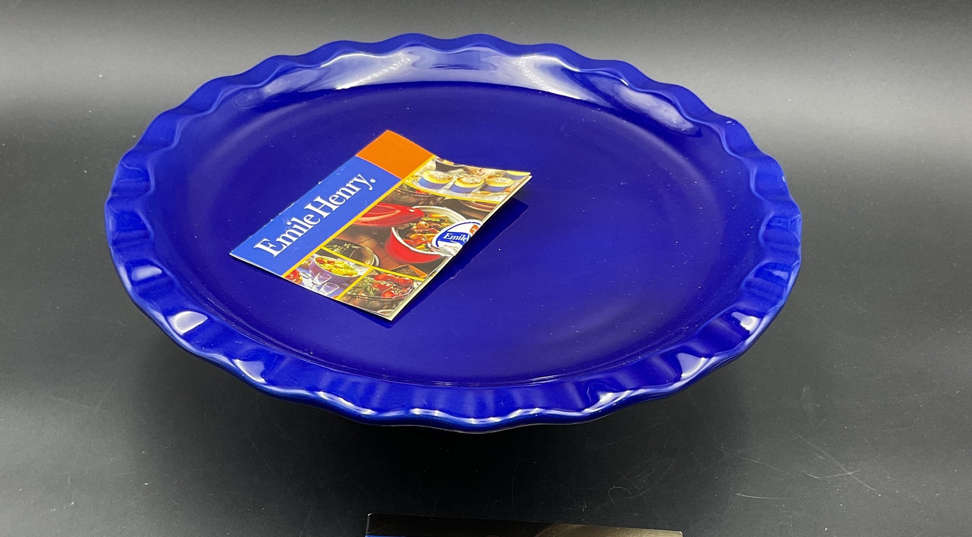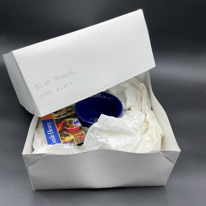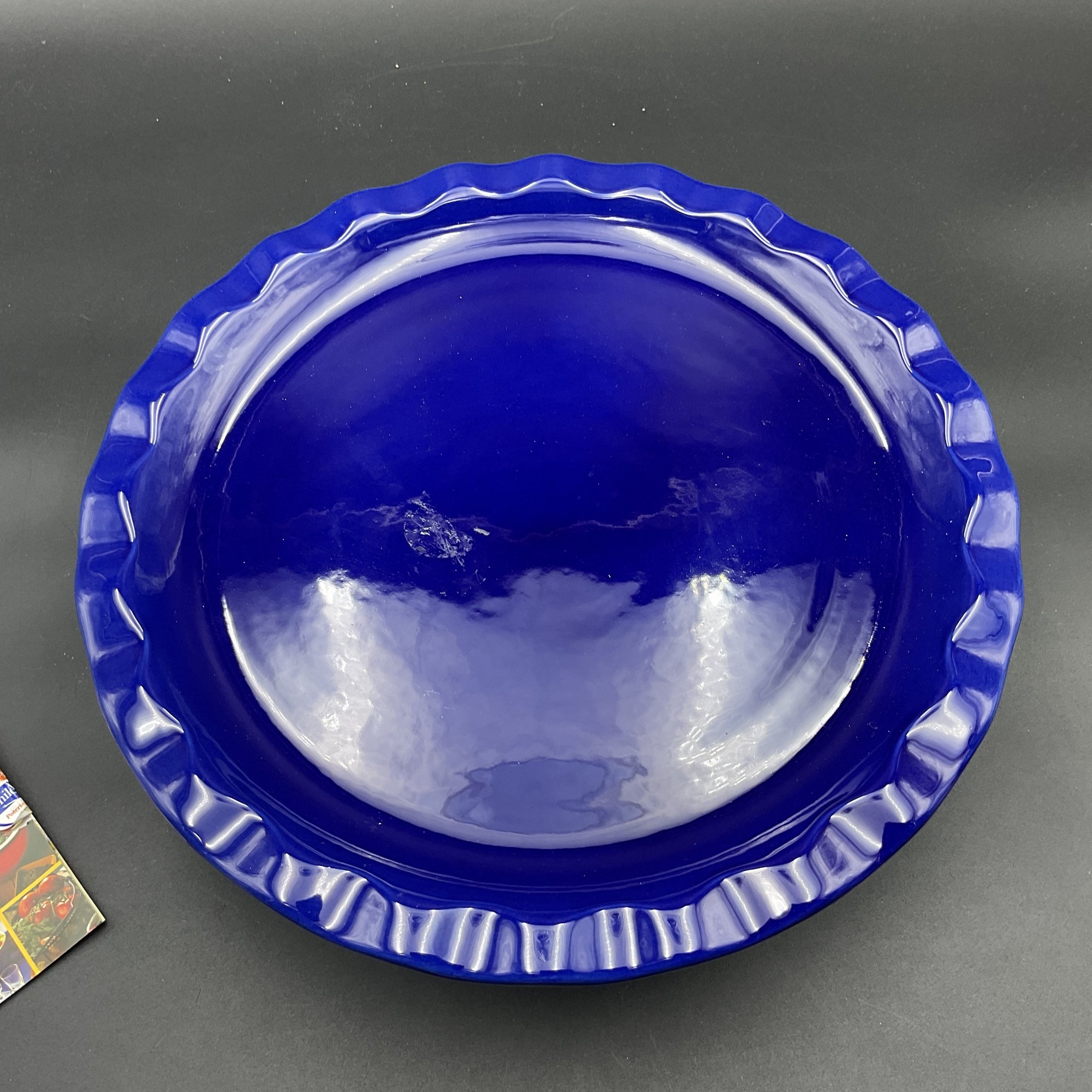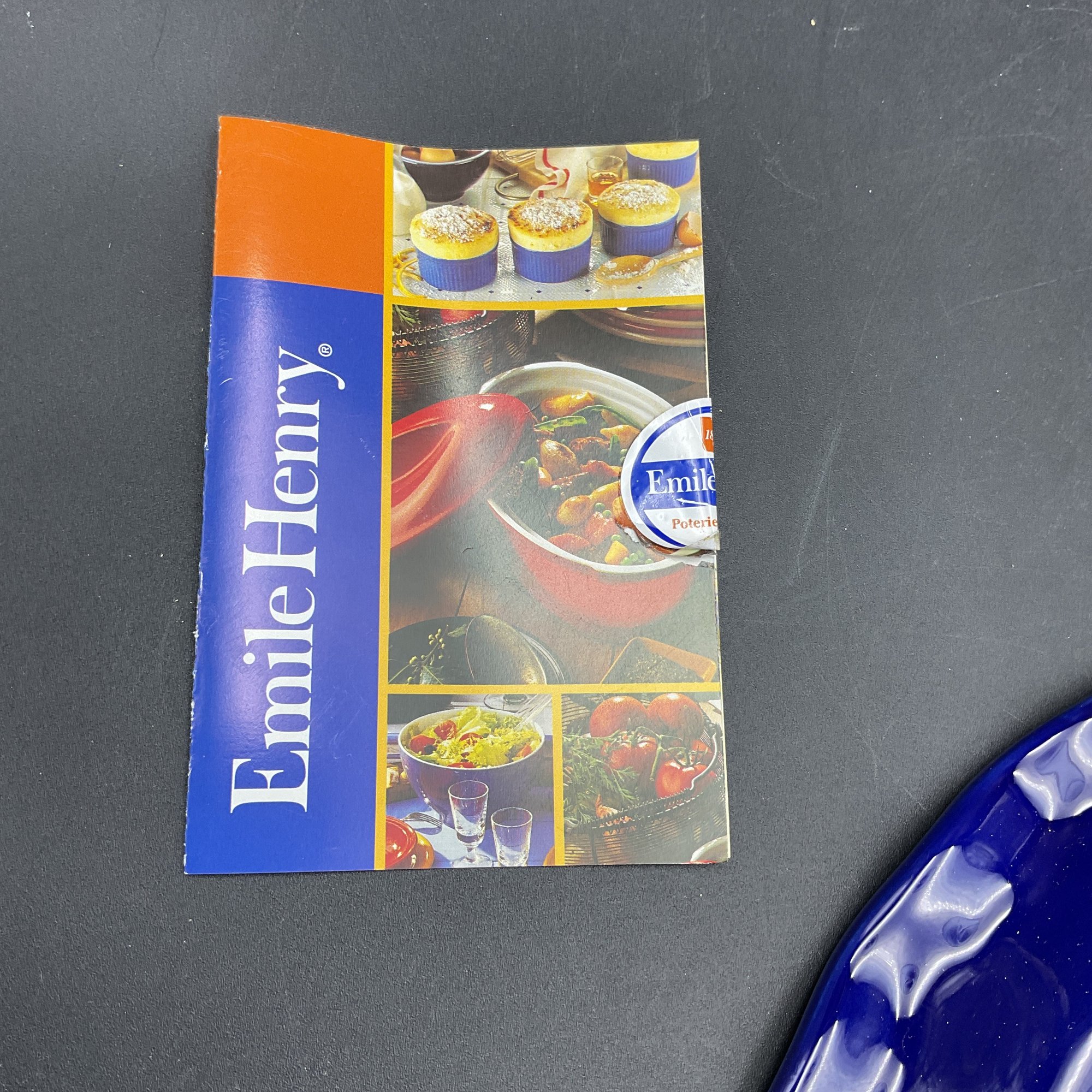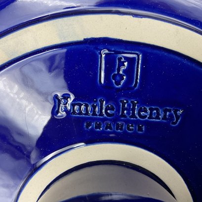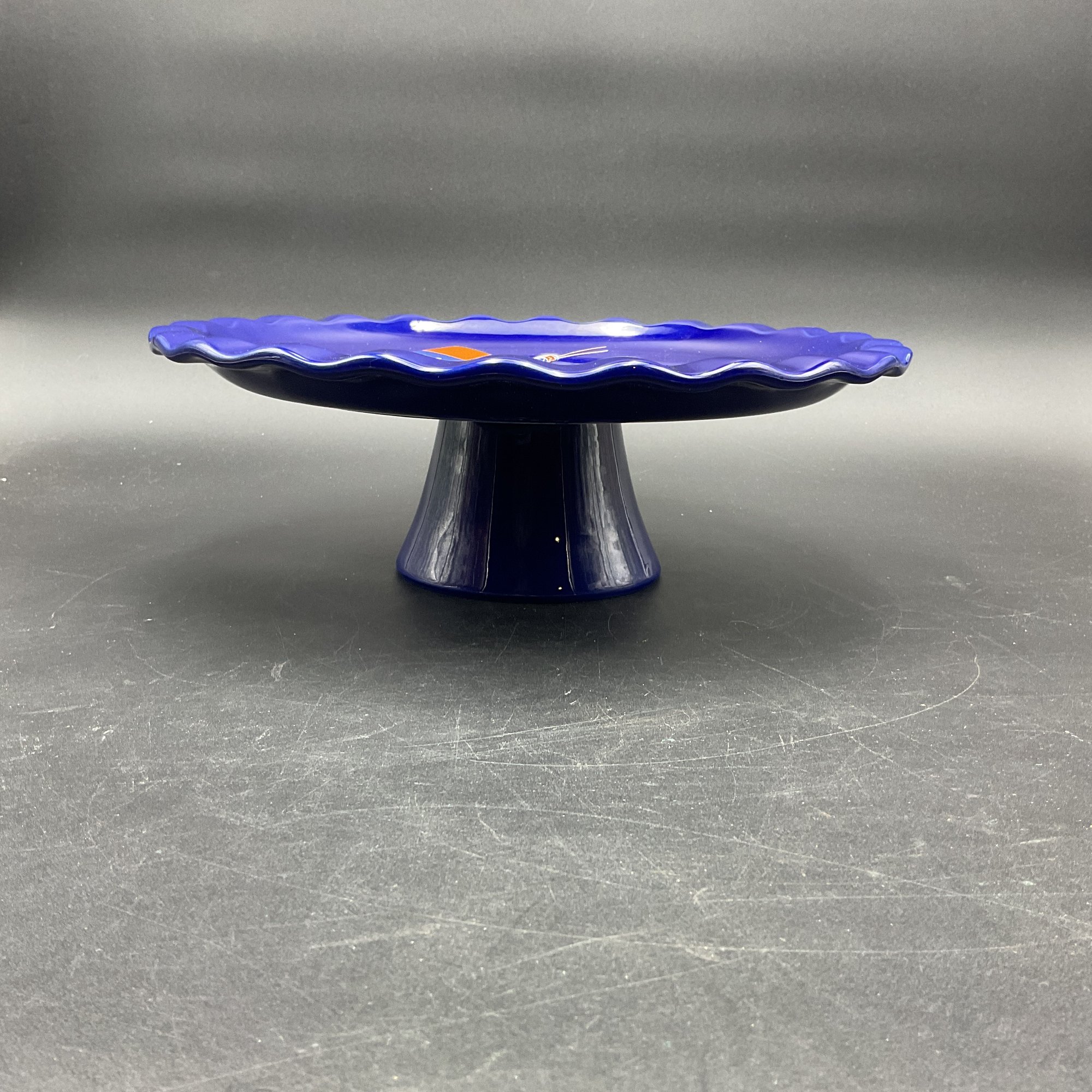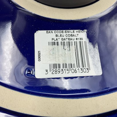 Gorgeous cobalt blue cake stand from Emile Henry in excellent condition. Still in original box with sticker on the underside and paperwork. Since there is also sticker residue on the top, we believe this has never been used. Dramatic and beautiful with timeless style and appeal.