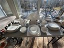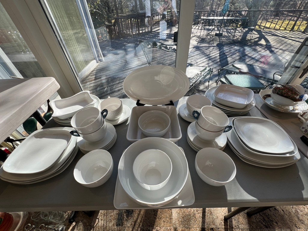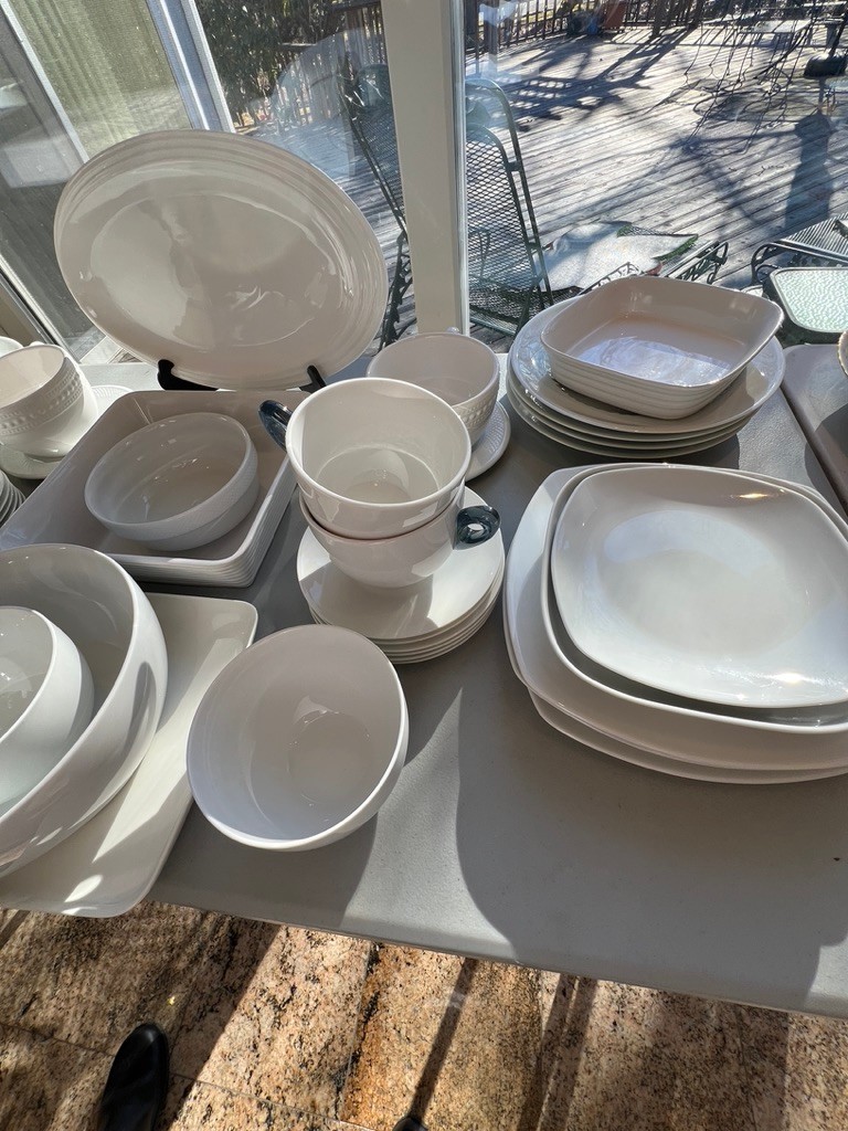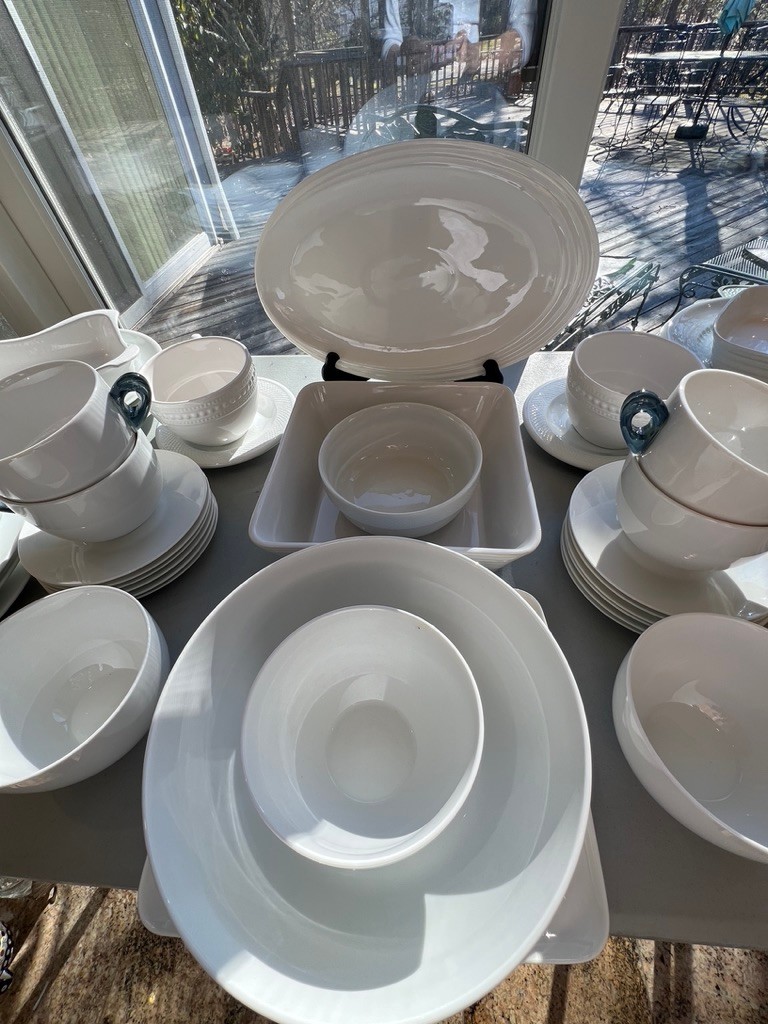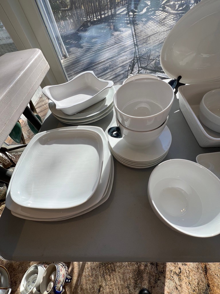 generous white plates, serving dishes, cups, baking dishes, lovely lot, WHITE