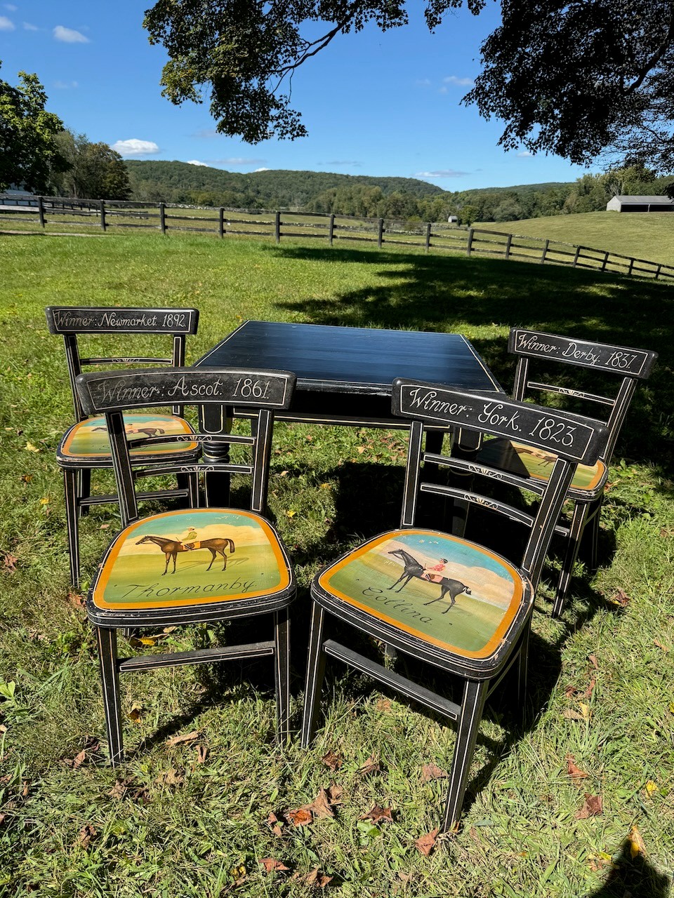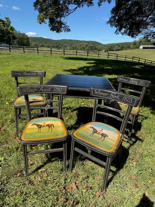 Wooden. Handpainted and decorated. Chairs represent-- Winner. Ascot. 1861, Thormanby; Winner: York. 1823, Collina; Winner: Derby. 1837, Phosphorus; and Winner: Newmarket. 1892, St. Serf. See photos for condition. 30" x 30" x 28.75" H
