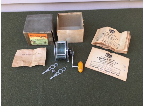 Penn Master Mariner No. 349 Deep Deep Fishing Reel in Original Box. Buttrtscotch Handle. Two 32 Page Instruction Manuals. Catalog No 22. Two Penn Wrenches and Extra Handle Thumb Screw. Penn Fishing Tackle Mfg. Co. Envelope and Original Box. Reel is in Excellent Used Condition. See photos for box condition.