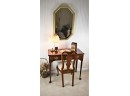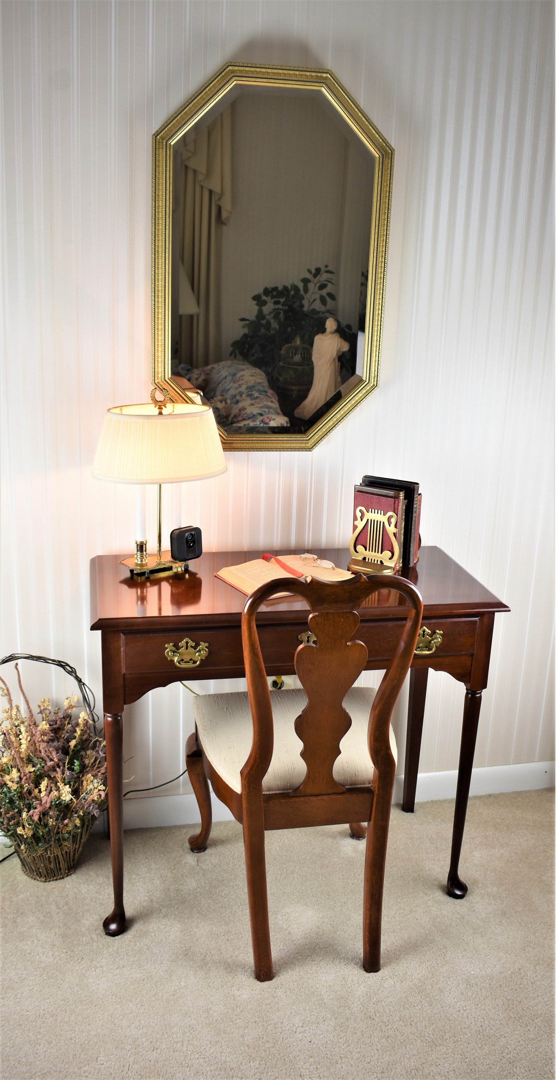 Great quality piece with a single dovetail made drawer for storage. Excellent condition 34"x 16"x 30". Chair has 16" seat height and a 35" tall back. Has one light imperfection on desk top. Have to look hard to see. See photo. Contents not included.