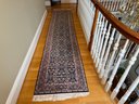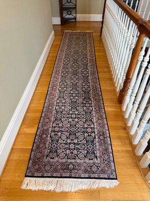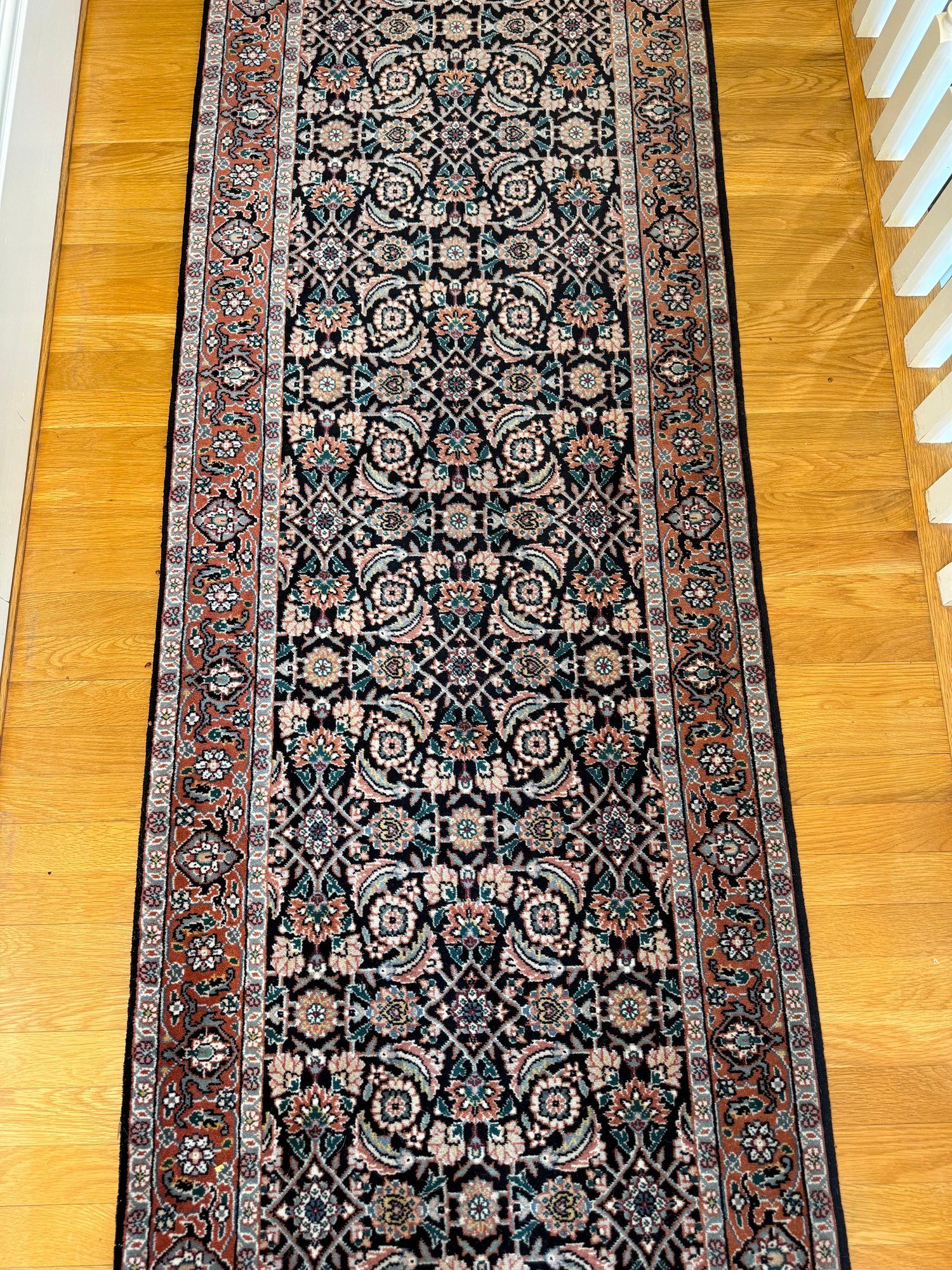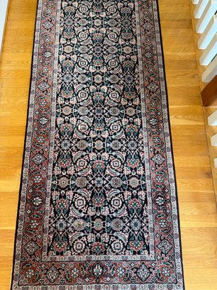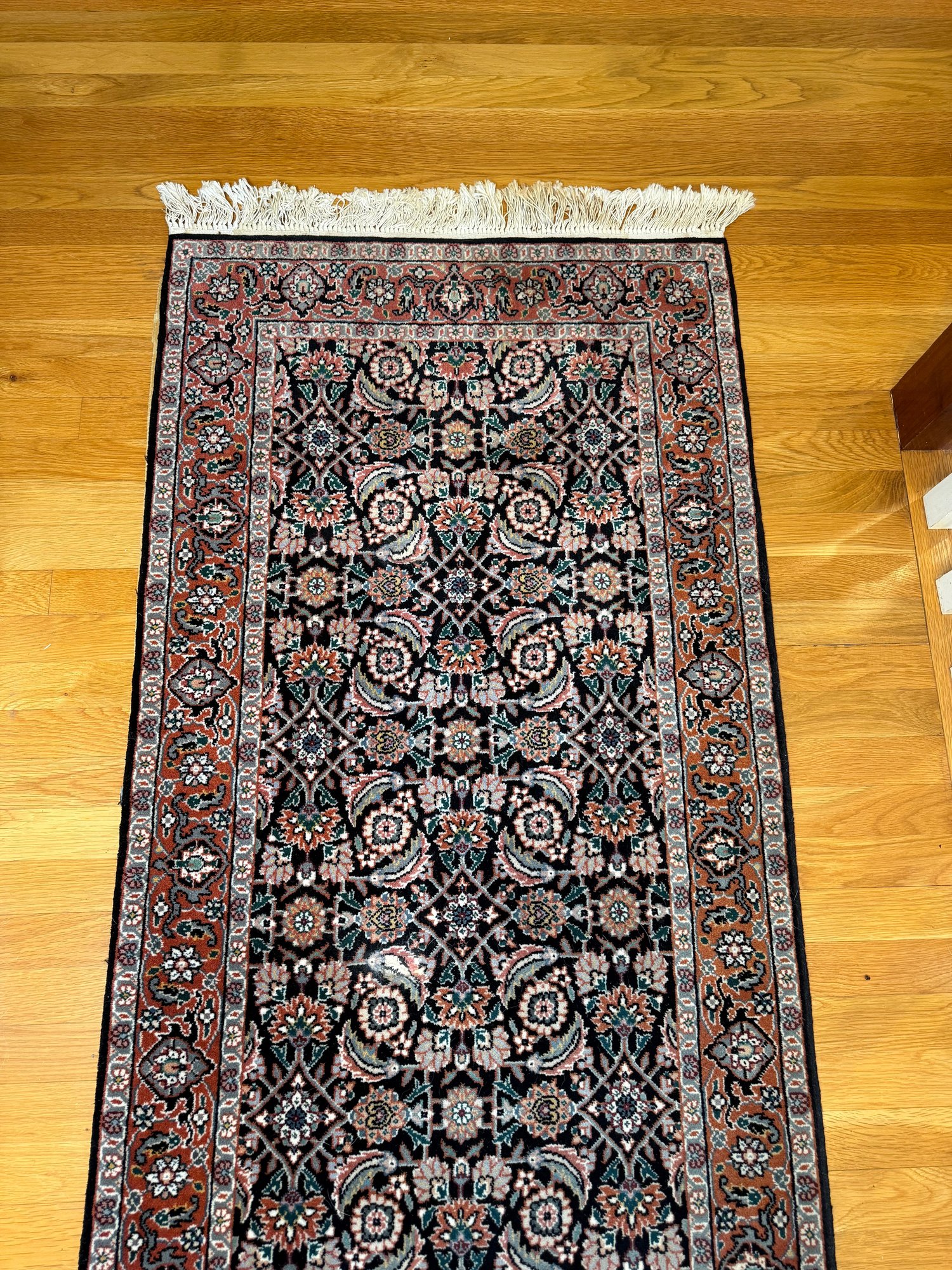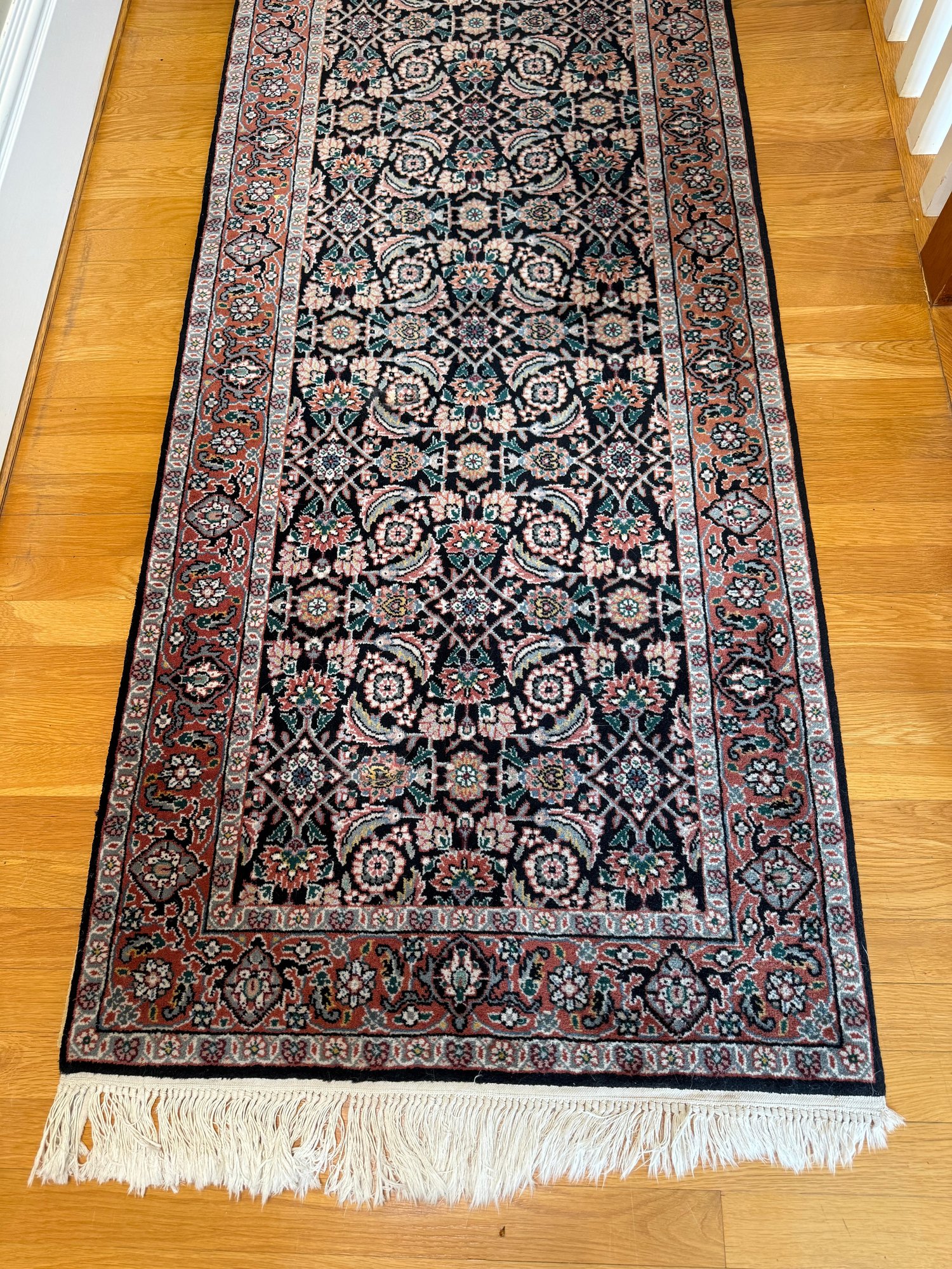 A finely detailed hand-knotted wool runner featuring an elegant allover floral design set against a dark field, framed by coordinated rust-toned borders. The intricate pattern and classic color palette make this piece well suited for hallways, entryways, or stair landings.