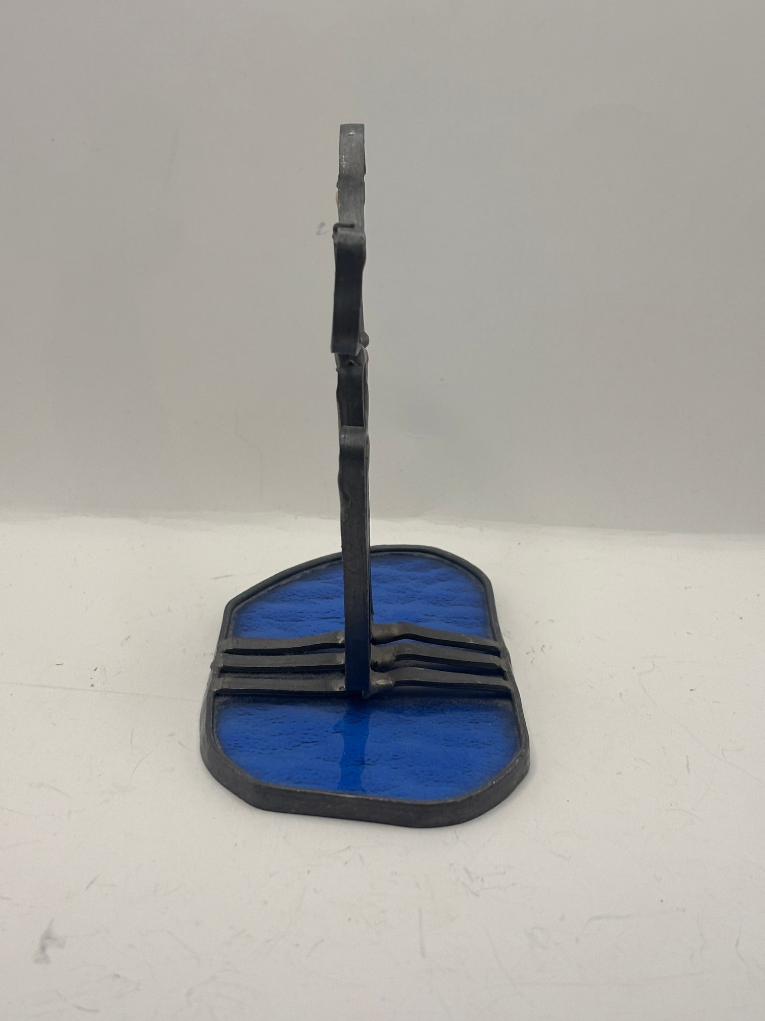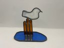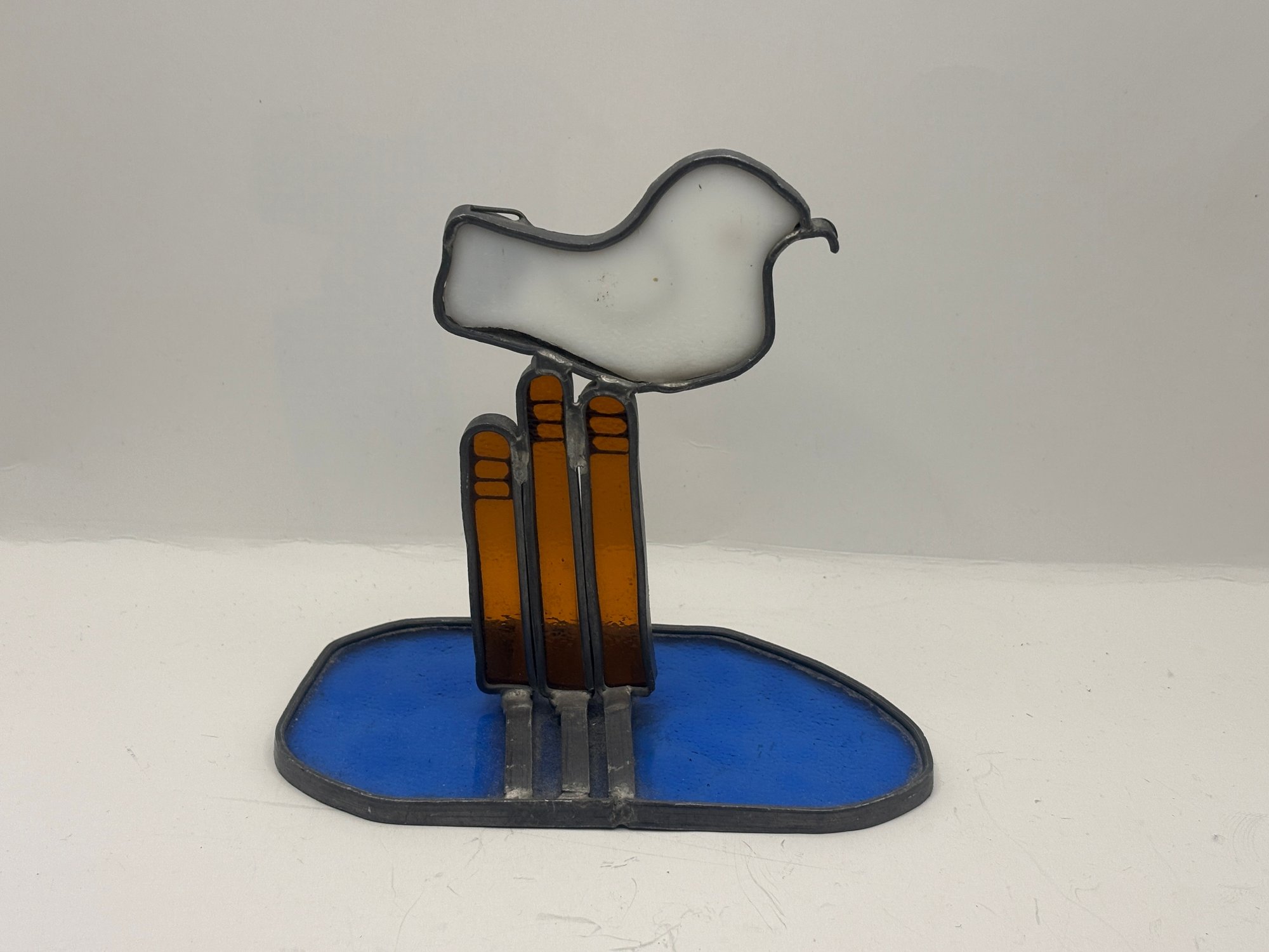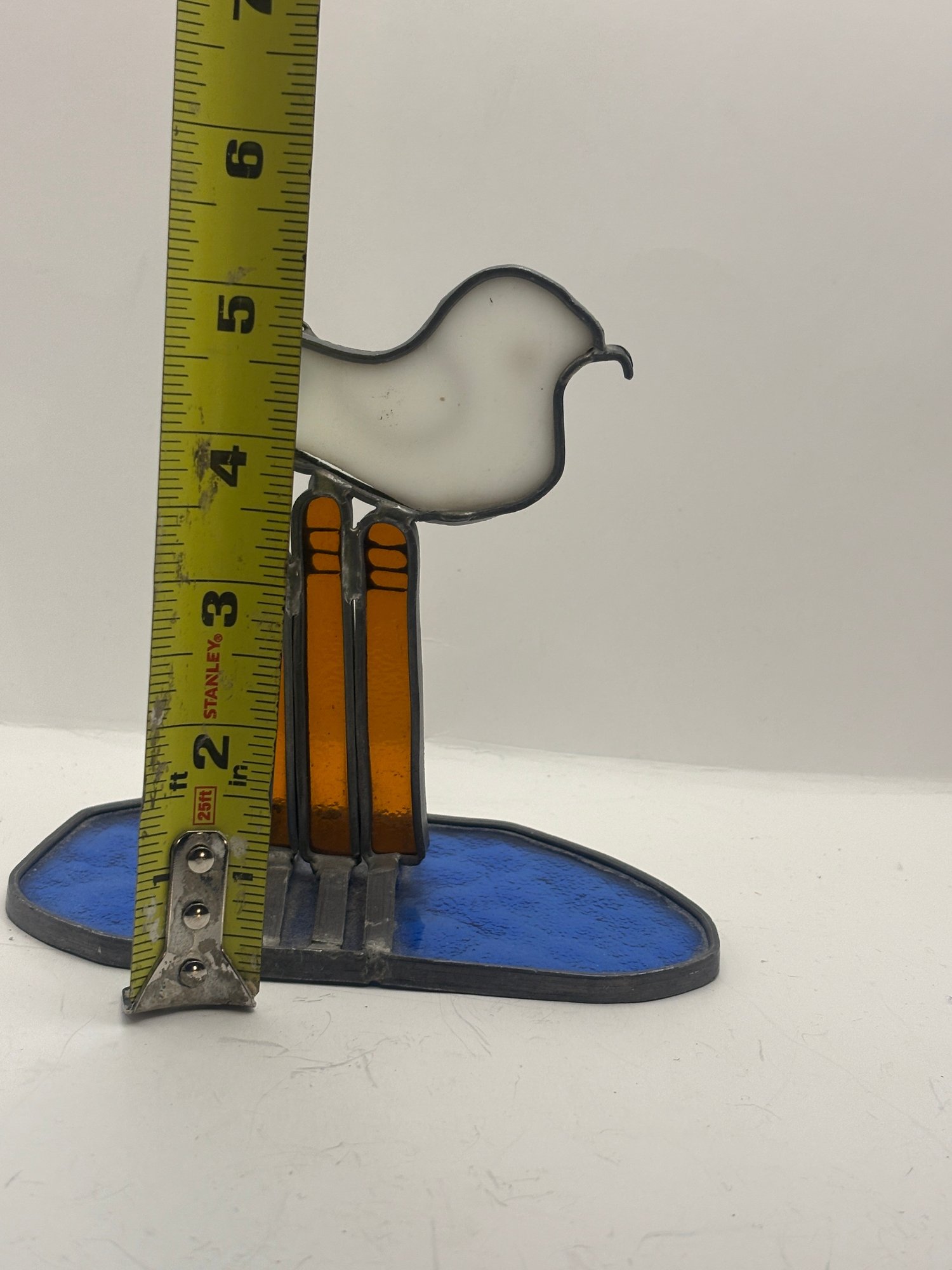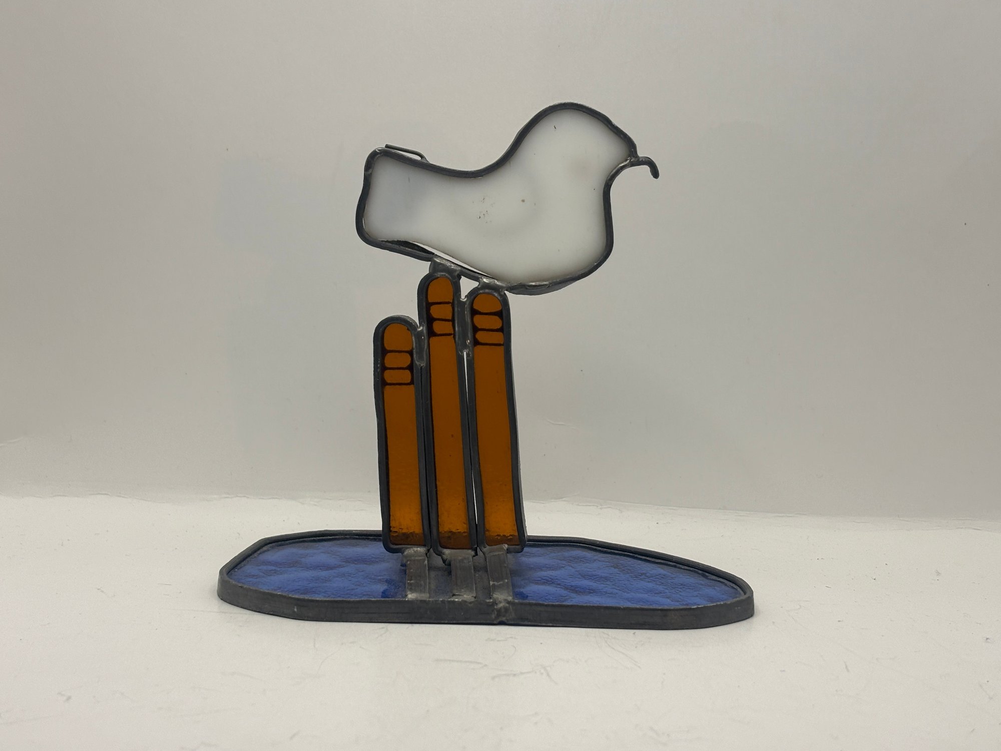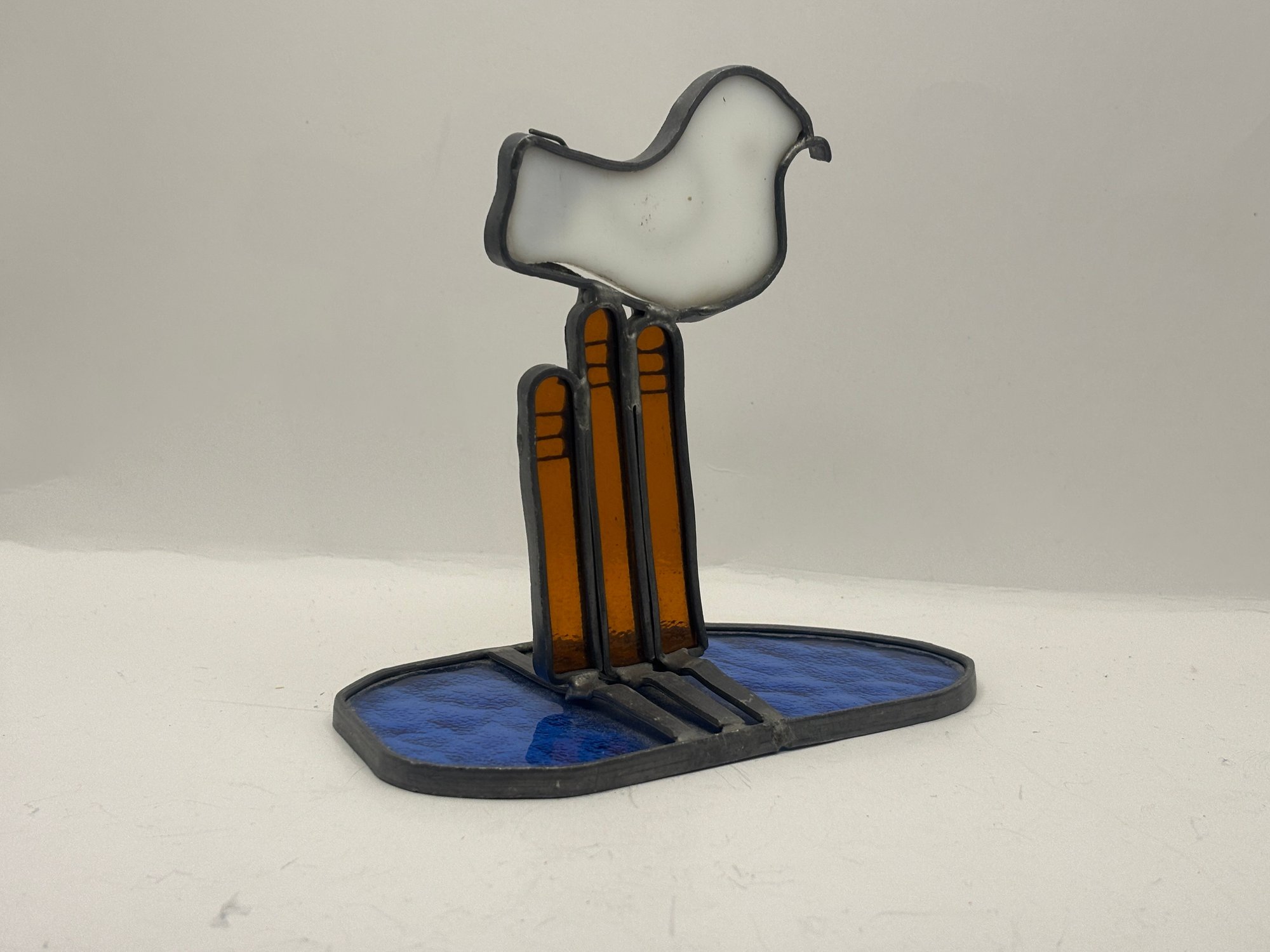 This small stained glass sculpture features a simplified white bird perched atop three vertical amber panels, all framed in dark lead came and resting on a deep cobalt blue glass base. The lines are clean and graphic — almost Bauhaus-meets-backyard — with the bird reduced to a smooth silhouette and subtle beak curve.