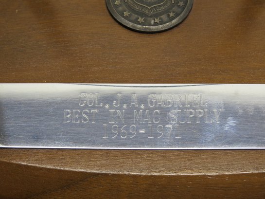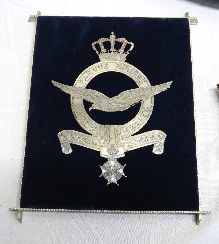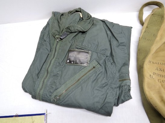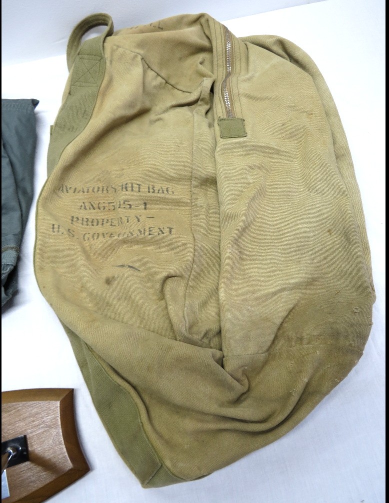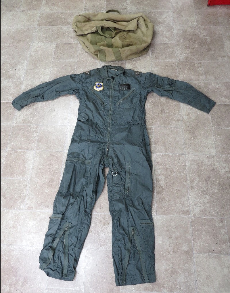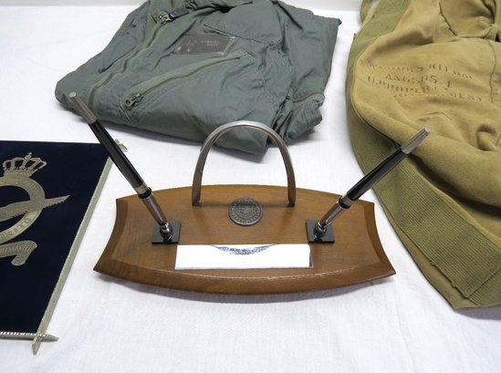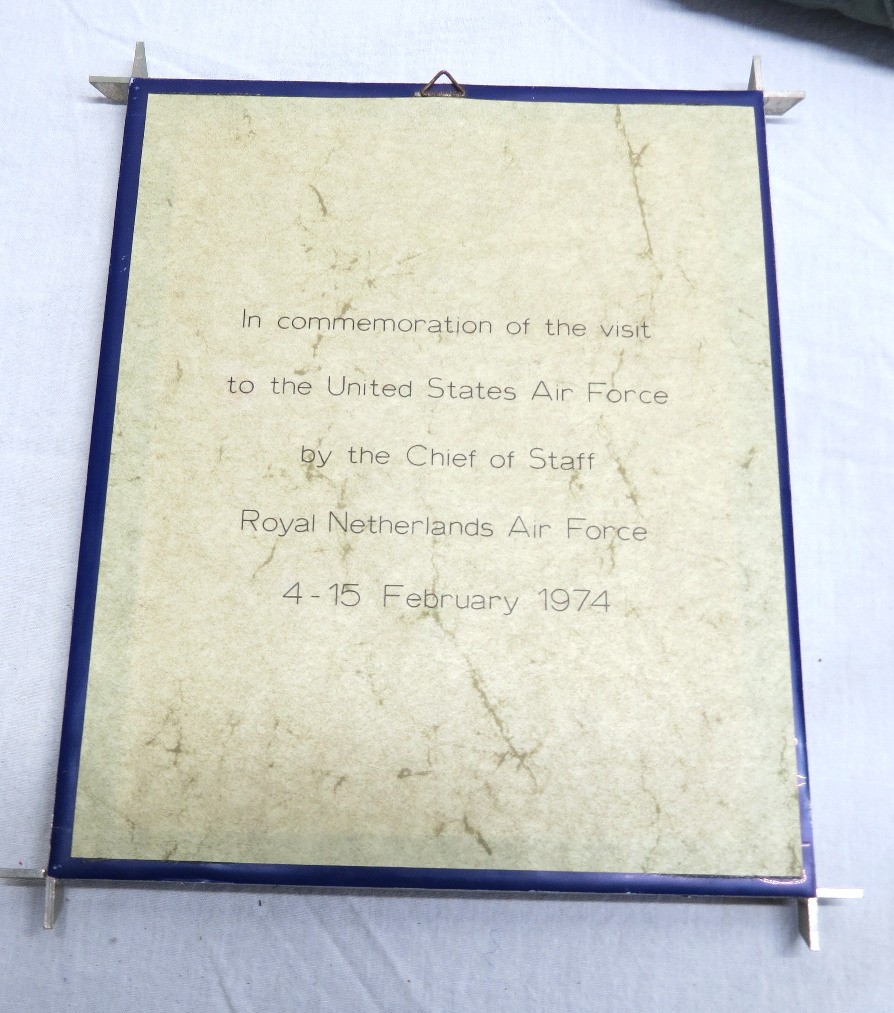 Our consignor's father served in the US Air Force in Europe post-WWII, throughout the cold war era. Rising to the rank of Colonel before retirement, these are a a few of his things, including his flight suit and parachute or kit bag, plus a plaque commemorating a visit from Chief of Staff from the Royal Netherlands Air Force in 1974, and a desk pen set.
