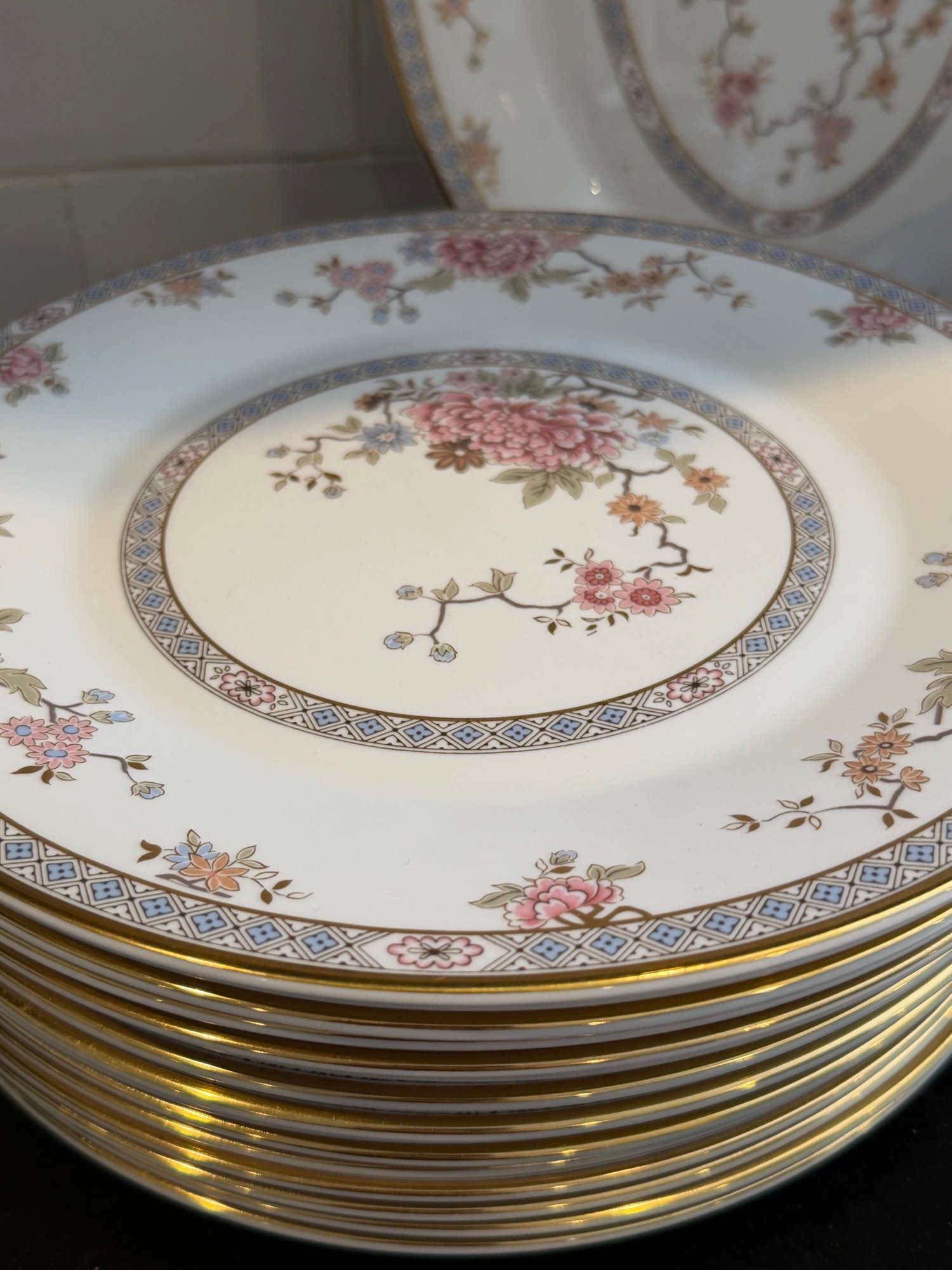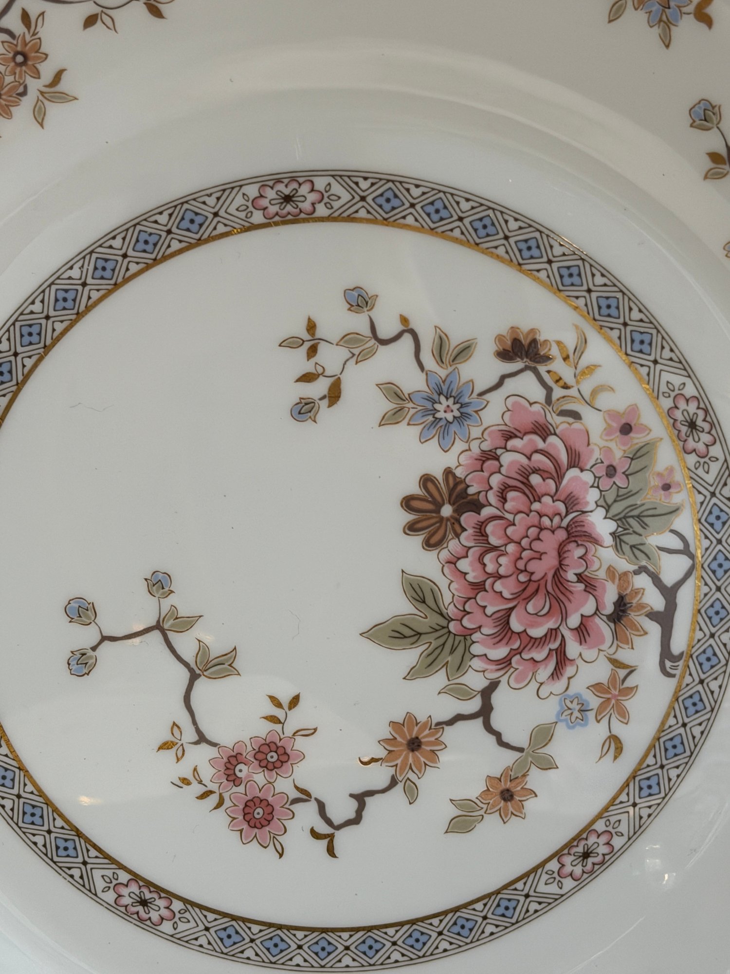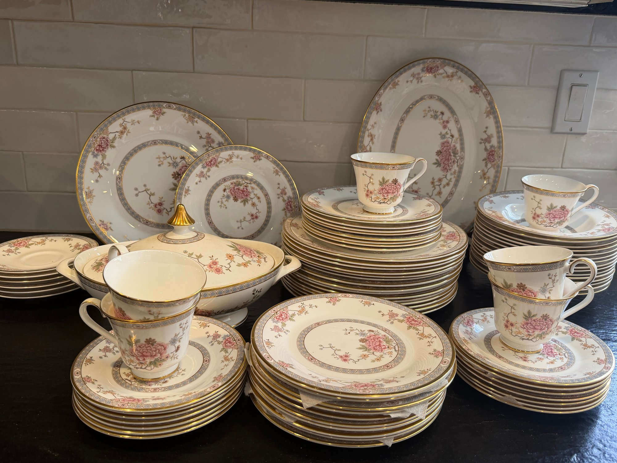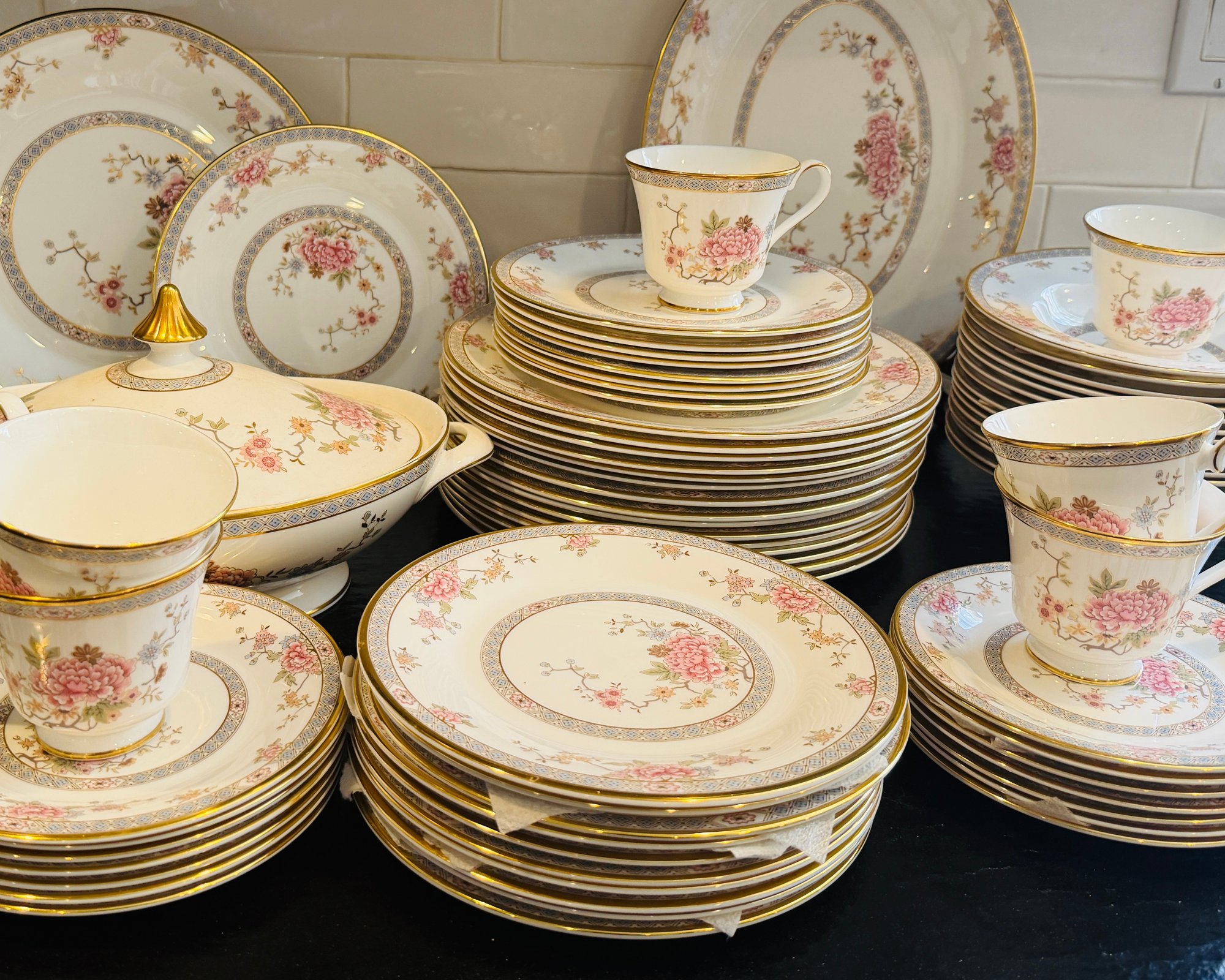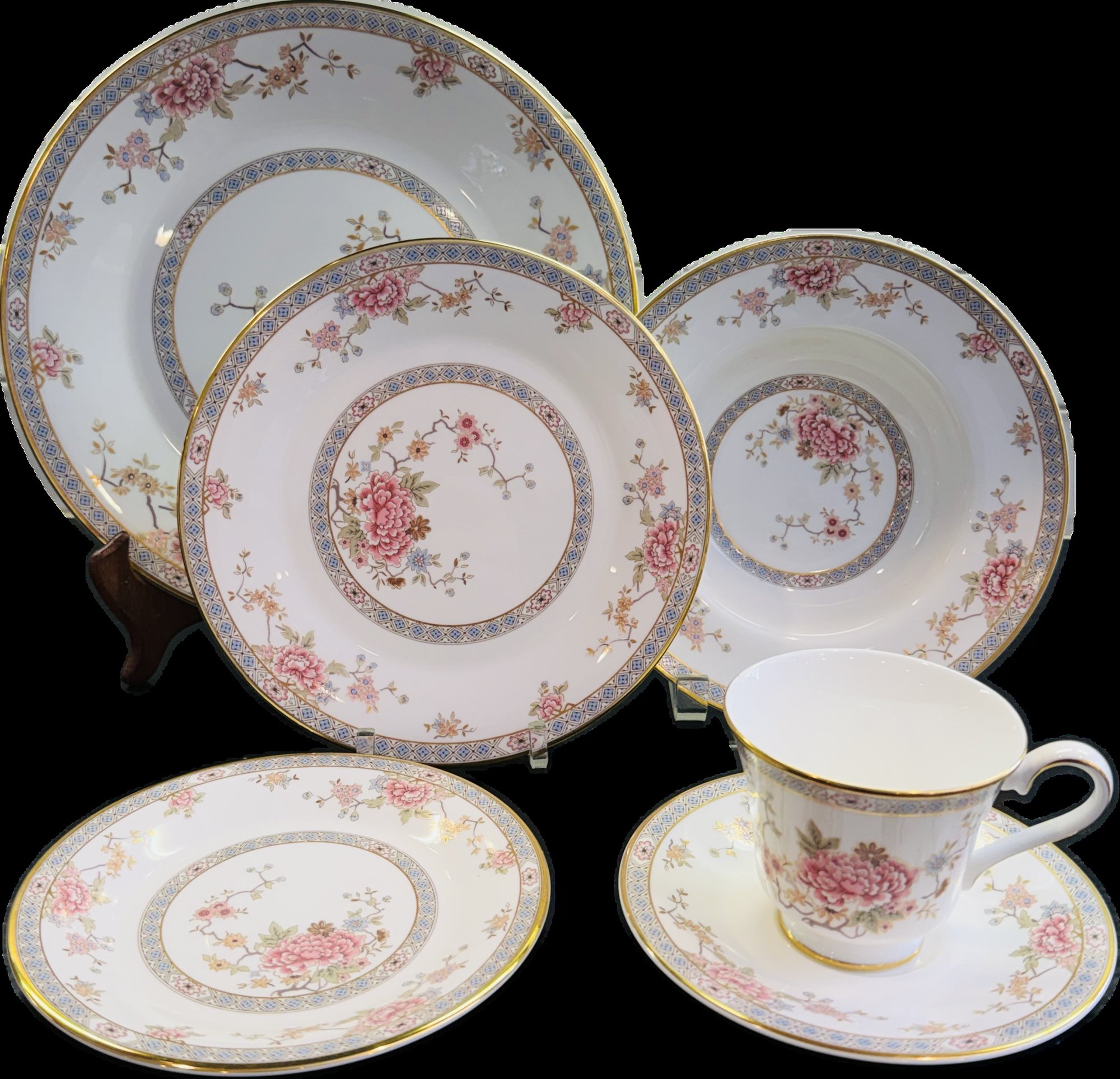 This elegant Royal Doulton “Canton” service for 15, showcases a refined floral motif in soft pinks, blues, and greens, framed by a delicate geometric border and finished with a subtle gold rim. Crafted in England in fine bone china.