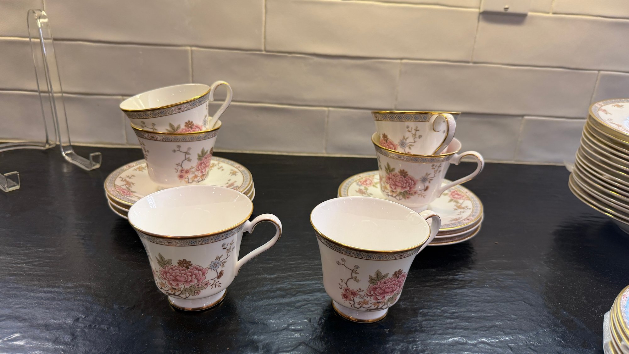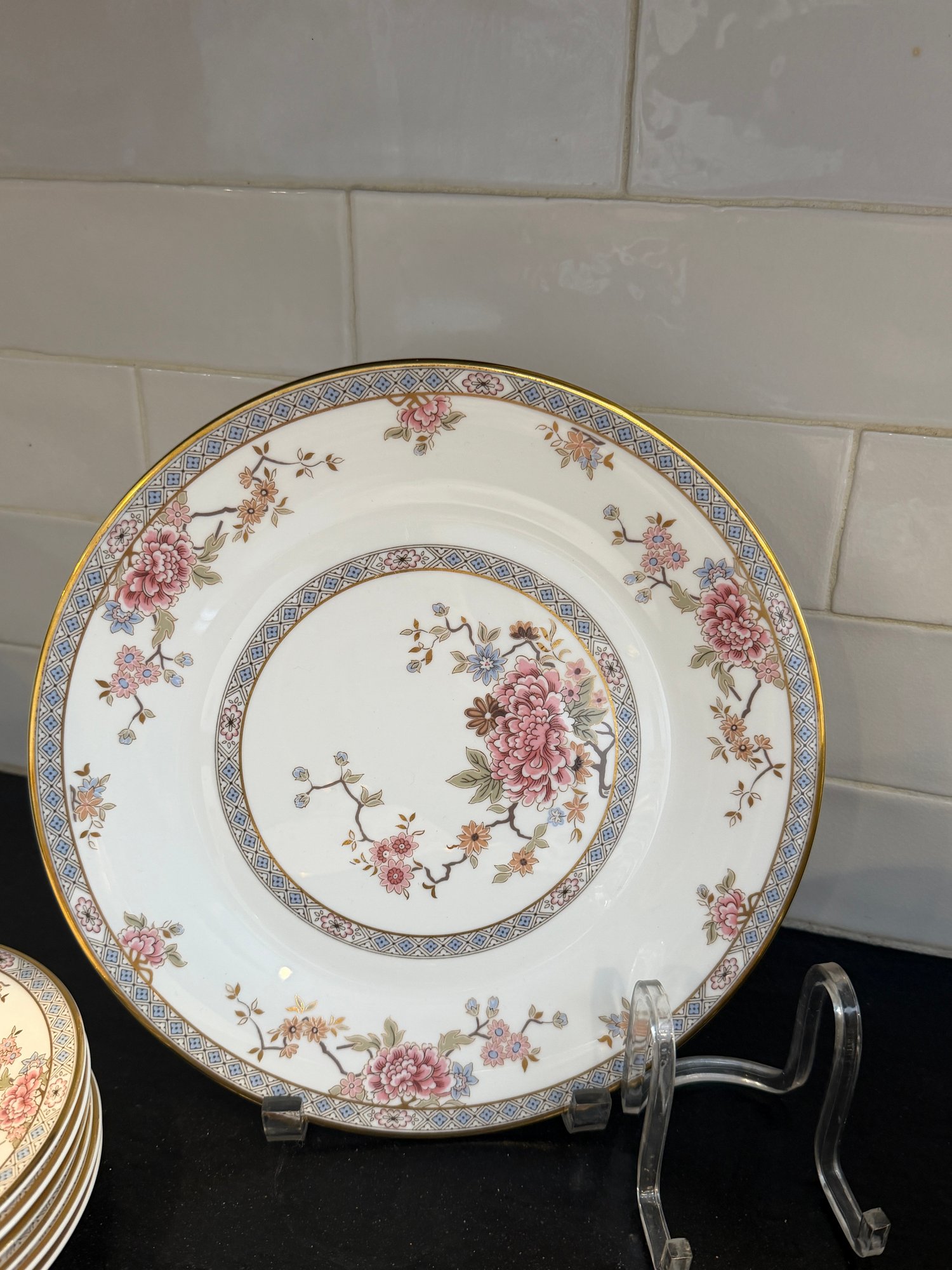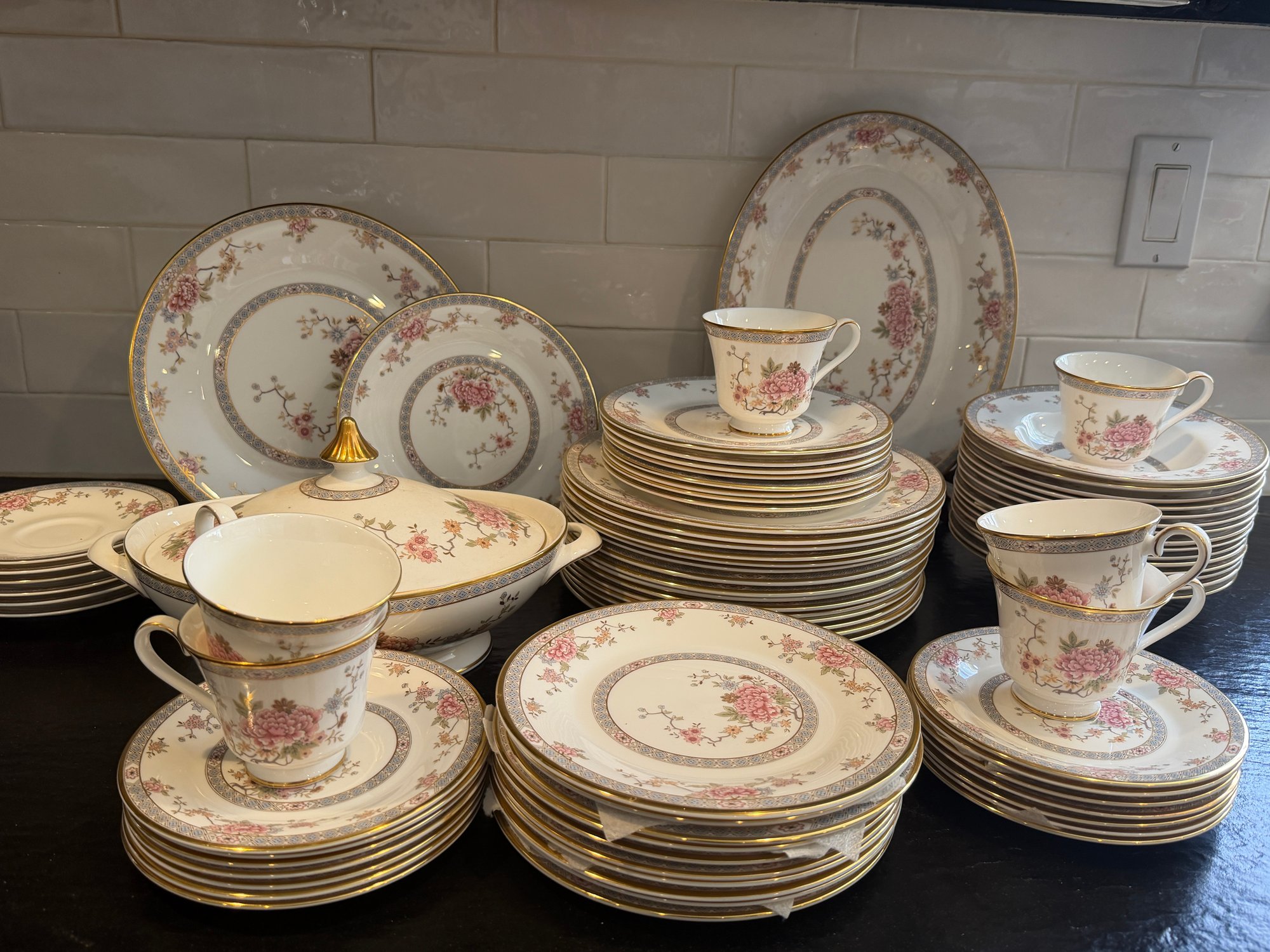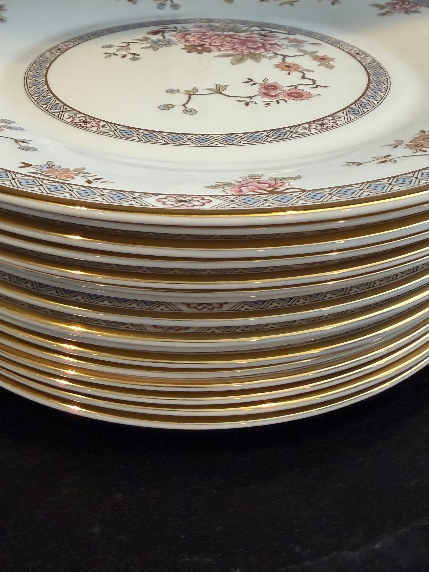 This elegant Royal Doulton “Canton” service for 15, showcases a refined floral motif in soft pinks, blues, and greens, framed by a delicate geometric border and finished with a subtle gold rim. Crafted in England in fine bone china.