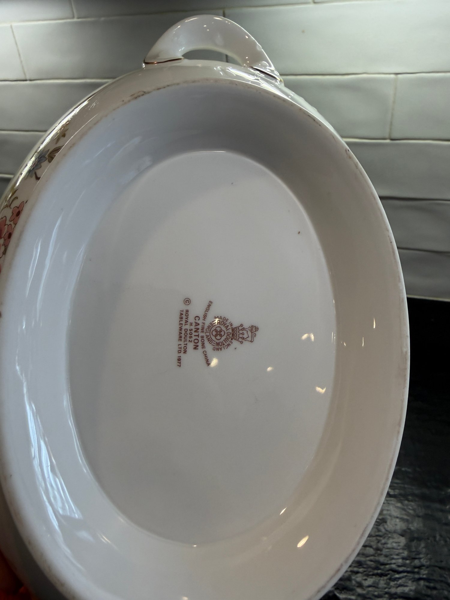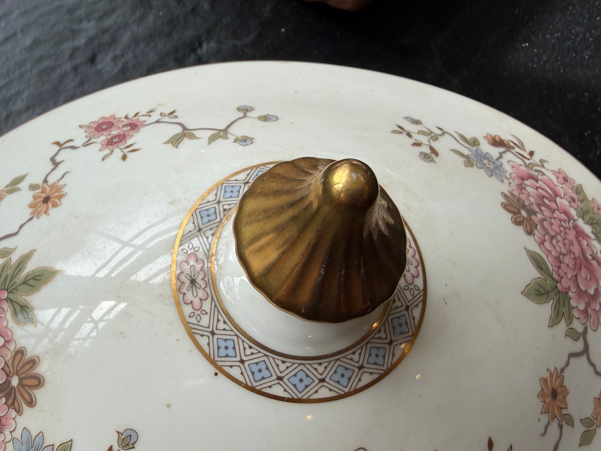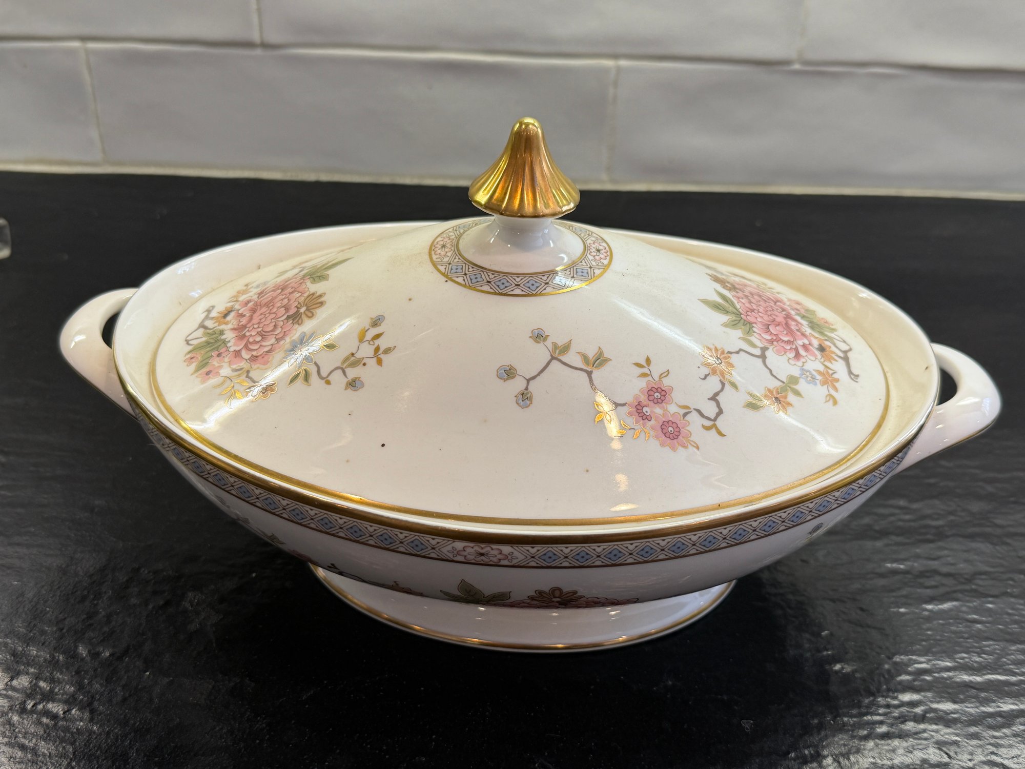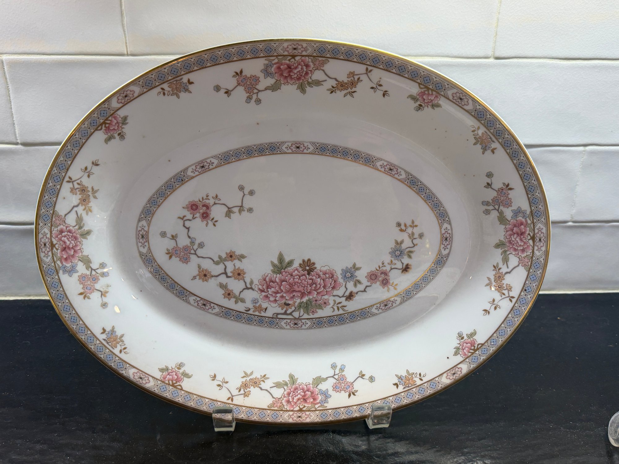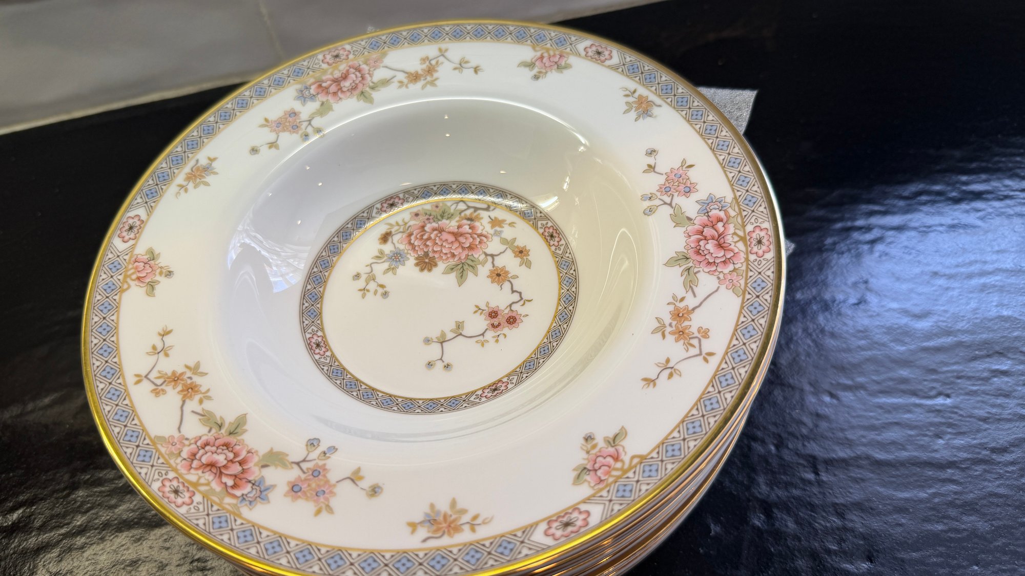 This elegant Royal Doulton “Canton” service for 15, showcases a refined floral motif in soft pinks, blues, and greens, framed by a delicate geometric border and finished with a subtle gold rim. Crafted in England in fine bone china.